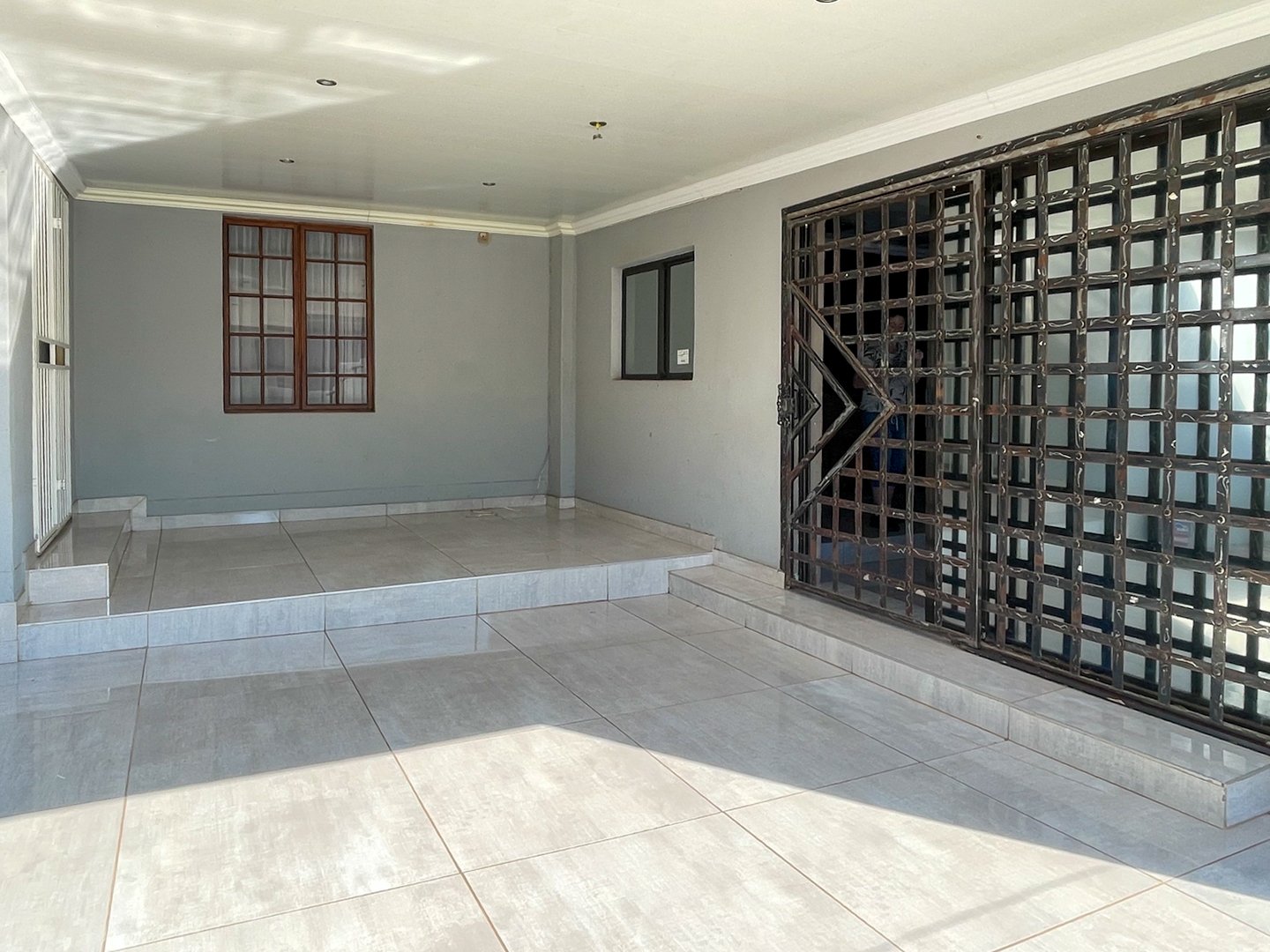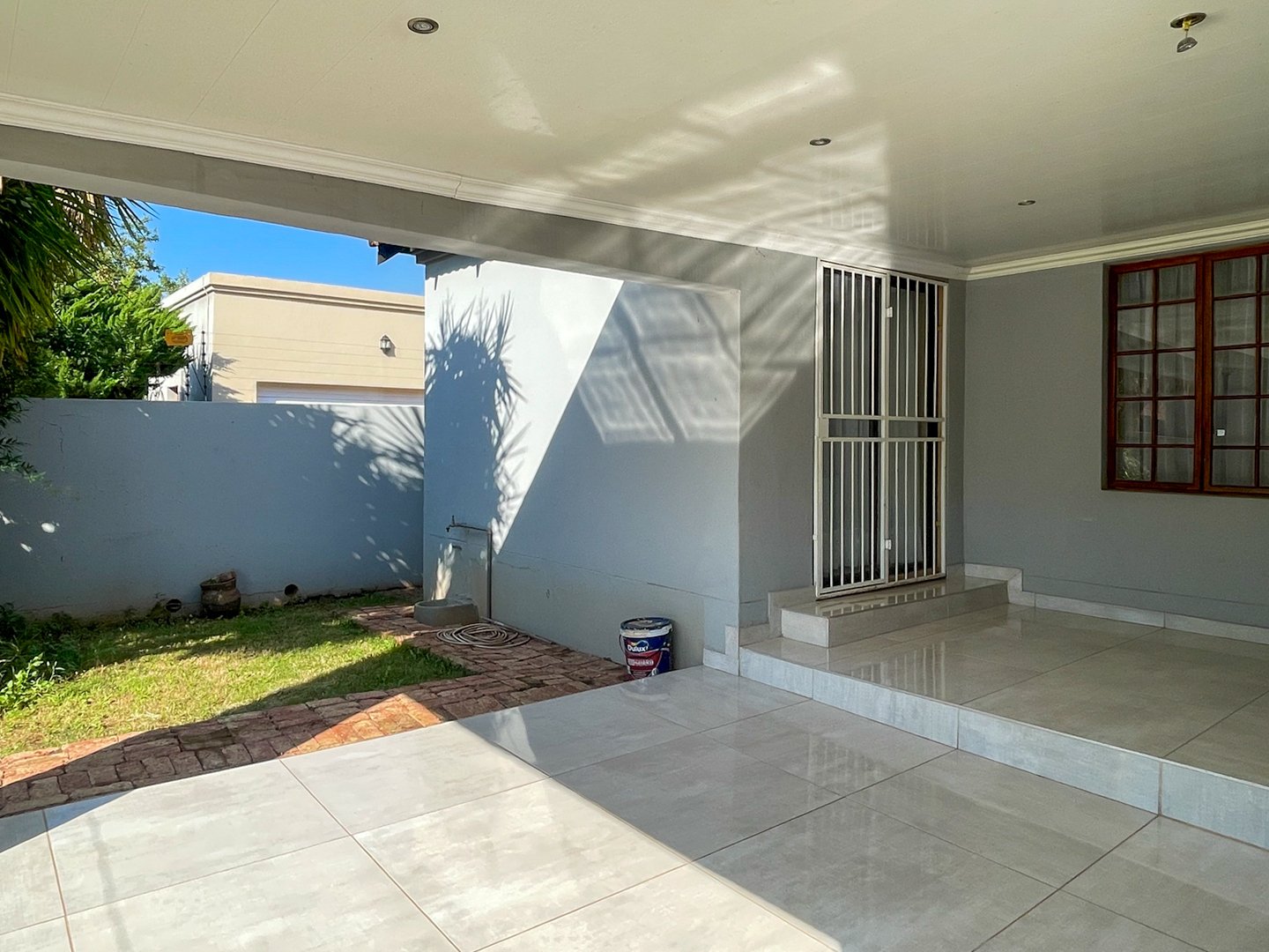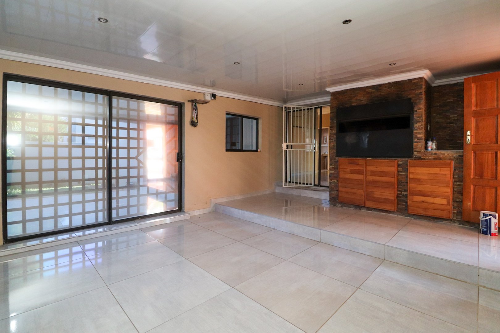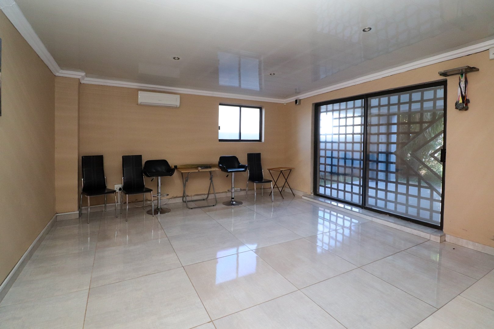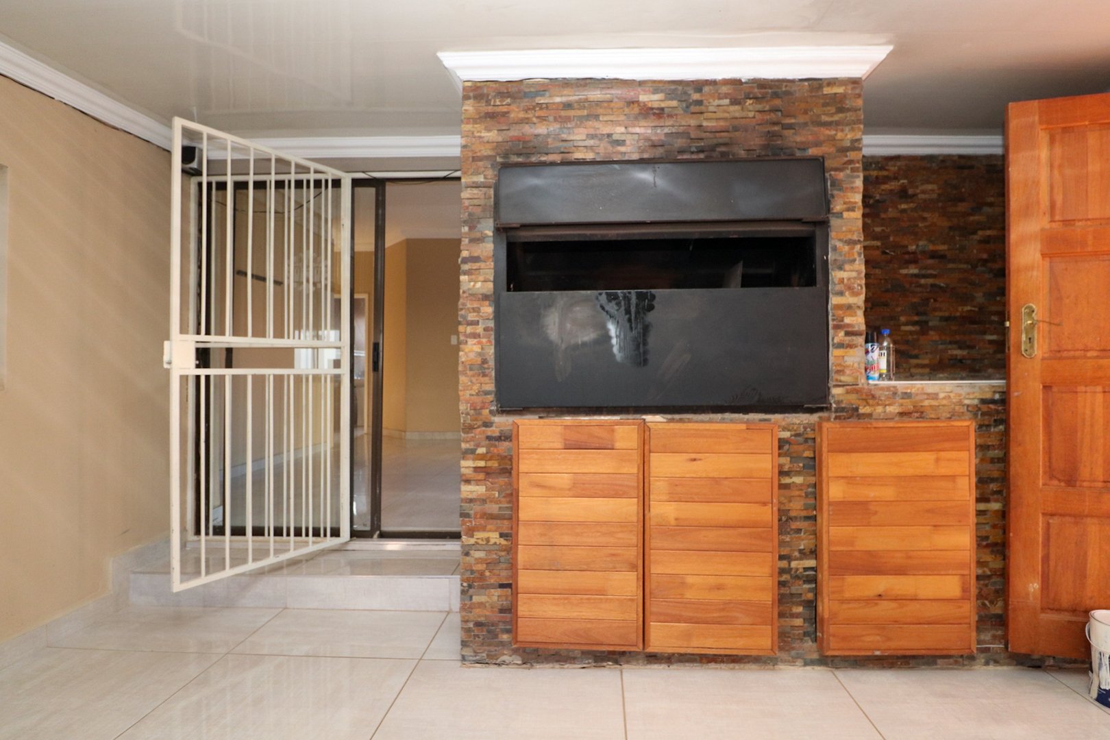 An entertainment room with built-in-braai & sliding door that open onto a small veranda & private garden.
