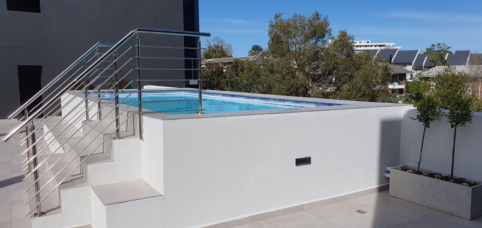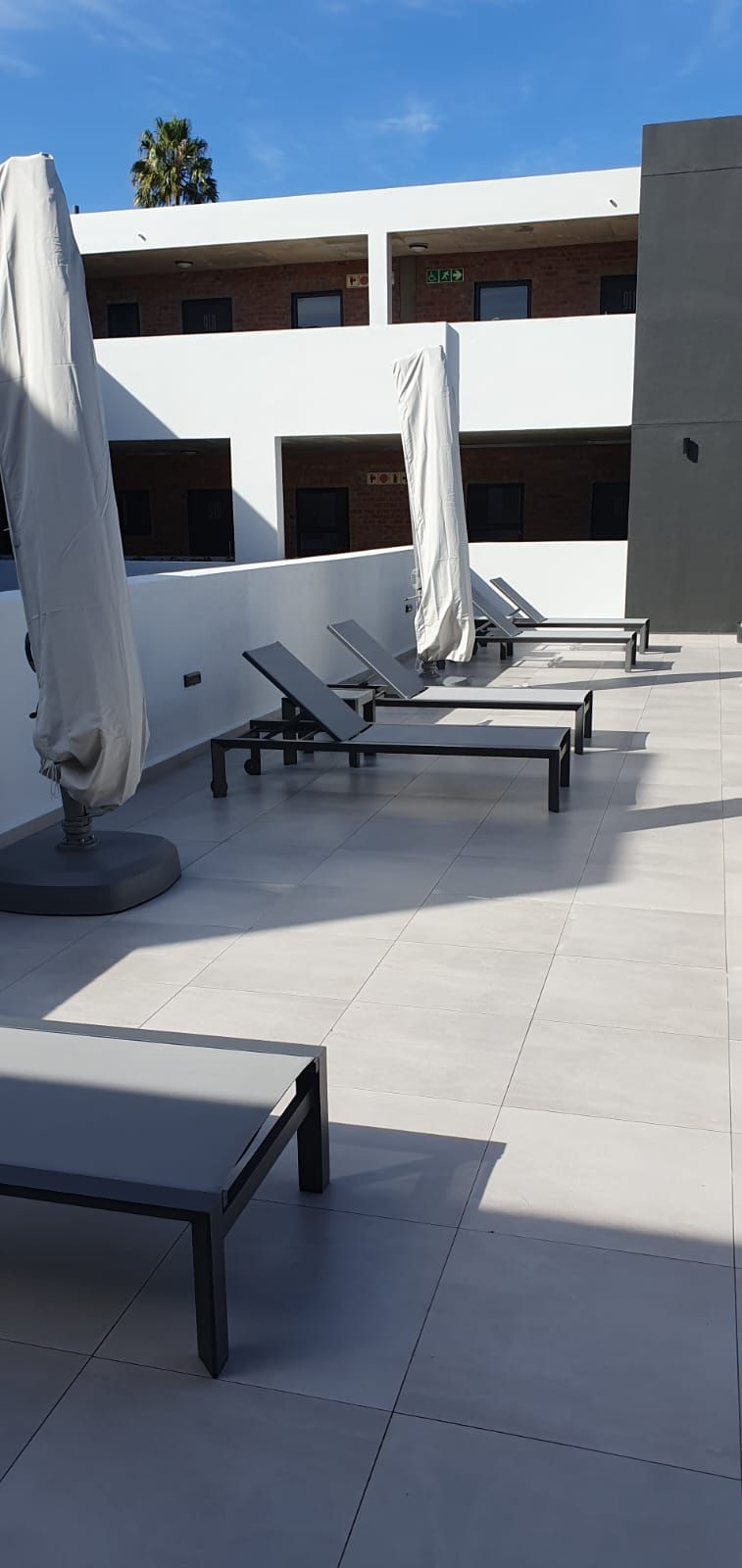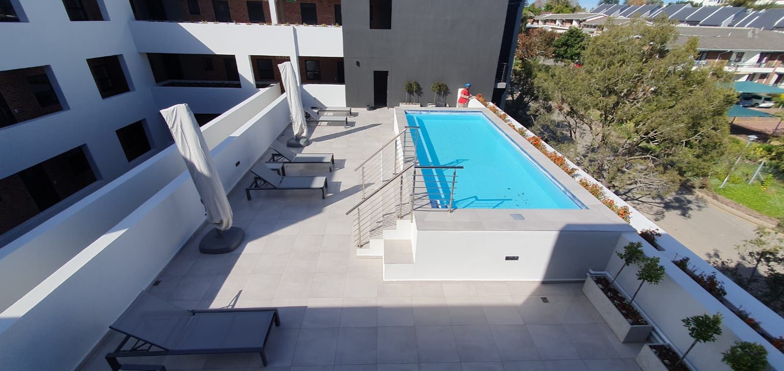 Beyond the individual unit, the building offers an unparalleled lifestyle experience characterized by convenience and leisure. Residents enjoy exclusive access to a spectacular communal rooftop swimming pool, providing panoramic views of the Outeniqua Mountains and an ideal setting for sundowners or relaxation.