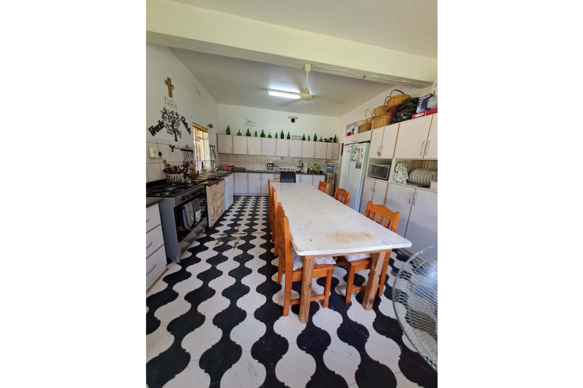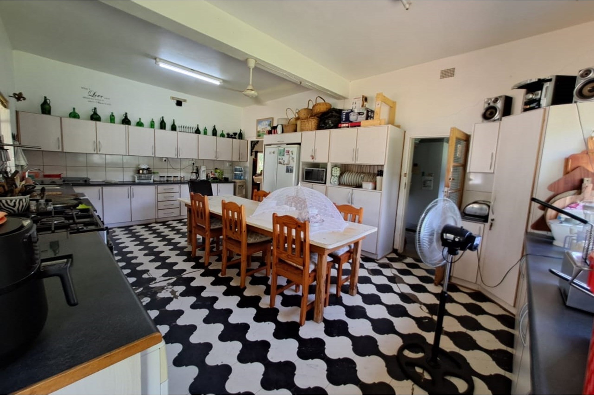 Well-appointed kitchen with built-in cupboards, a gas stove, and a dedicated cold storage area for meat