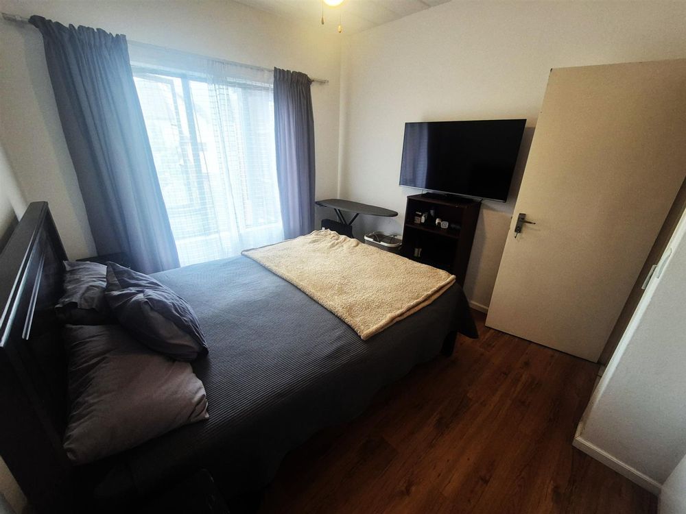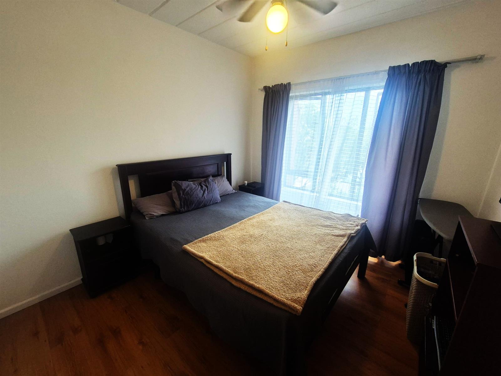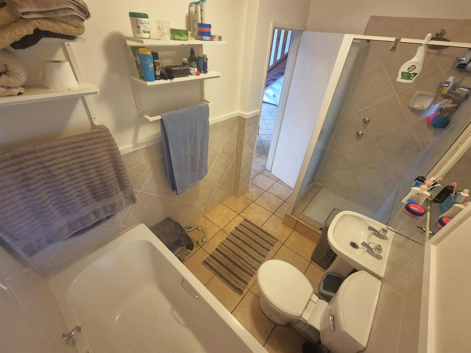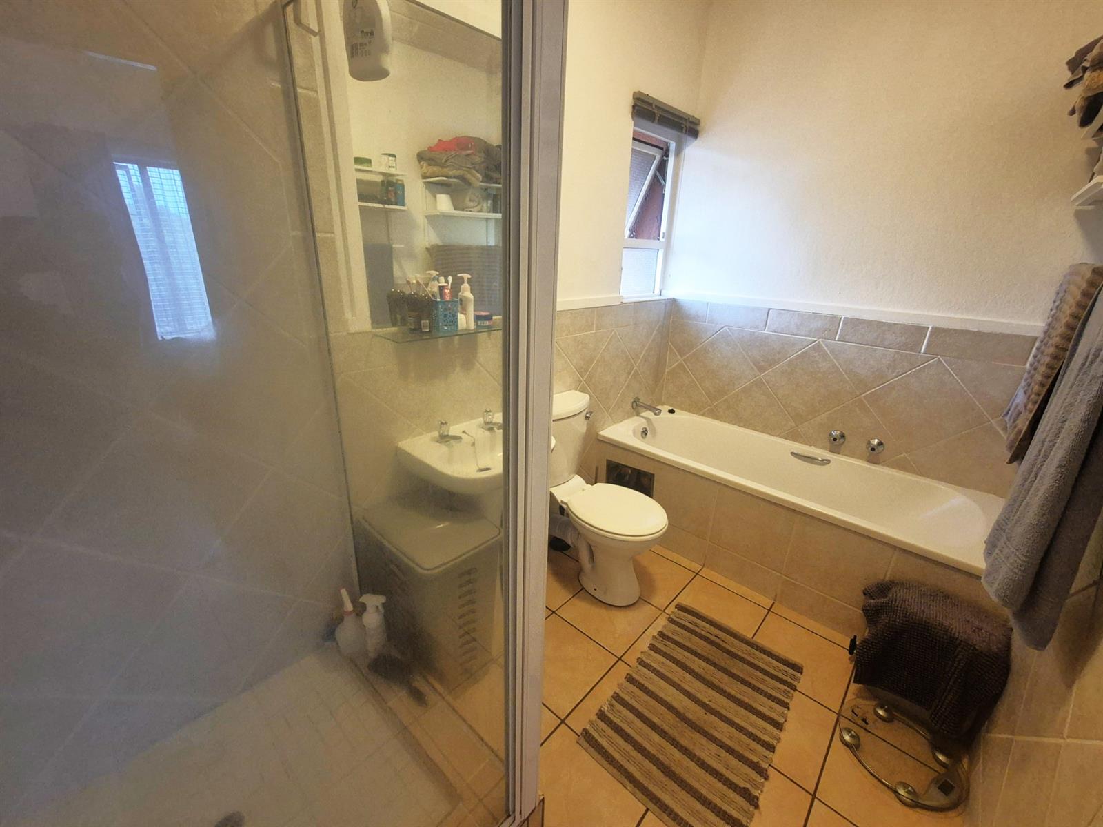 One bedroom fitted with laminated floors, blinds and a ceiling fan. A full fashionable bathroom – separate shower and bath.