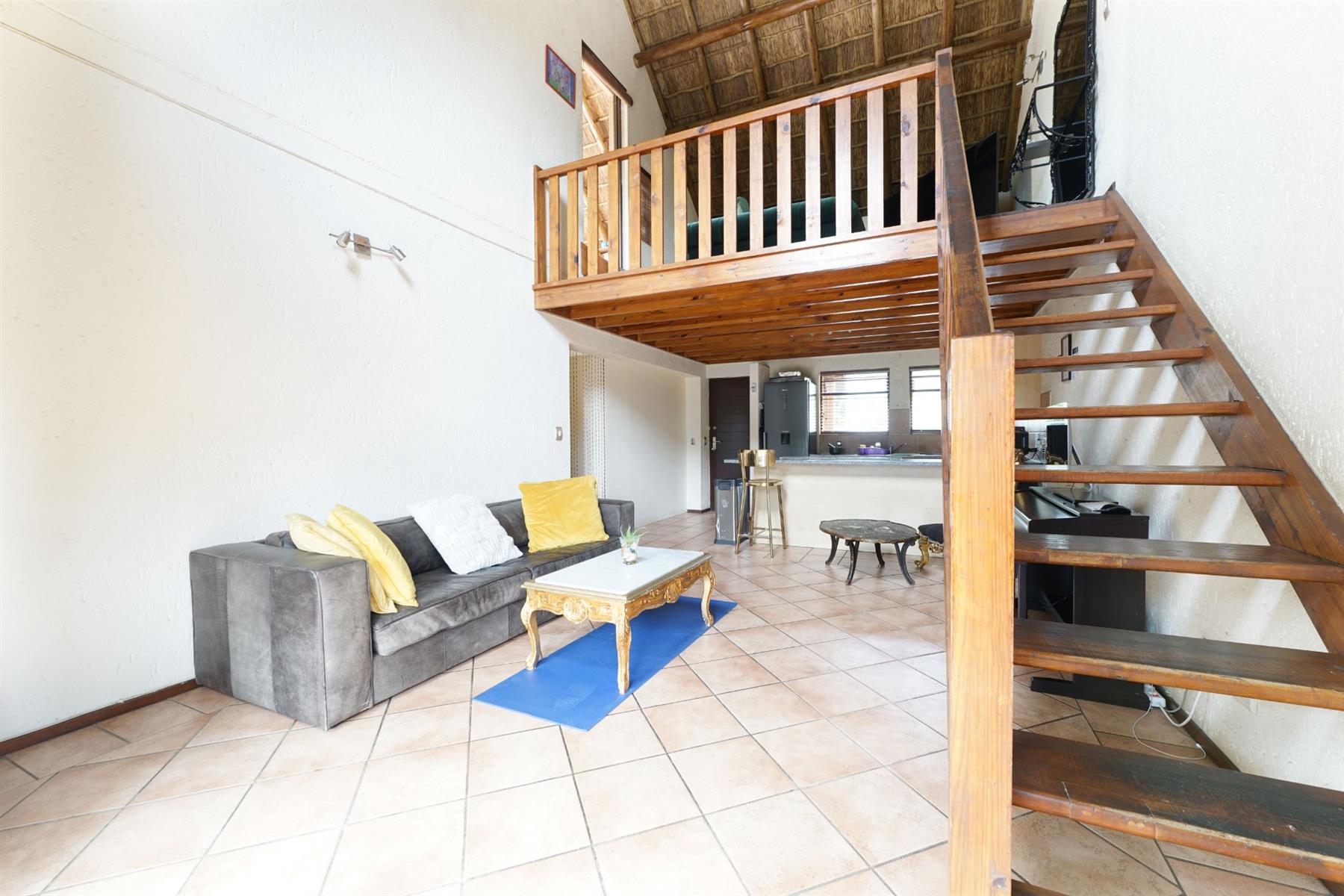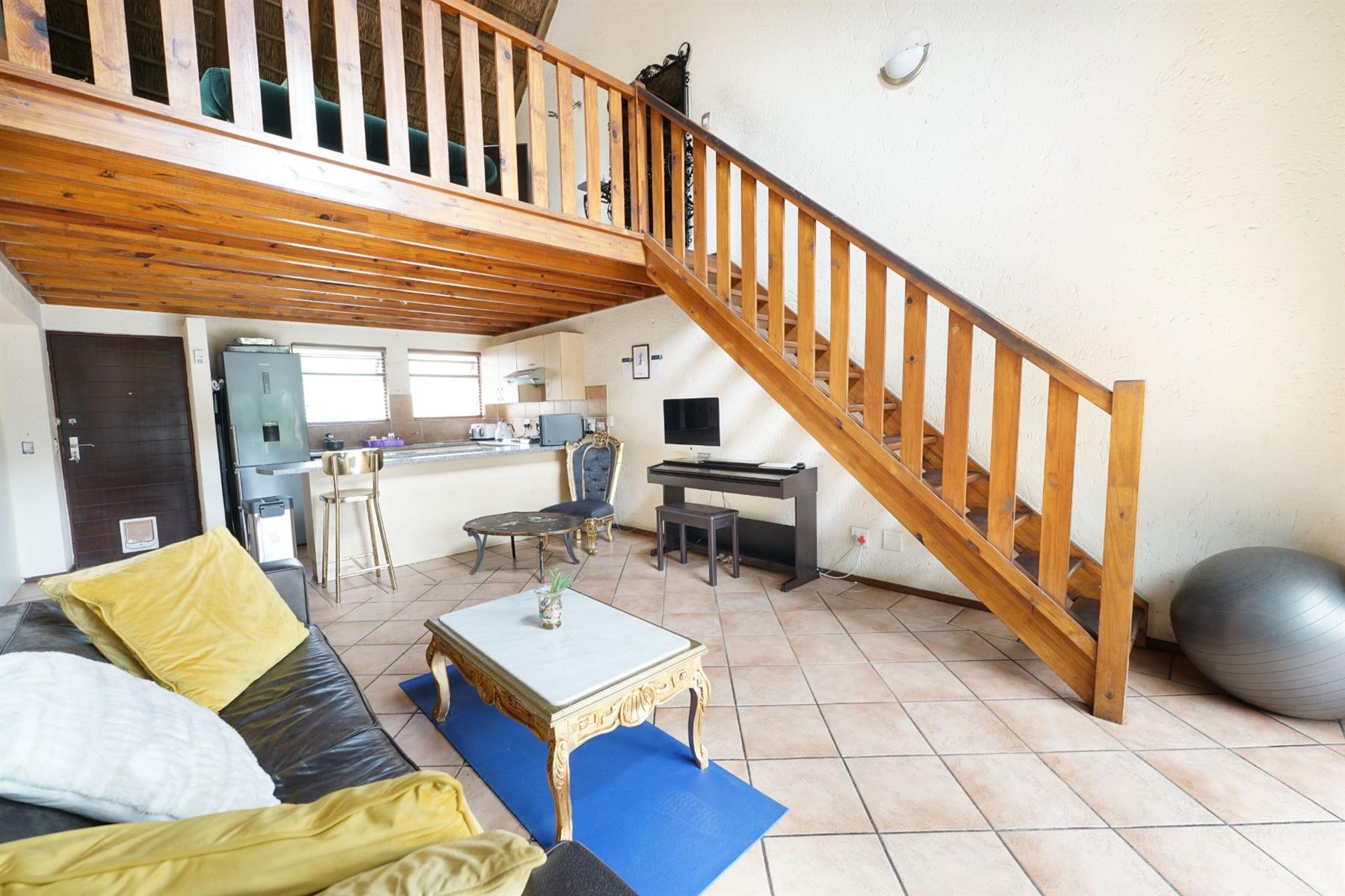 The apartment is tiled throughout, with warm wooden flooring in the loft, adding character and contrast. Additional conveniences include two covered parking bays.