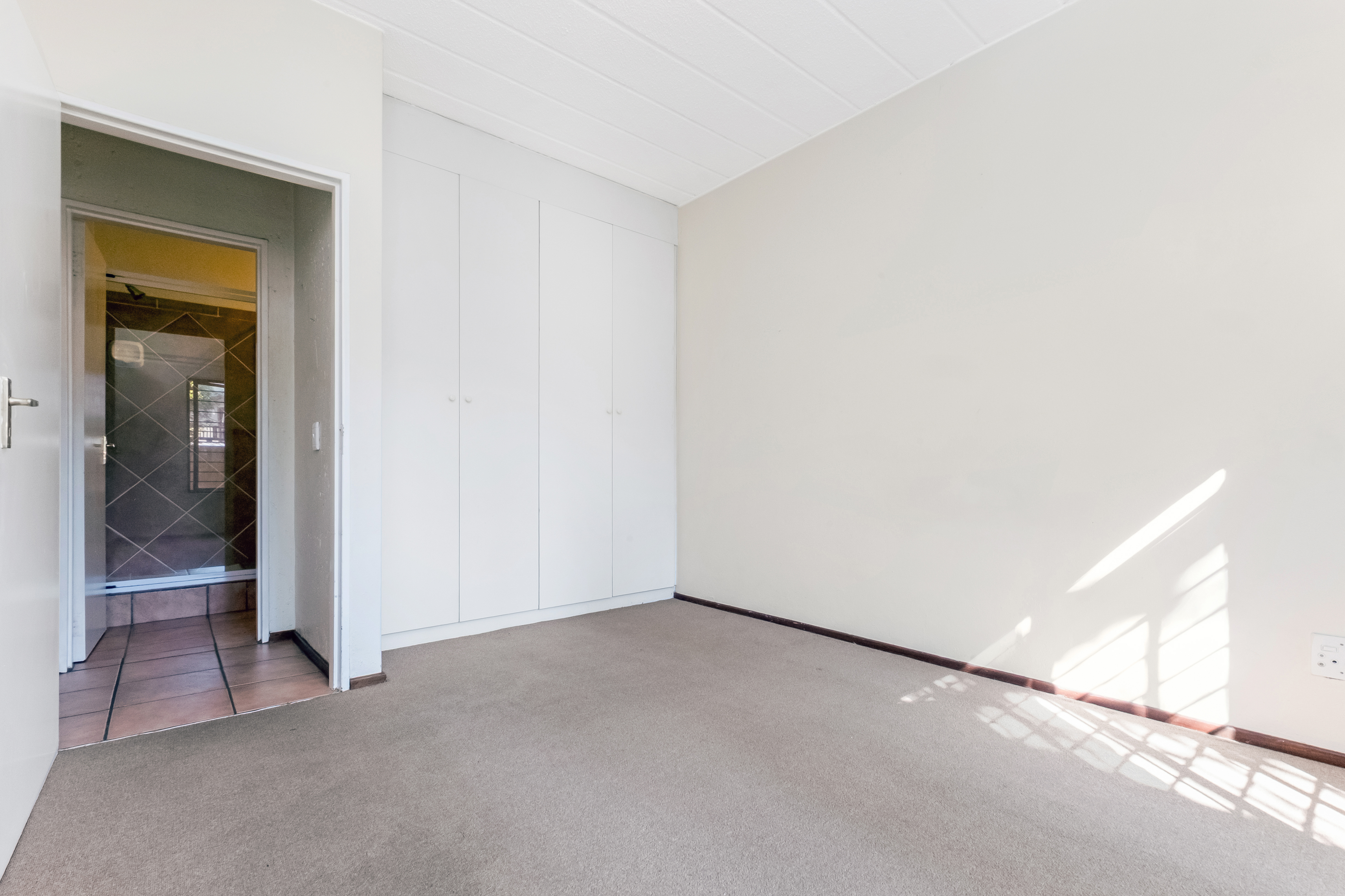 The bedroom is spacious and fitted with built-in cupboards and carpets. It overlooks your beautiful, private garden.