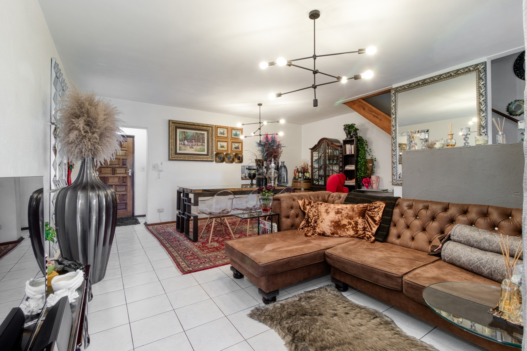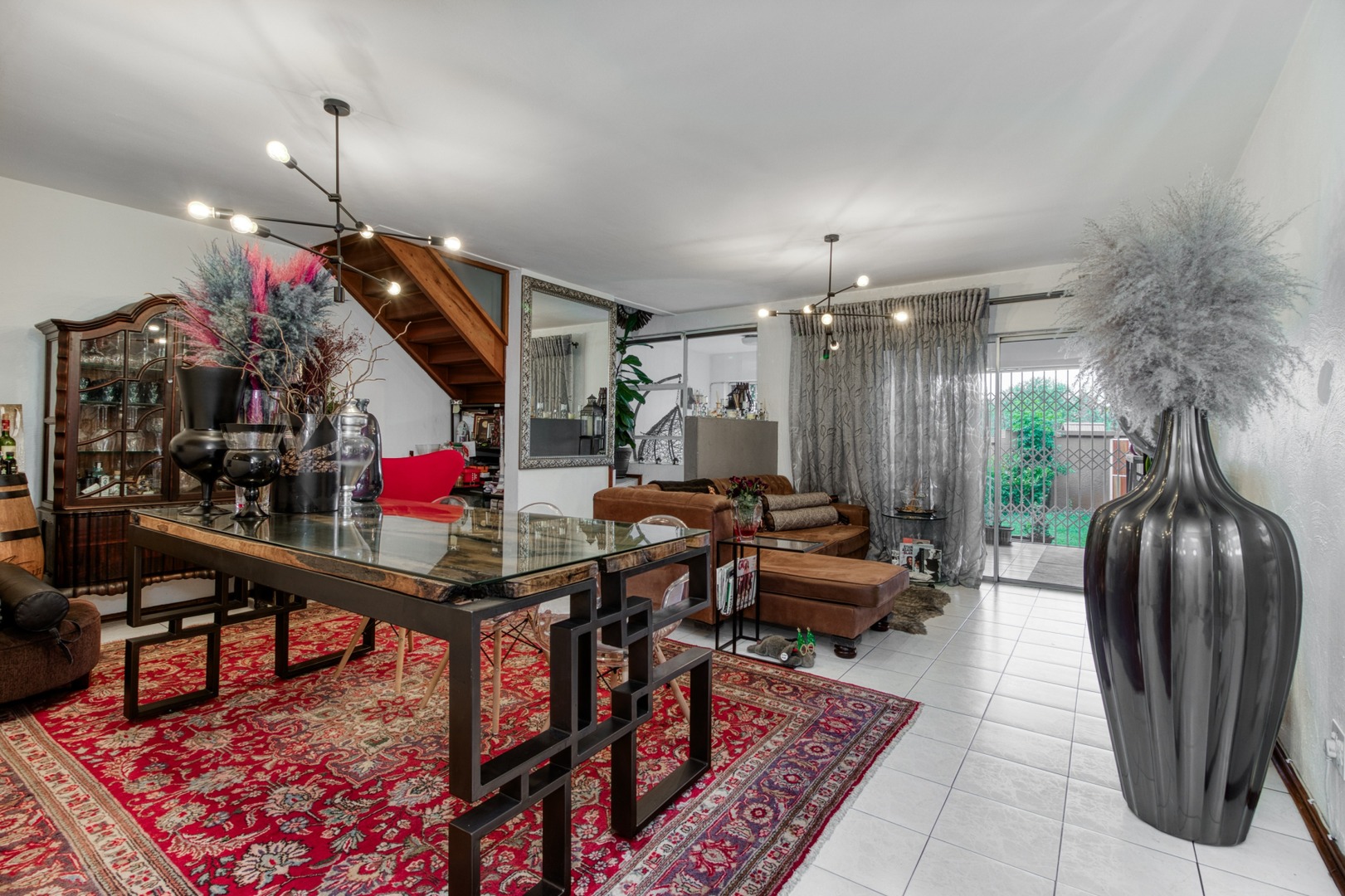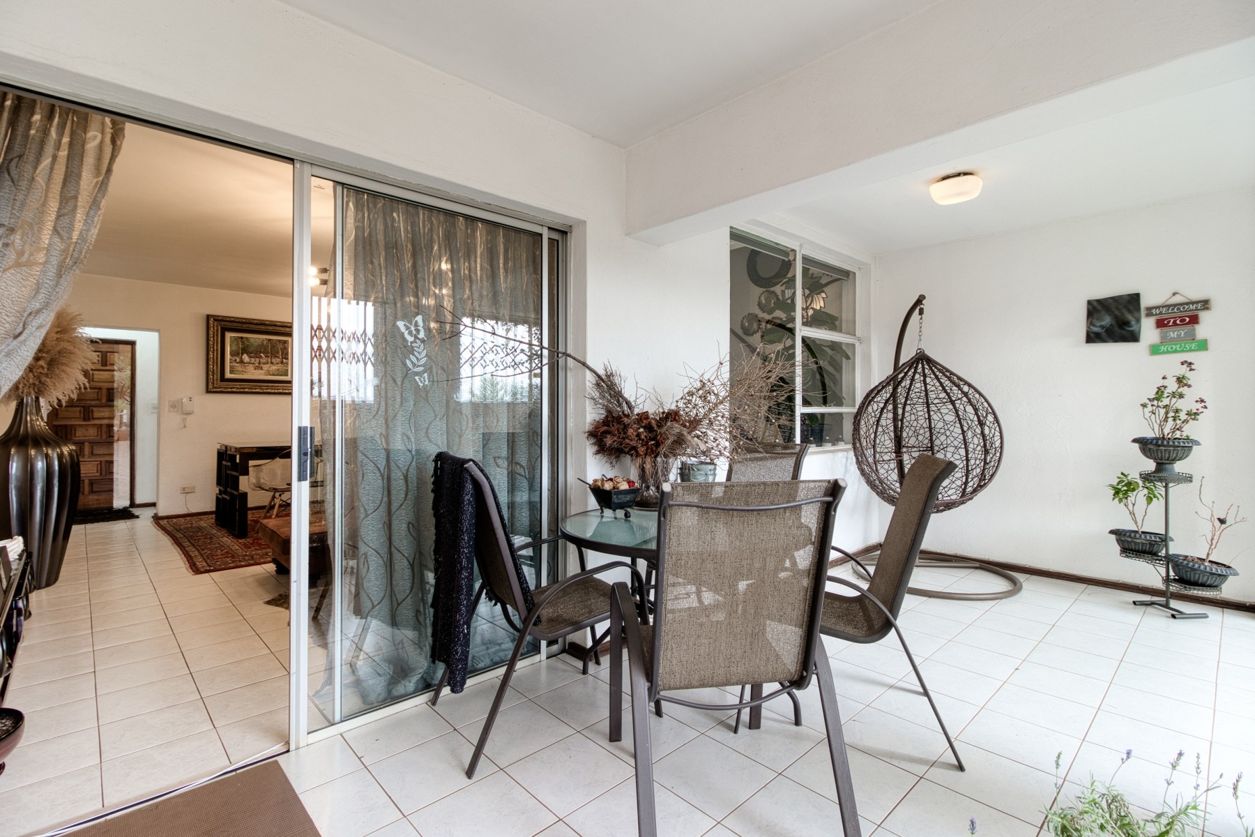 The living room seamlessly transitions to a covered enclosed patio, which serves as an inviting sunroom or dining area. The ground floor is tastefully adorned with exquisite tiling.