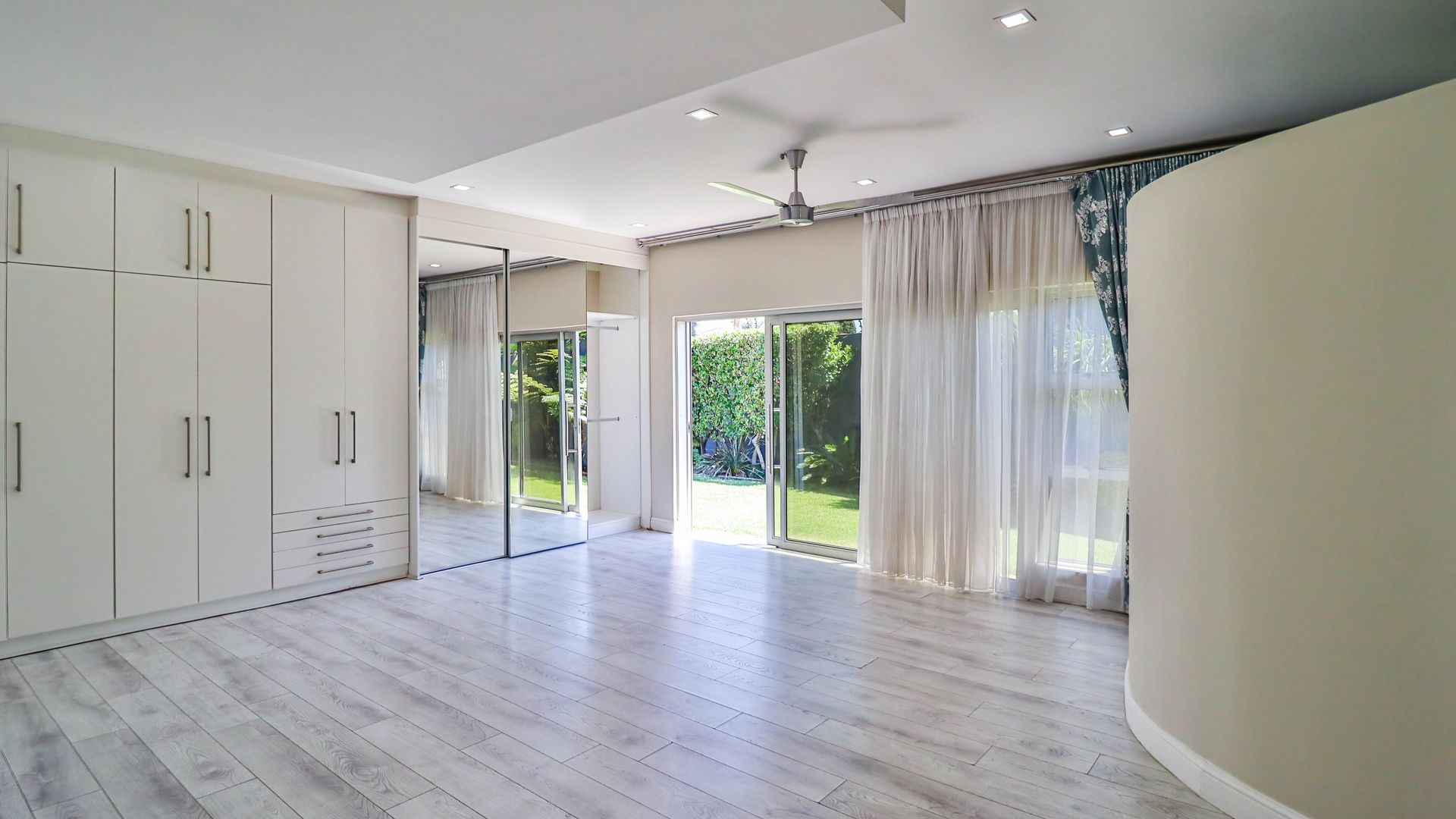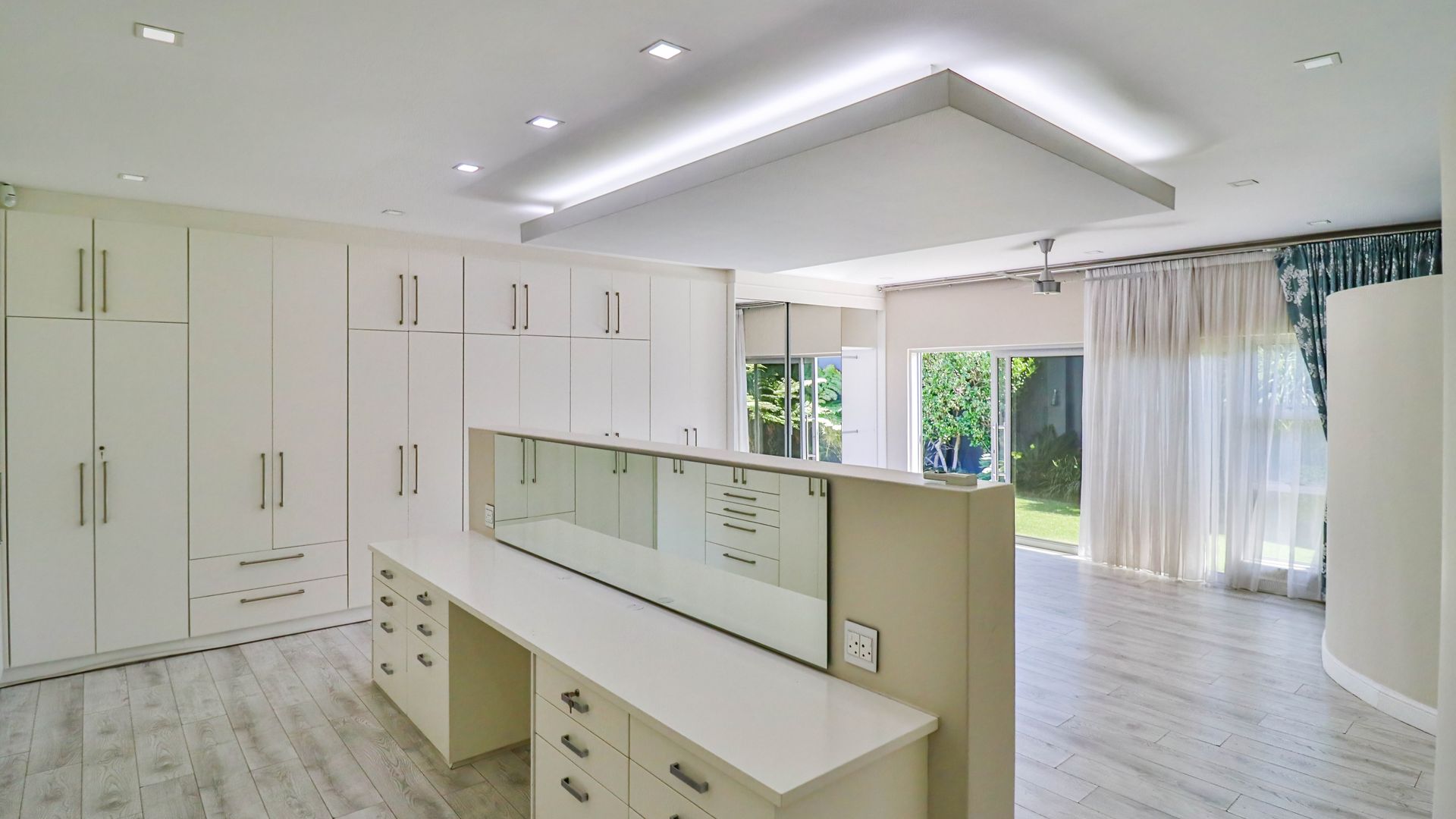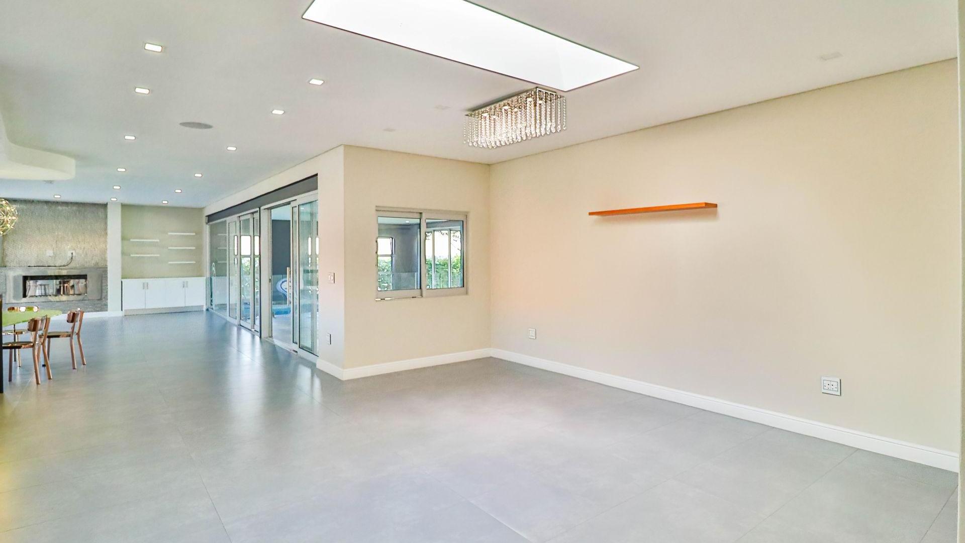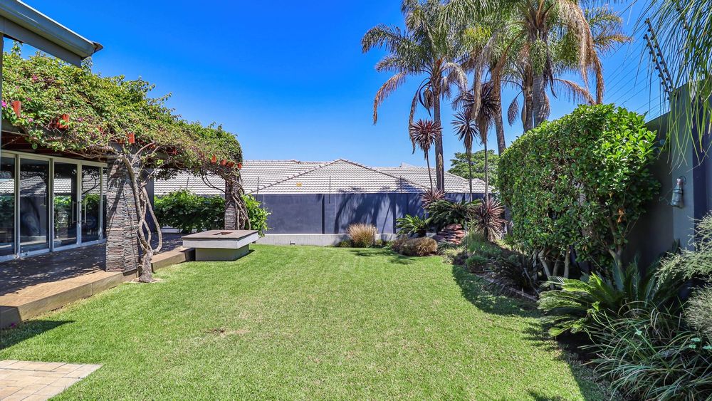 From the moment you enter, you are welcomed by an abundance of natural light and generous open-plan living spaces. The central living area features a skylit dining room, an expansive lounge with a fireplace, and a chef’s kitchen boasting Caesarstone-style counters, gas hob, dual electric ovens, microwave and space for a double-door fridge, with a separate scullery opening to the courtyard. This flows effortlessly to the impressive indoor entertainment wing with swimming pool, jacuzzi, built-in braai, cabinetry and fridge space, leading out to a charming bougainvillea-draped patio, fire pit and immaculate garden.