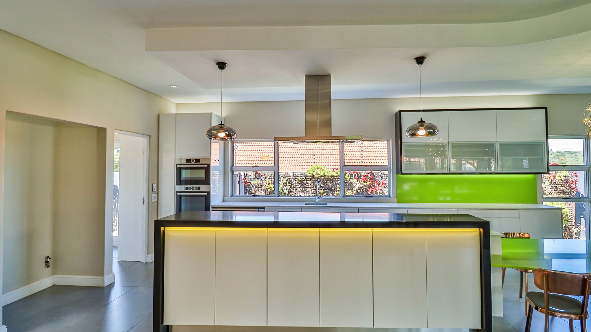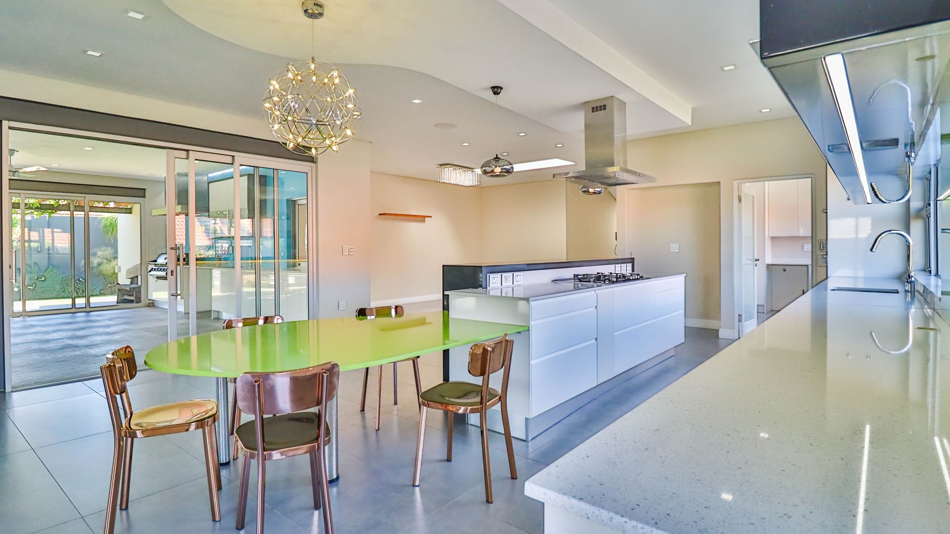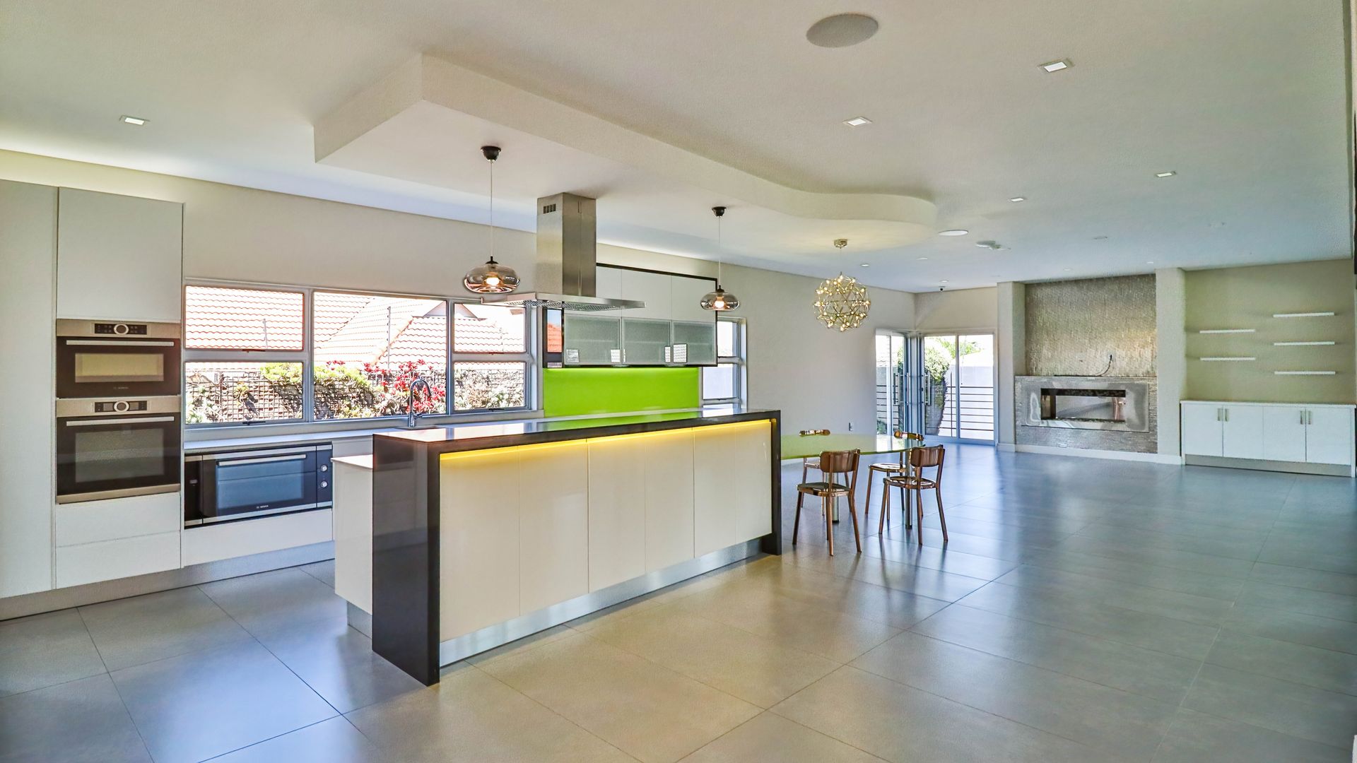 From the moment you enter, you are welcomed by an abundance of natural light and generous open-plan living spaces. The central living area features a skylit dining room, an expansive lounge with a fireplace, and a chef’s kitchen boasting Caesarstone-style counters, gas hob, dual electric ovens, microwave and space for a double-door fridge, with a separate scullery opening to the courtyard. This flows effortlessly to the impressive indoor entertainment wing with swimming pool, jacuzzi, built-in braai, cabinetry and fridge space, leading out to a charming bougainvillea-draped patio, fire pit and immaculate garden.