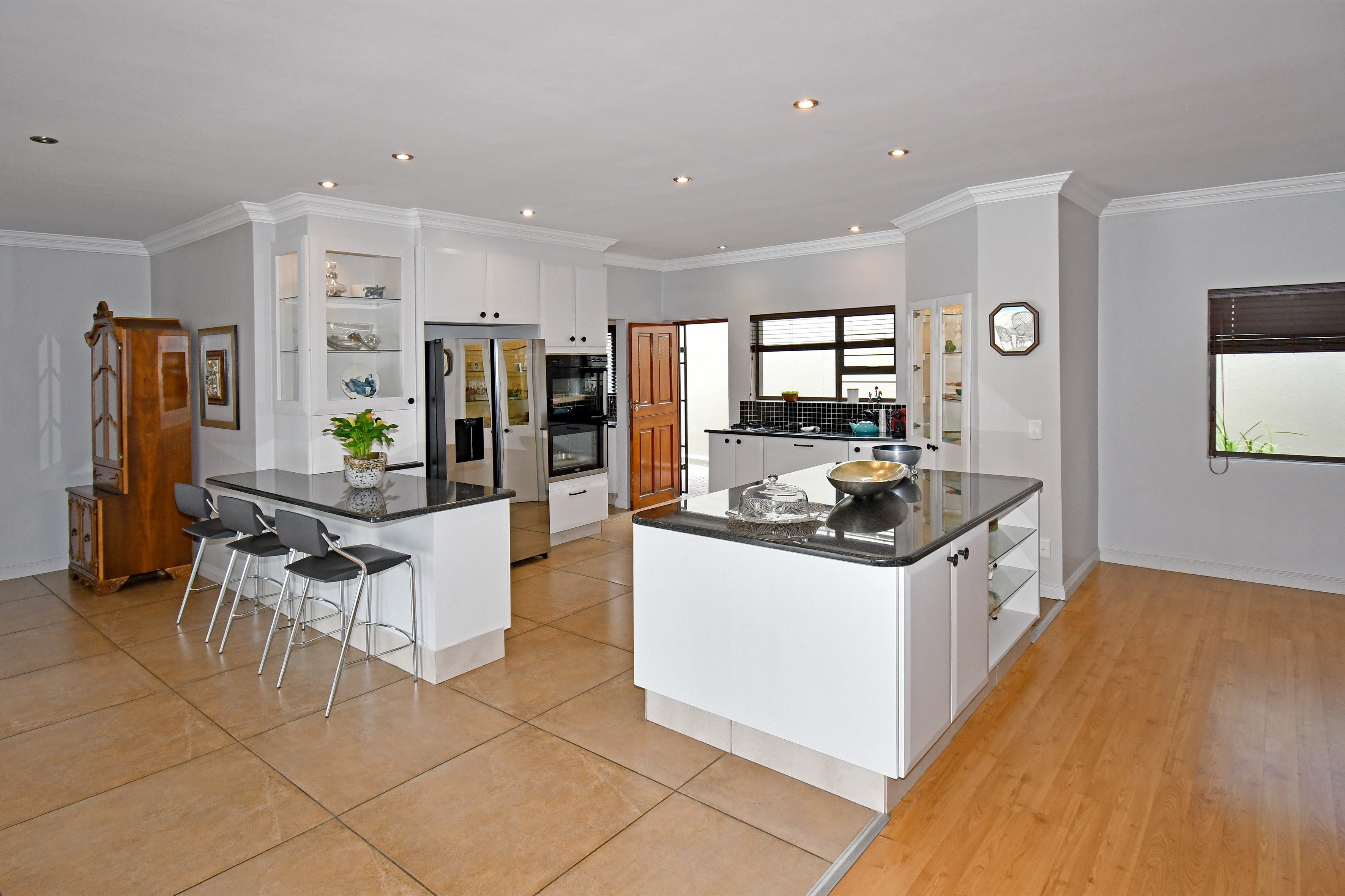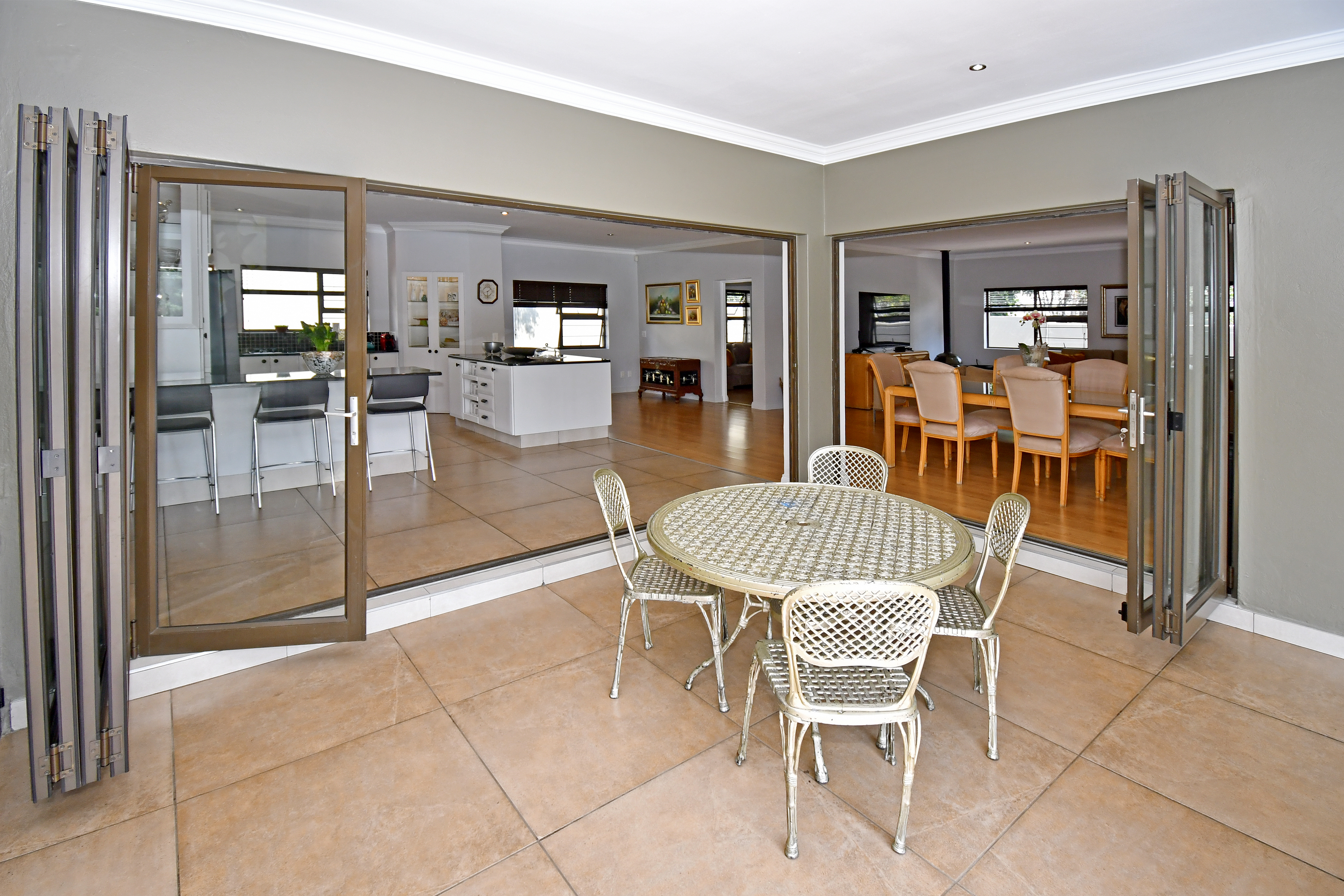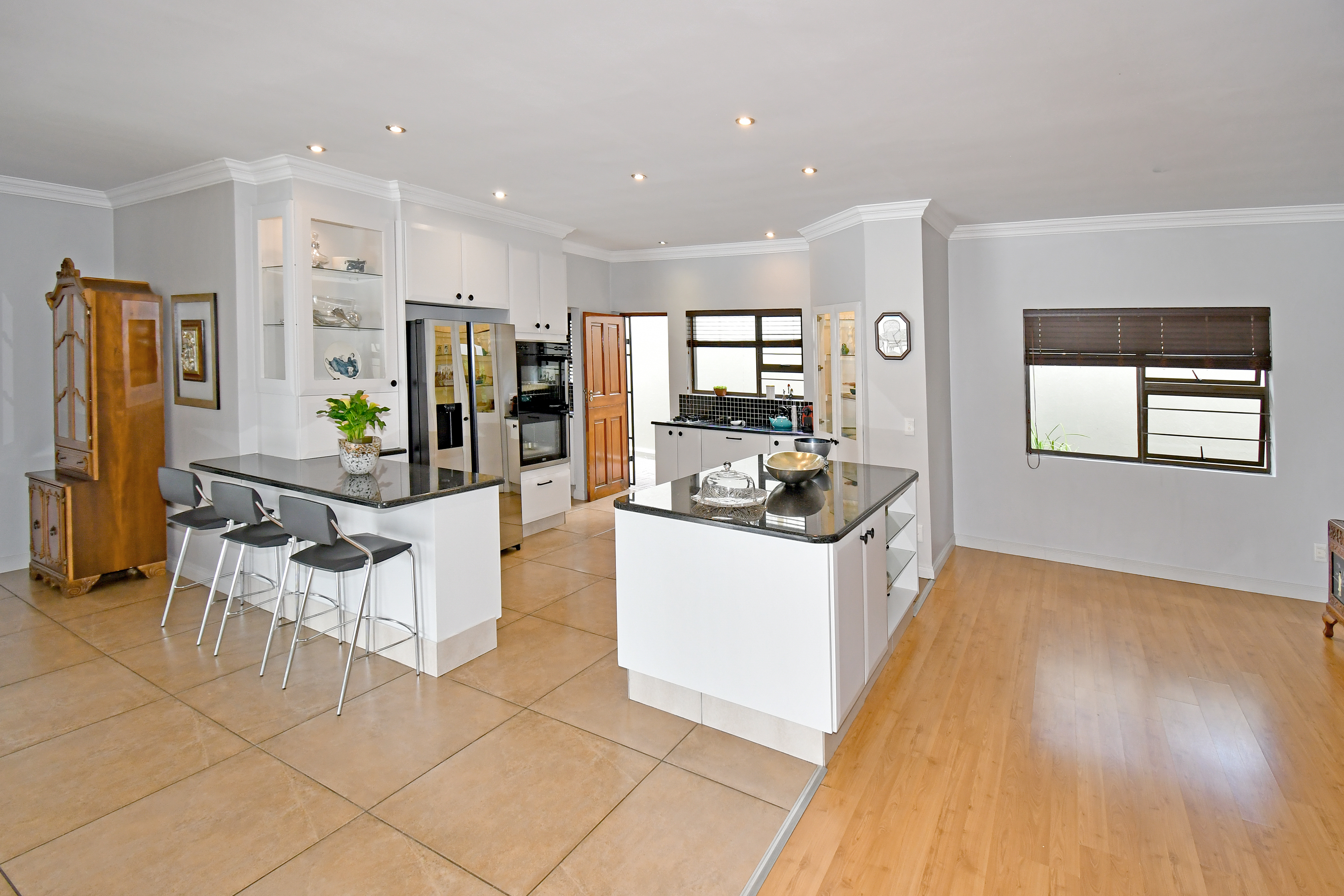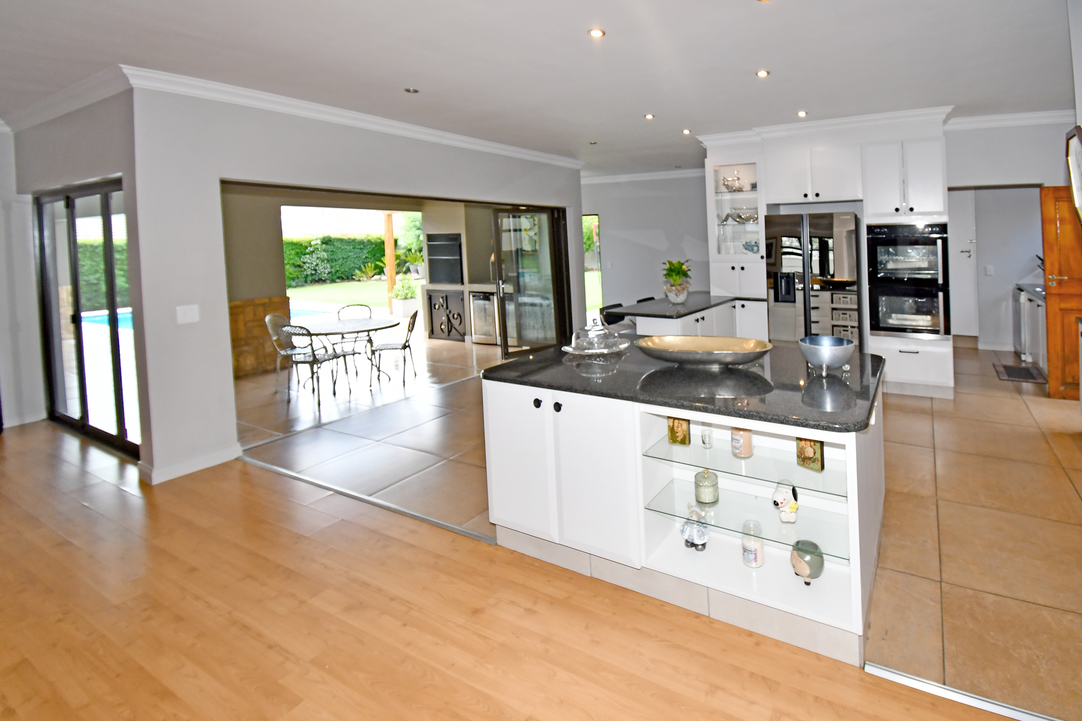 The entrance hall opens onto space that will take your breath away. Wooden flooring in lounge with fireplace opening onto a large dining room and family room. The tiled modern open plan kitchen is what dreams are made of. Glass display units. Granite tops. Gas and electric stove. Double oven. Great for family get togethers. Separate scullery.