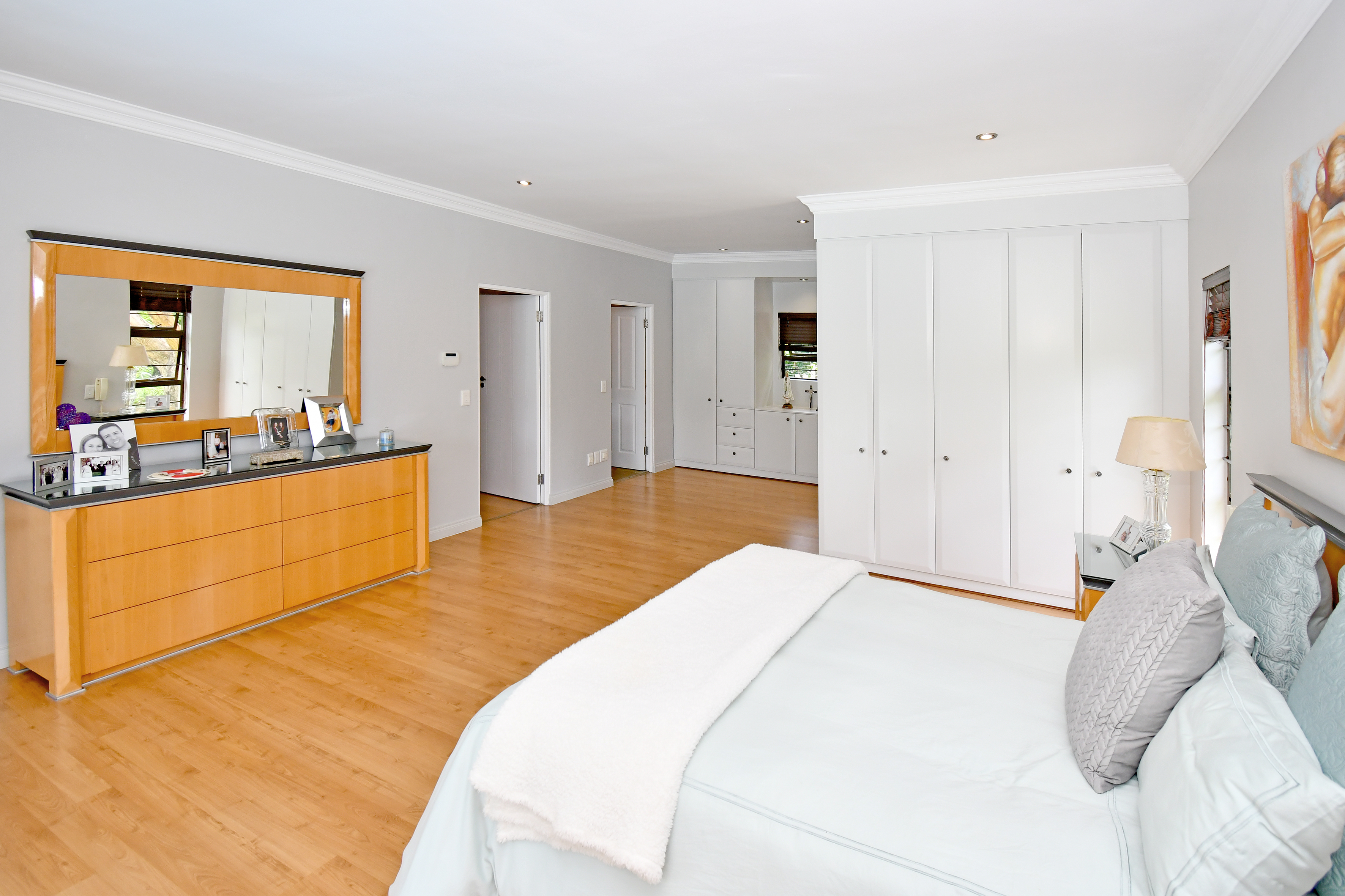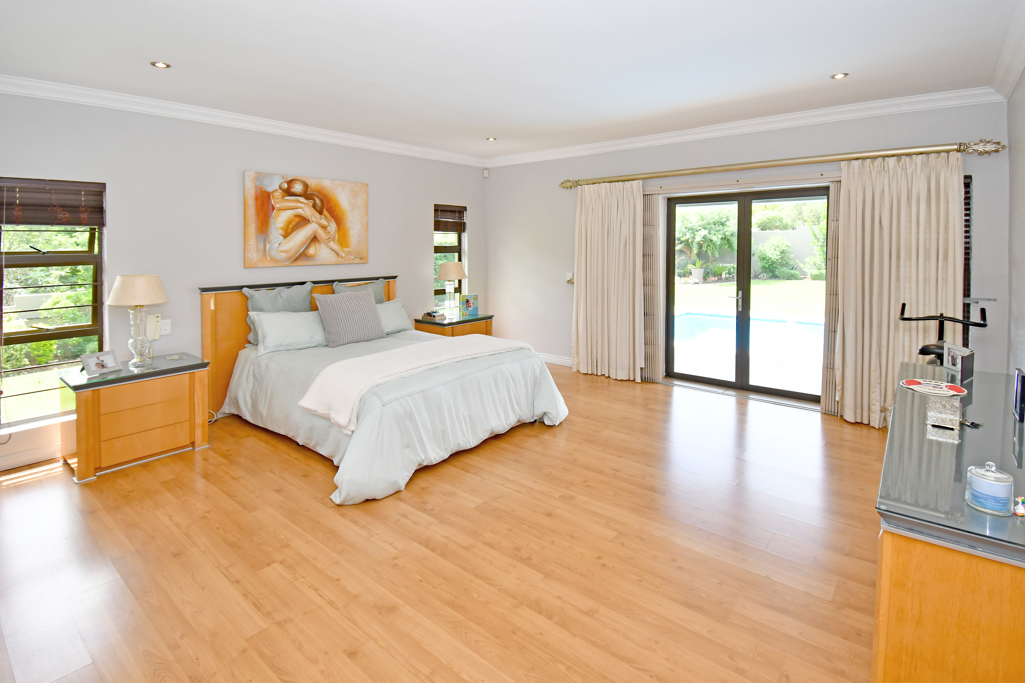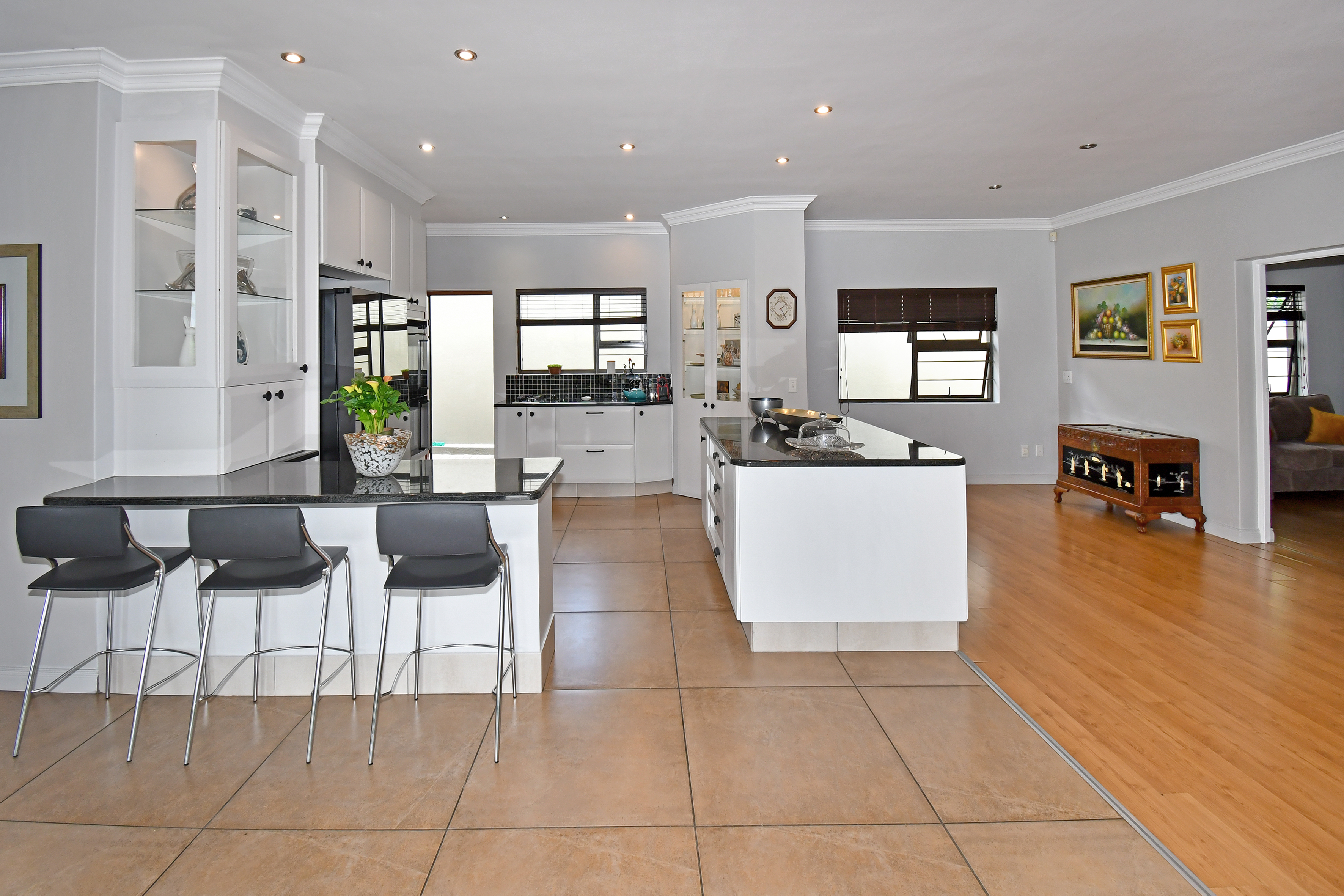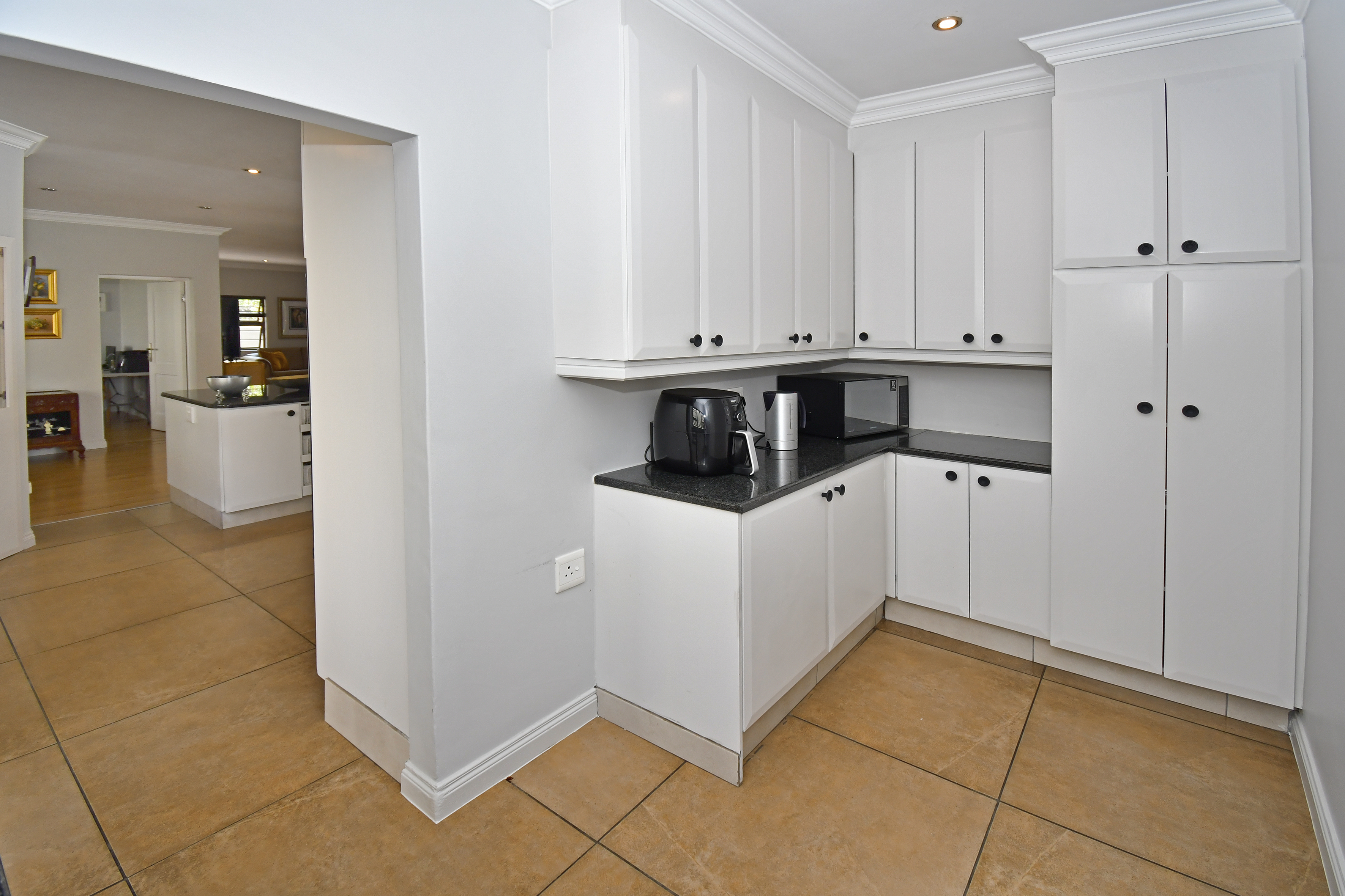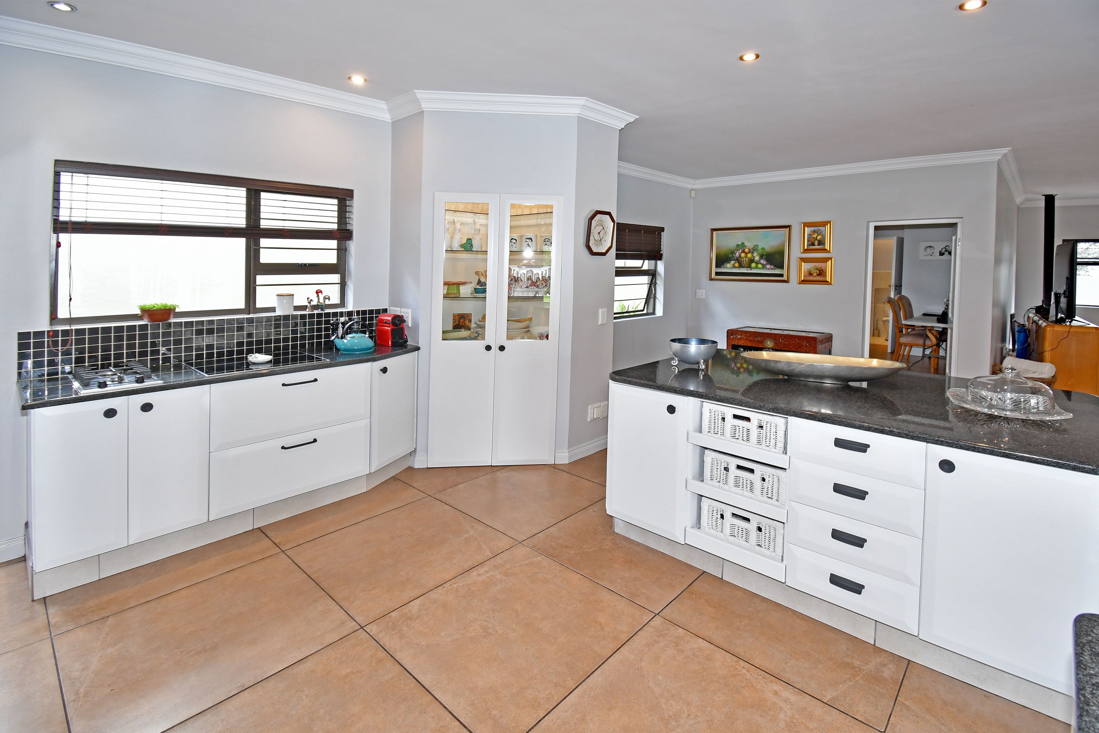 The entrance hall opens onto space that will take your breath away. Wooden flooring in lounge with fireplace opening onto a large dining room and family room. The tiled modern open plan kitchen is what dreams are made of. Glass display units. Granite tops. Gas and electric stove. Double oven. Great for family get togethers. Separate scullery.