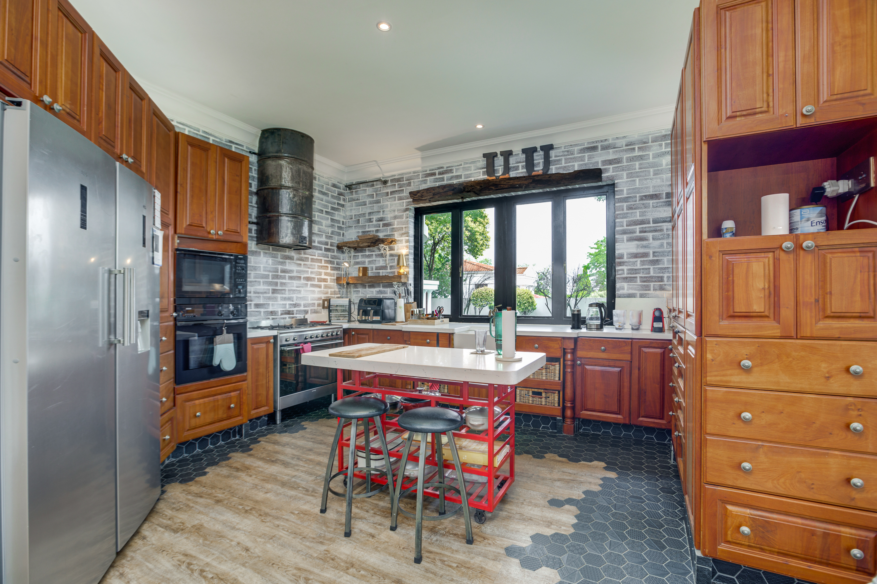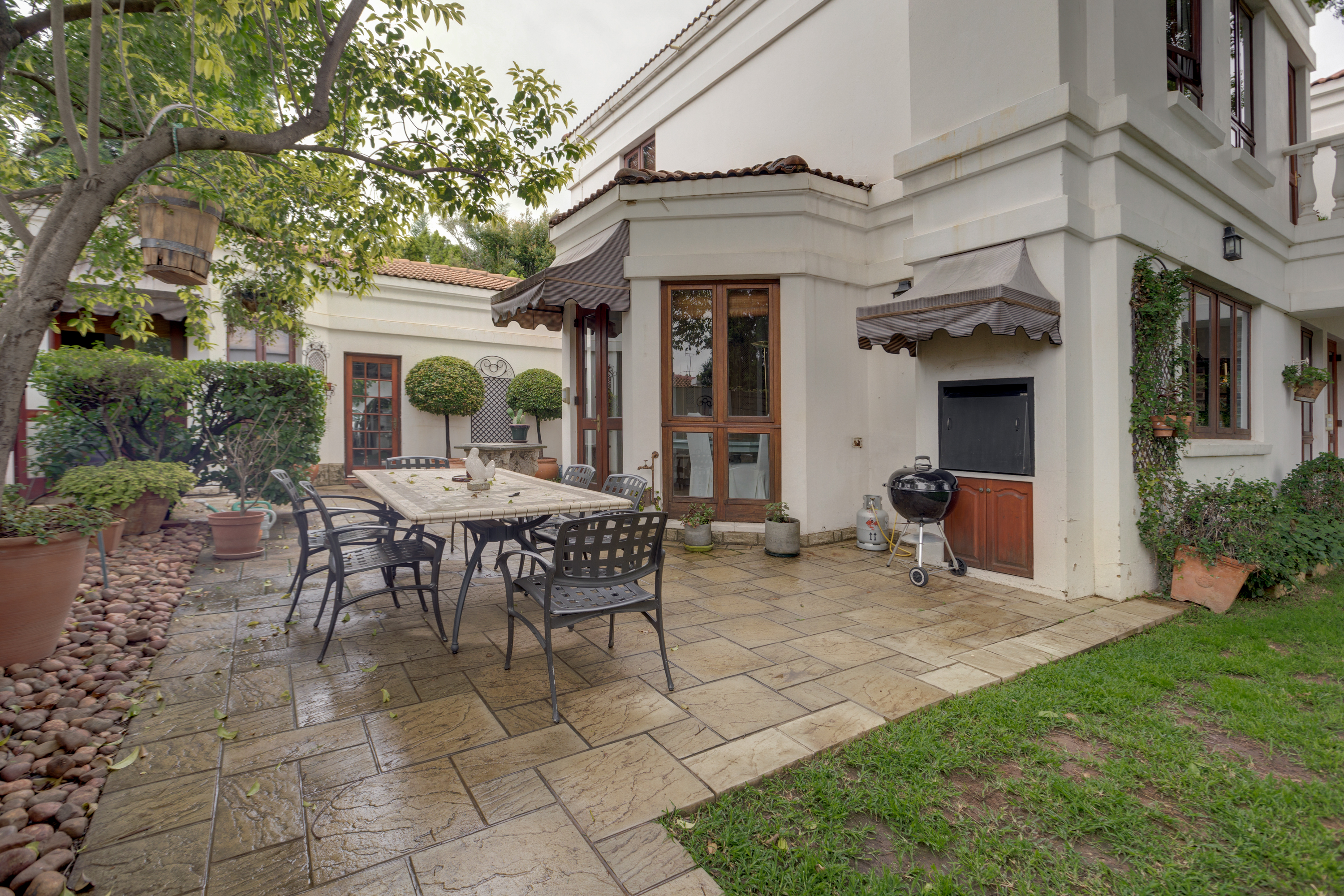 The outdoor area is equally impressive, offering multiple seating areas, a large landscaped garden, and a swimming pool. A separate pool house with a fireplace creates an ideal space for hosting guests or enjoying an outdoor living room experience year-round.
