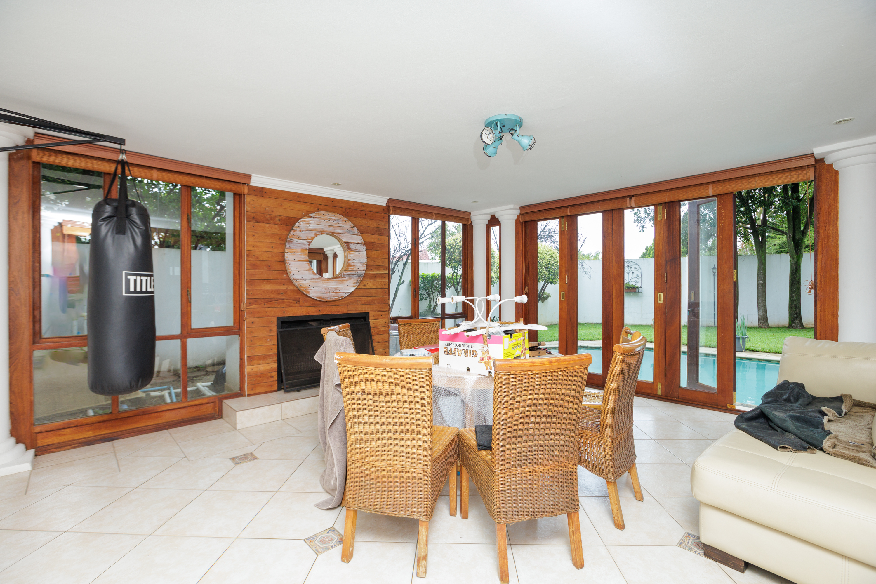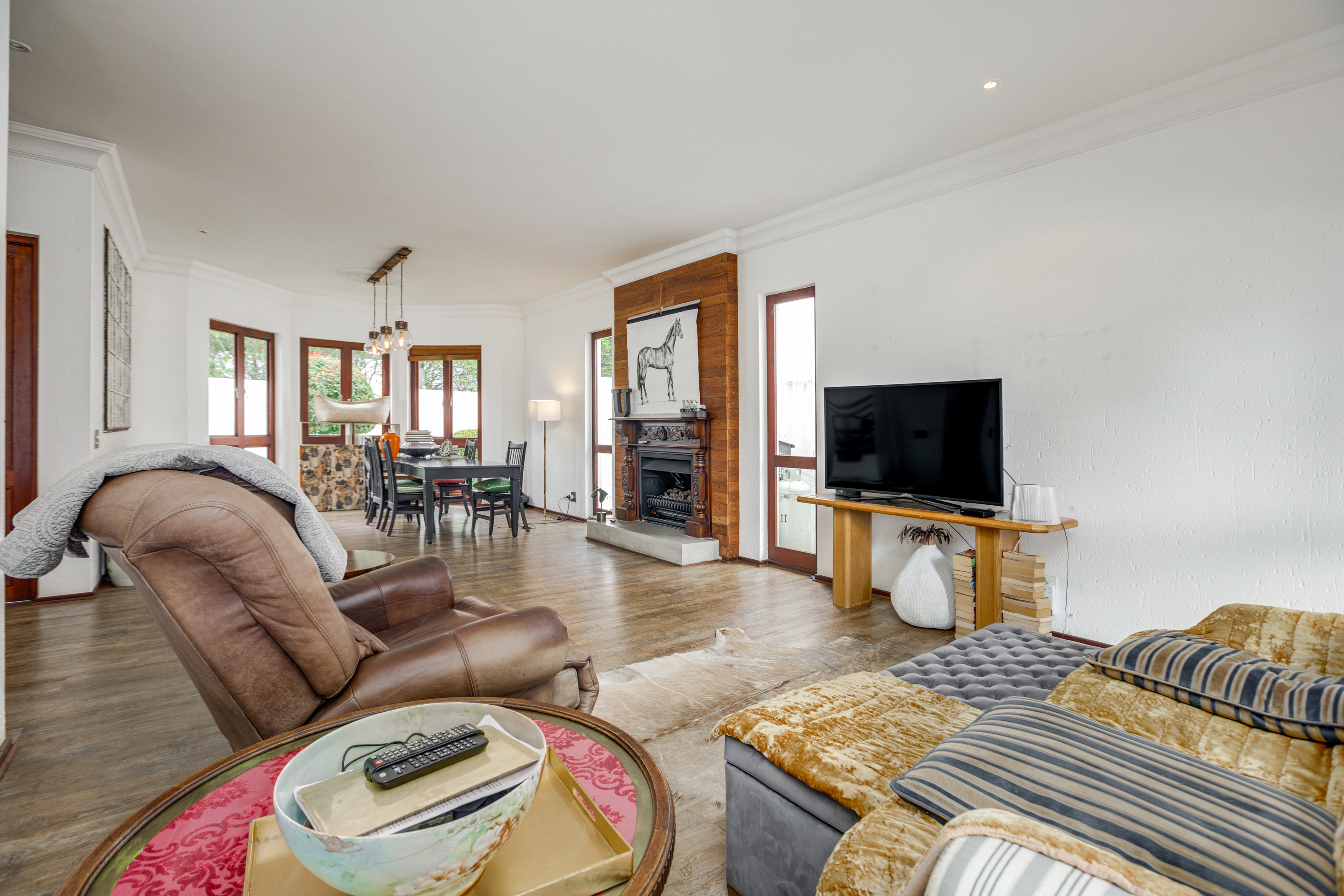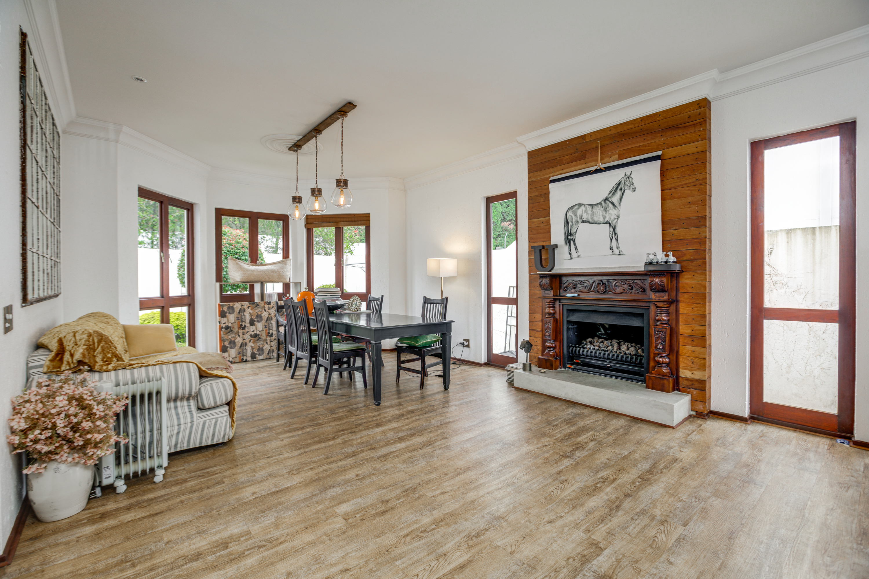 Downstairs features a sleek, modern kitchen complete with a separate scullery, ideal for both everyday living and entertaining. The kitchen flows effortlessly into a generous dining area, which sits adjacent to a large living room with a fireplace, creating a warm and inviting atmosphere. A second lounge is positioned further along the hallway and opens up to views of the backyard and patio, offering a relaxed space to unwind or entertain. A guest toilet is conveniently located on the ground floor.