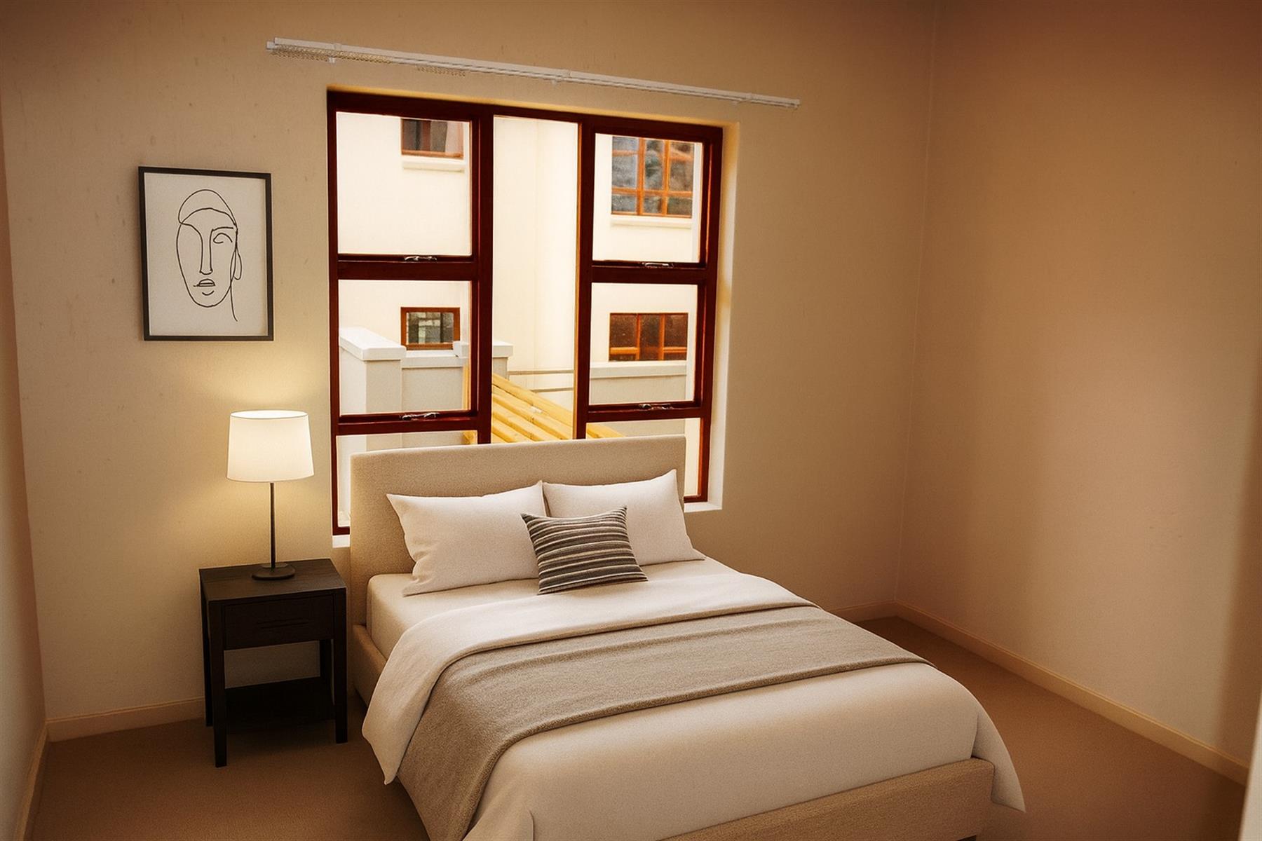 Tranquil Bedroom: The generously sized bedroom is a retreat of calm, featuring plush carpeting, expansive built-in cupboards, and that desirable North-facing warmth.
