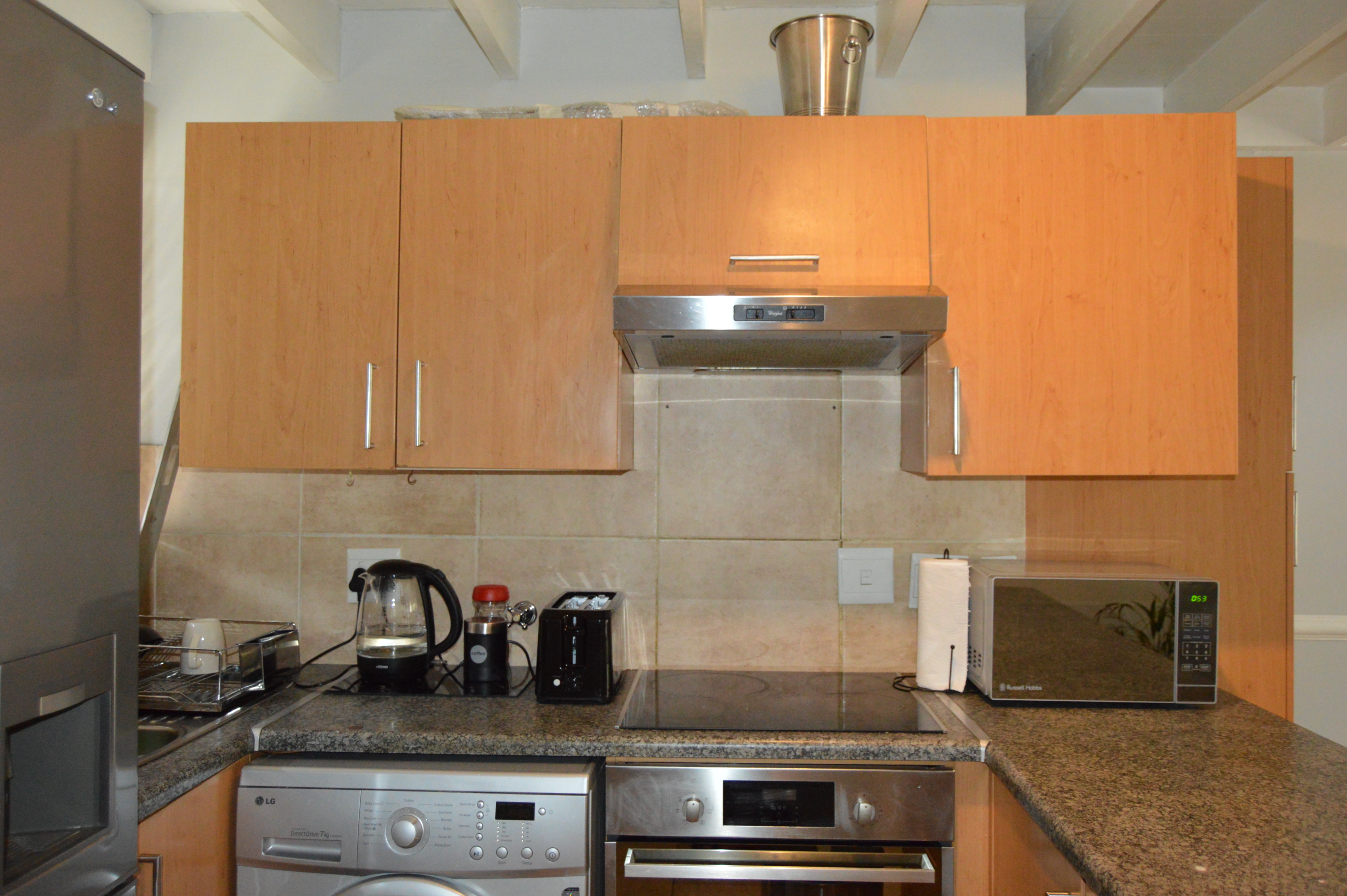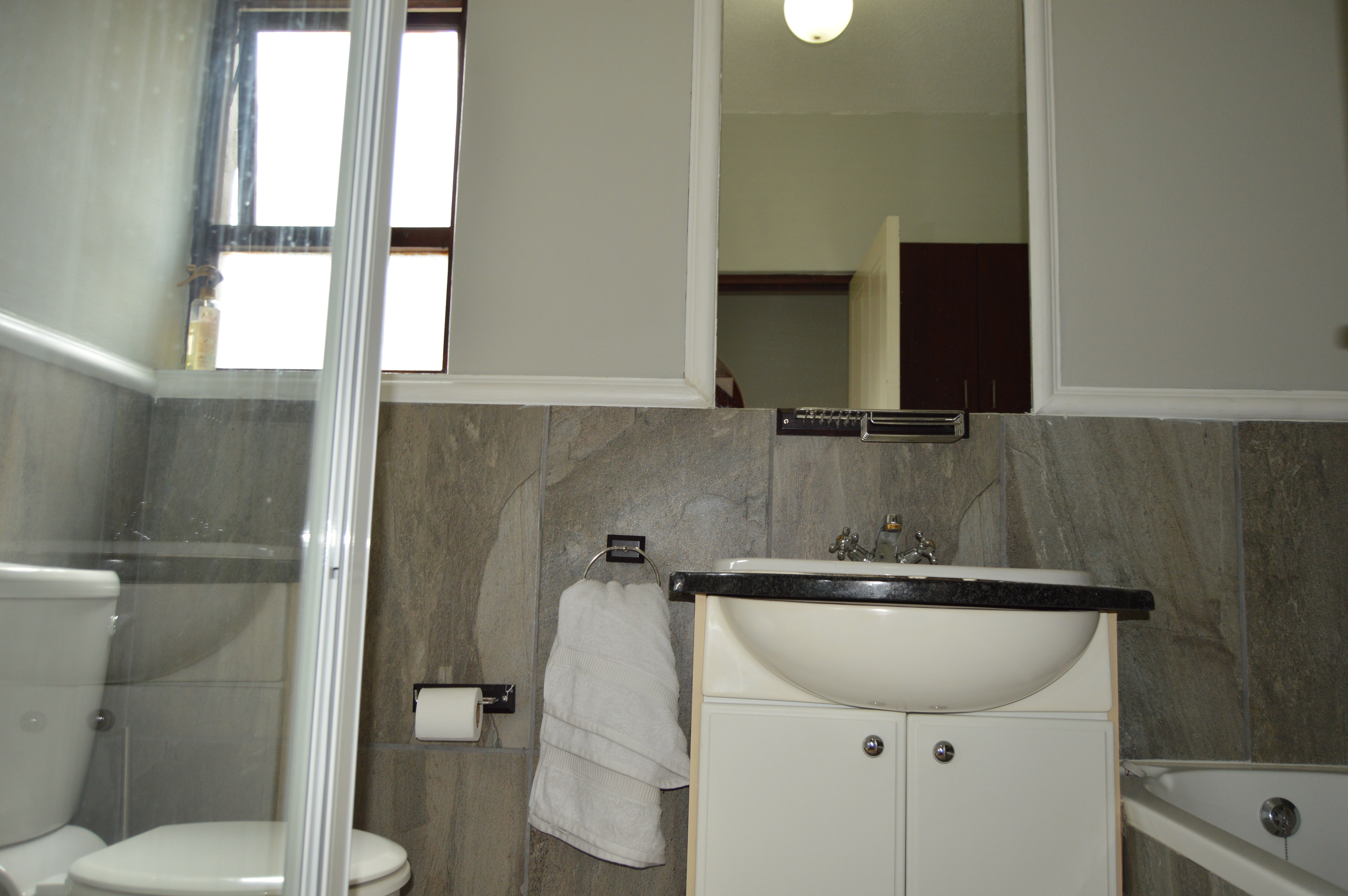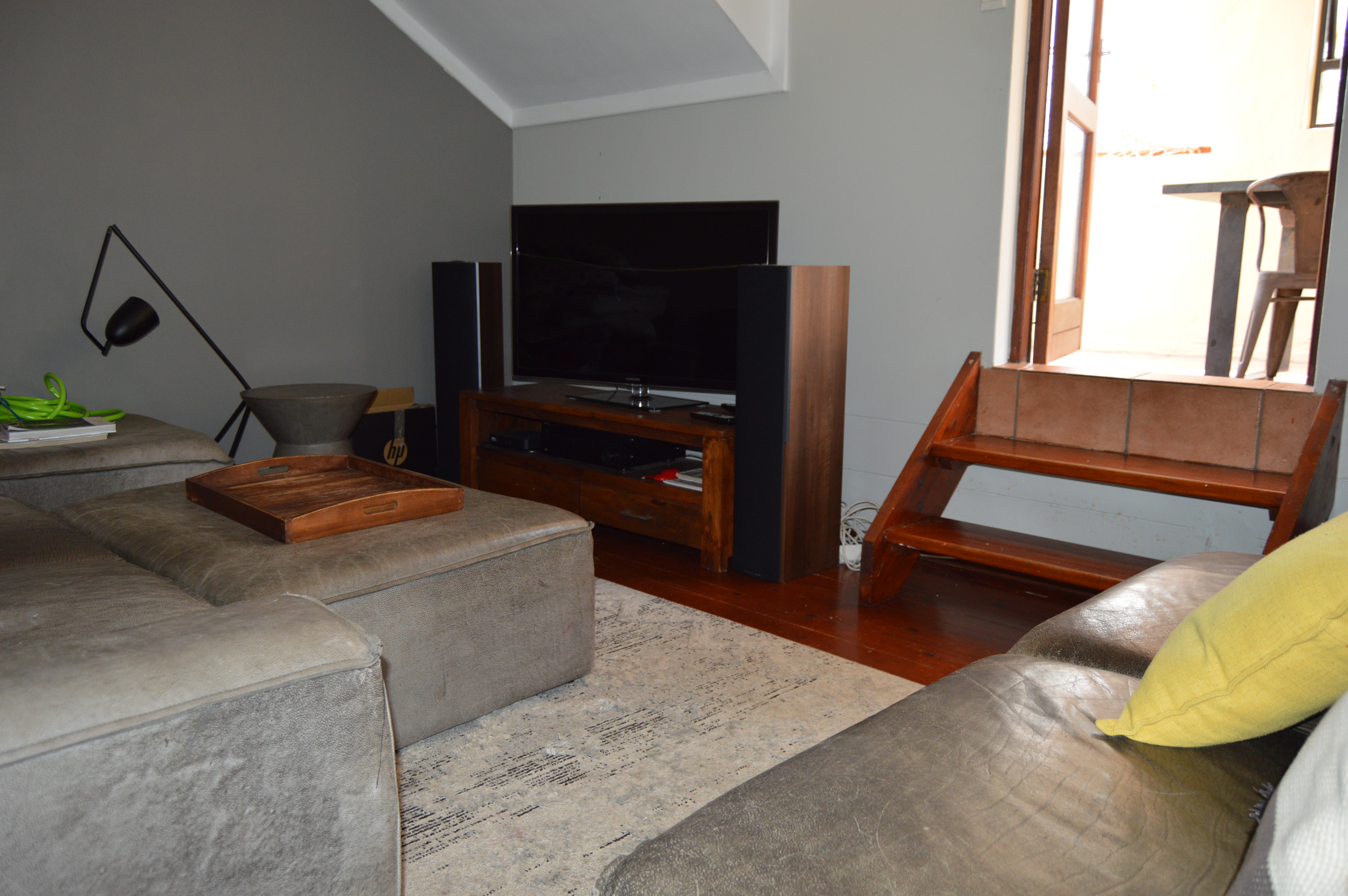 The lower level welcomes you with a neat, functional open-plan kitchen featuring a convenient breakfast counter that flows effortlessly into the dining room and lounge. The living area opens onto a sun-splashed balcony, ideal for morning coffee or evening relaxation. Both bedrooms are located downstairs, finished with attractive wood laminate flooring that adds warmth and continuity throughout. The main bedroom enjoys direct access to the balcony, enhancing the indoor-outdoor feel. A modern full bathroom services the home, finished in clean, contemporary tones.