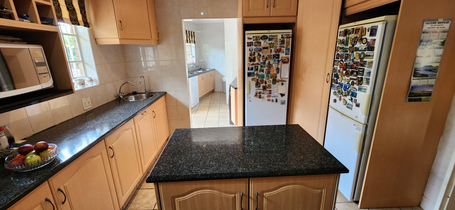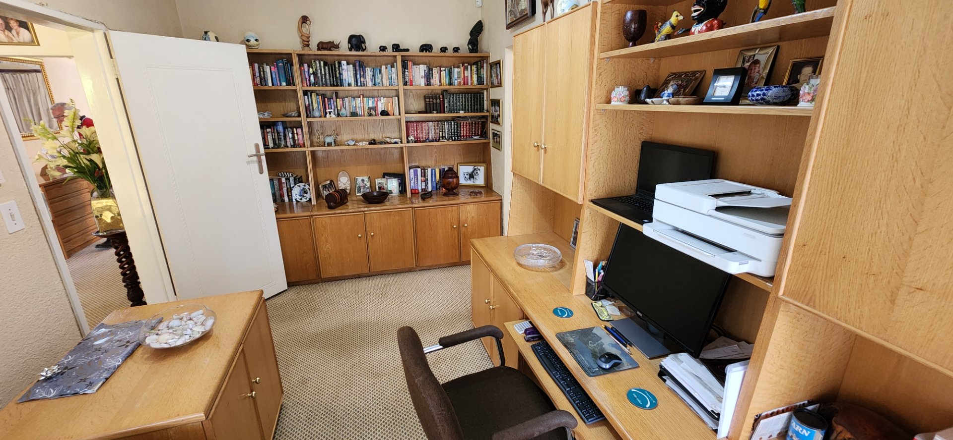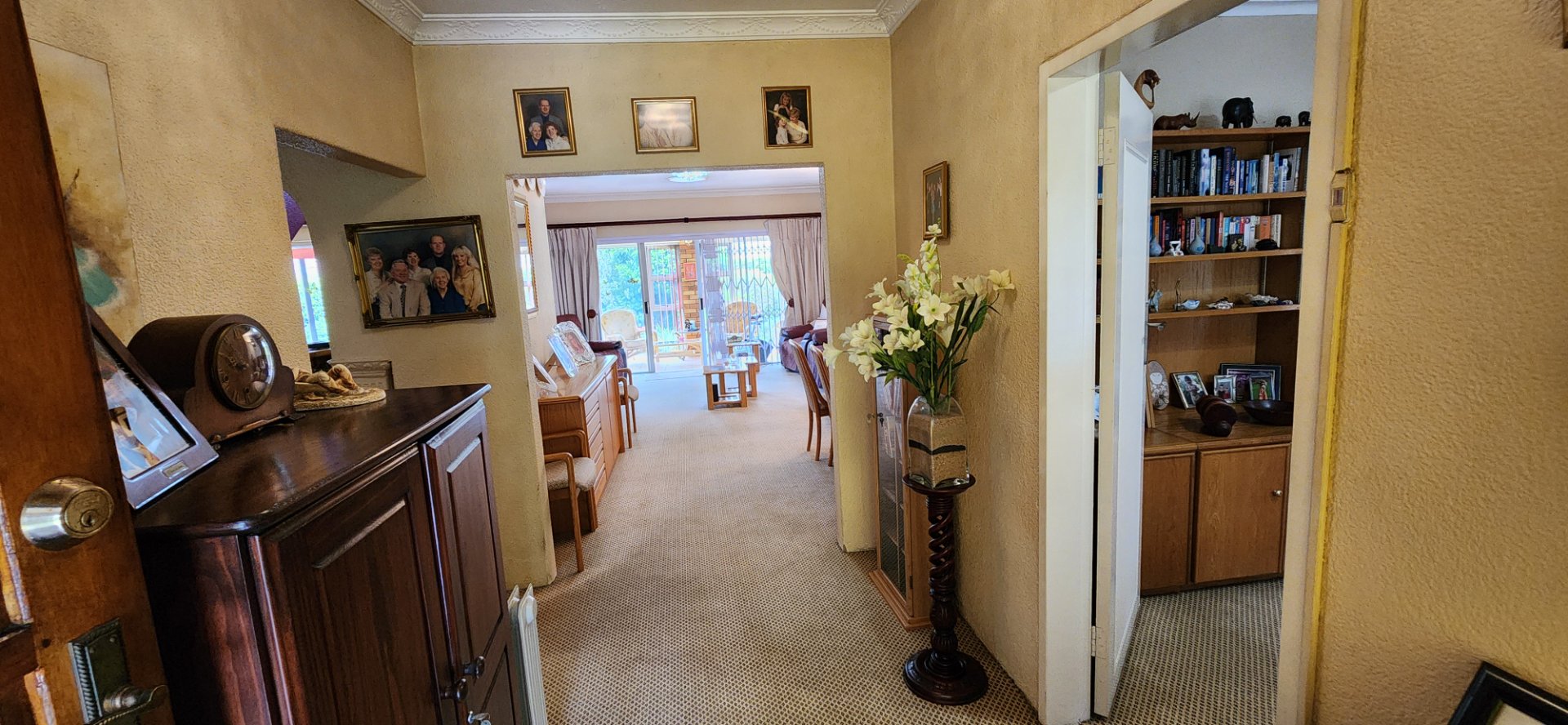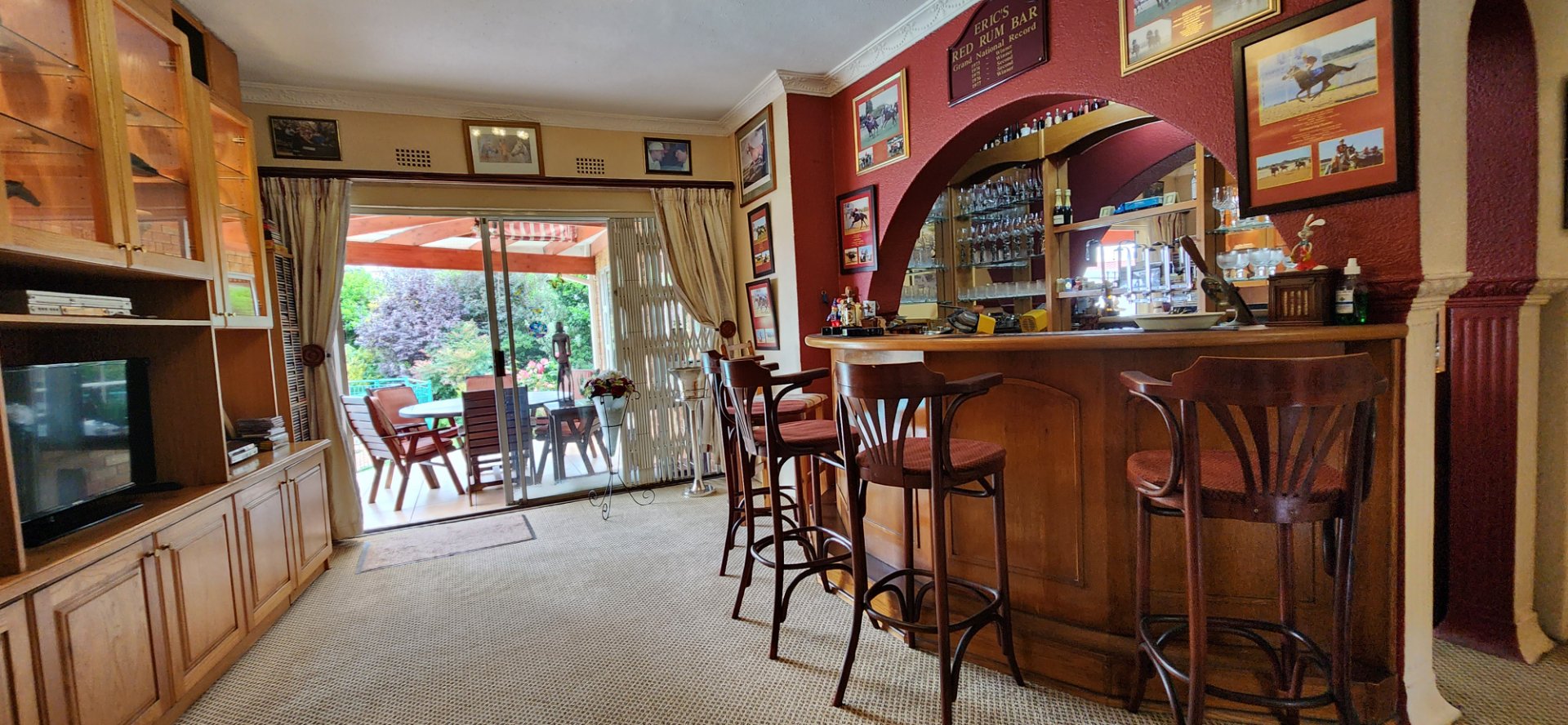 A picturesque walk through a manicured rose garden welcomes you into a welcoming entrance hall that leads to two comfortable living areas, a sunroom, and a unique English-style pub / entertainment room. The compact granite kitchen features a gas hob, ample storage, and an adjoining scullery, while a fitted study is ideal for working from home.