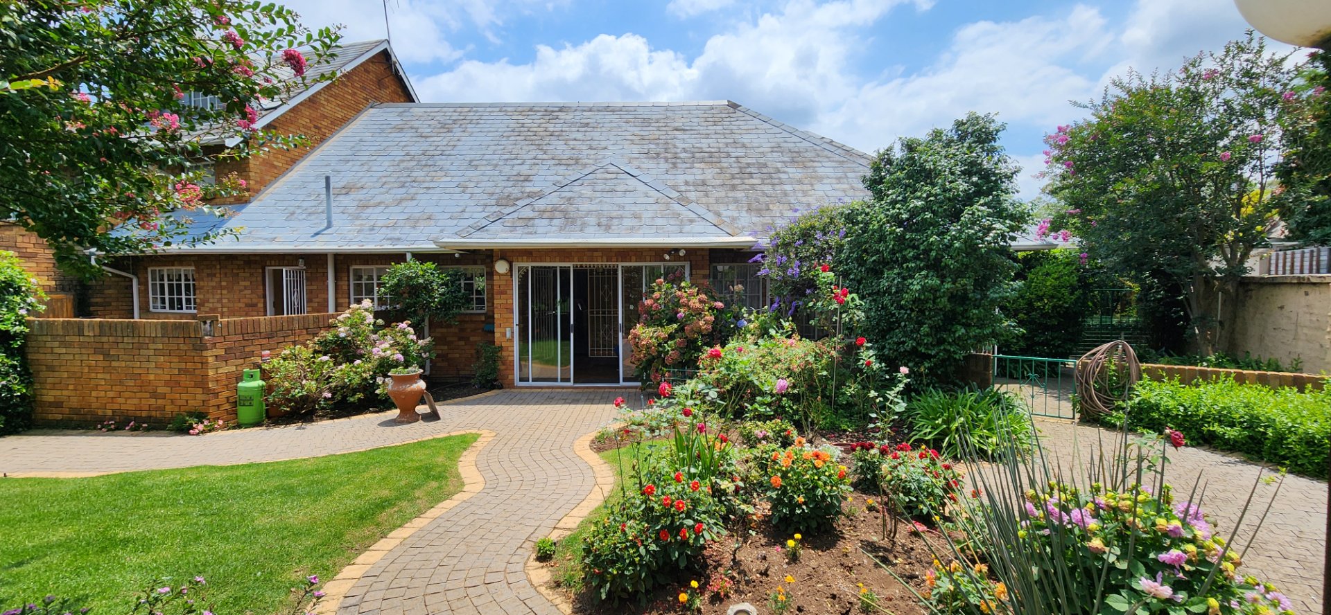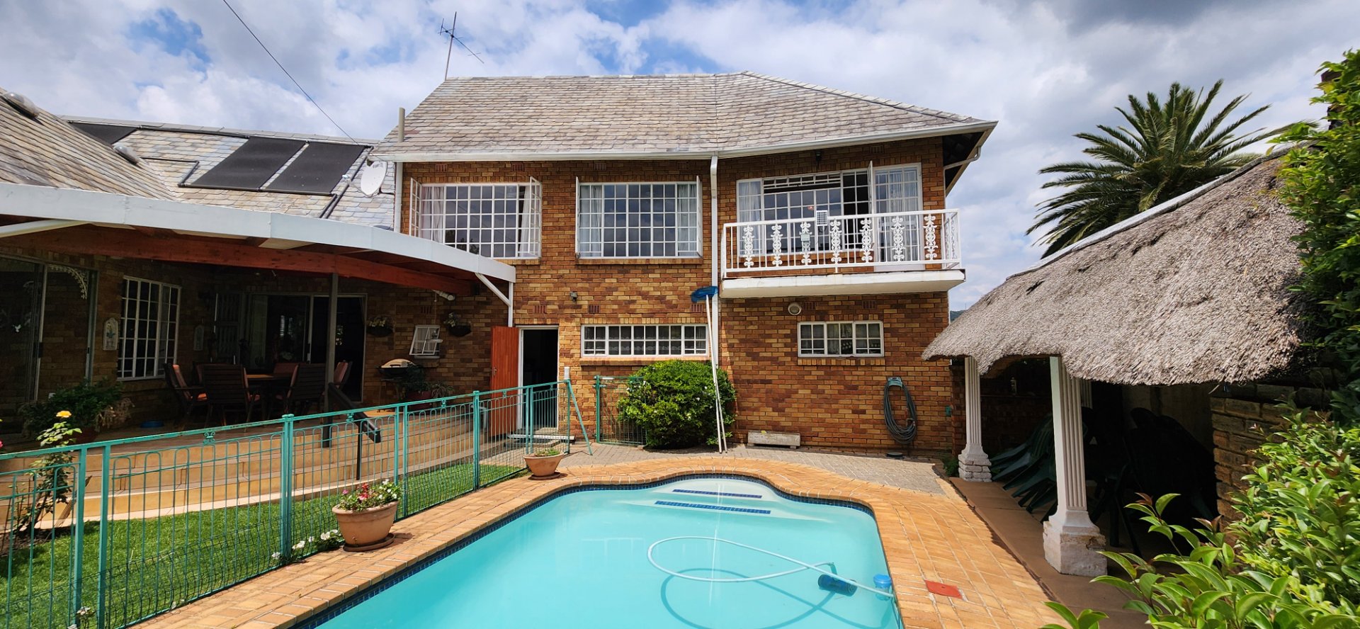 The established garden features a solar-heated swimming pool, covered patio, braai area, and entertainment lapas — ideal for relaxed family time.
