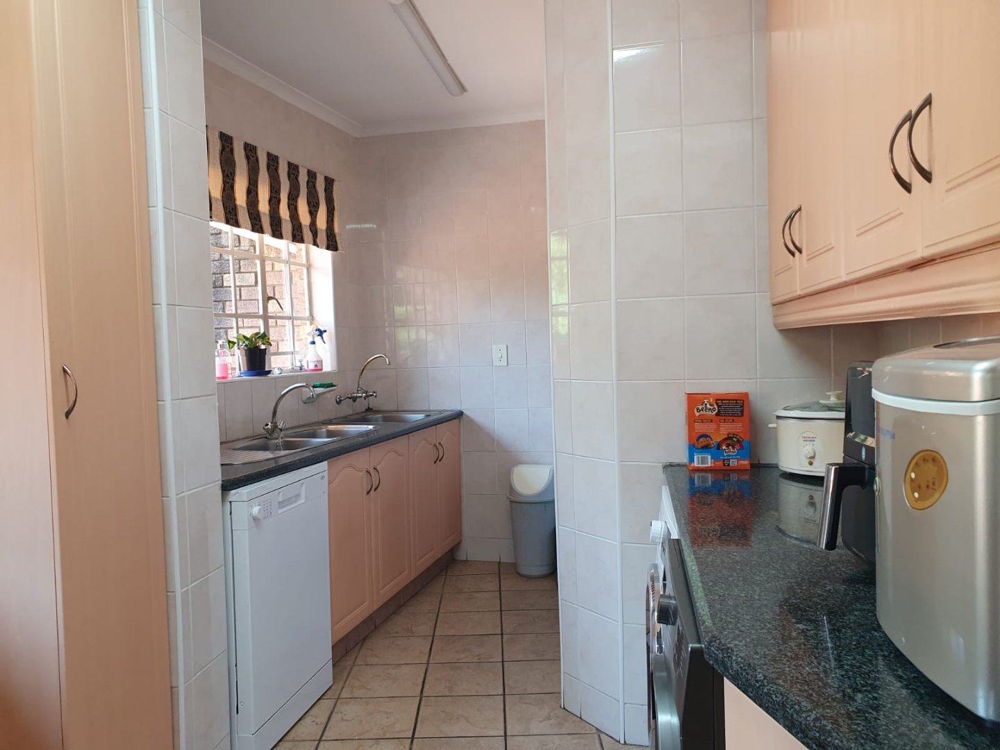 A Modern kitchen with ample kitchen cupboards, granite countertops, a gas hob, space for 2 fridges, and a scullery.