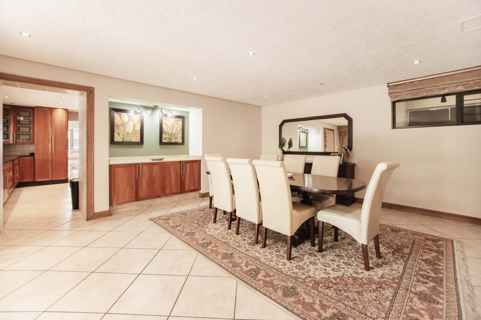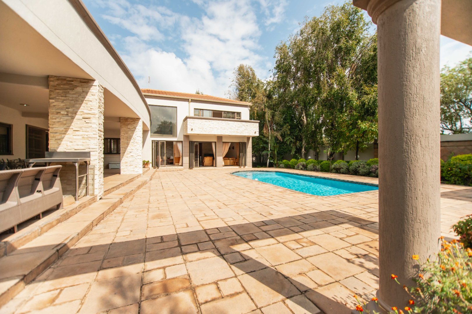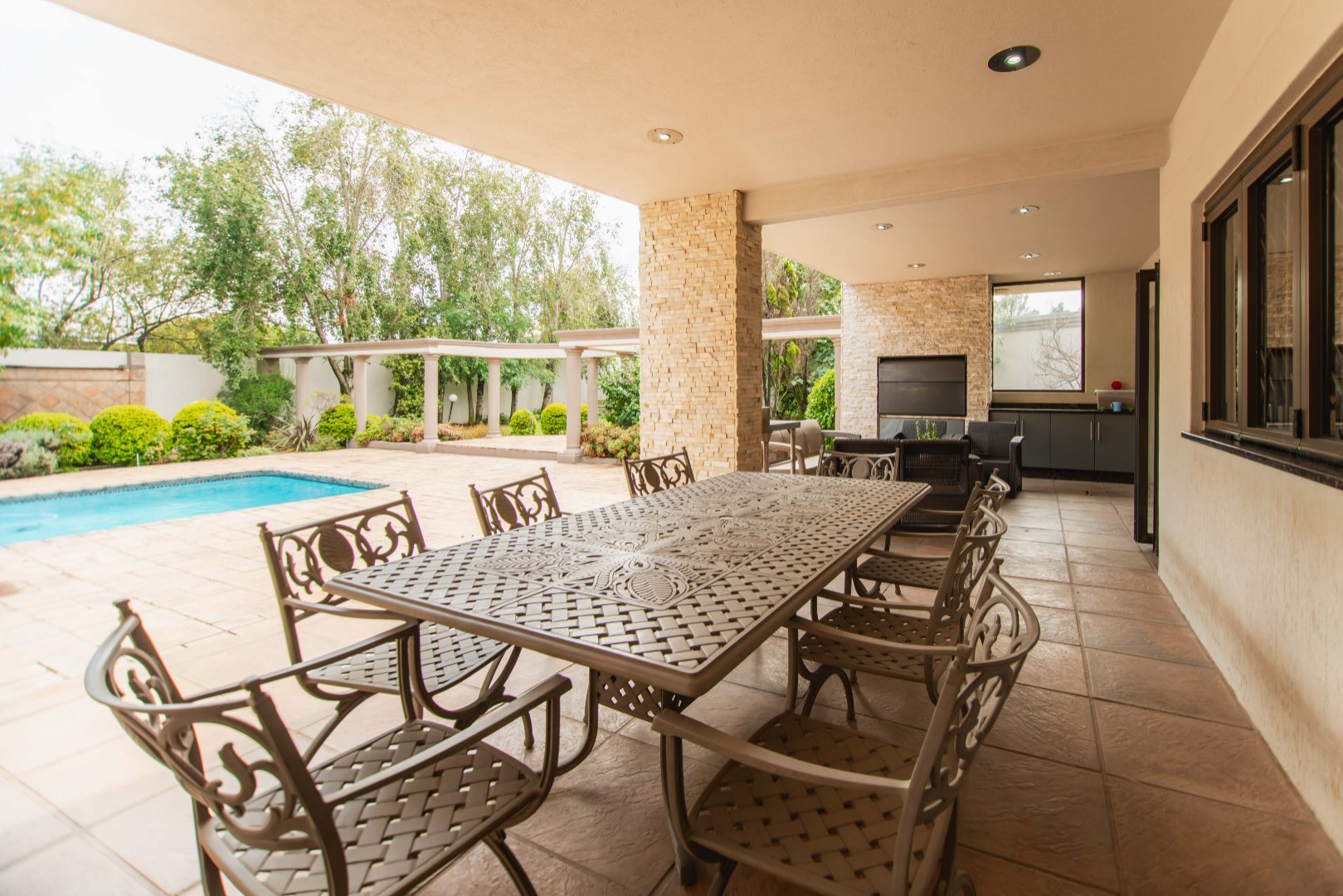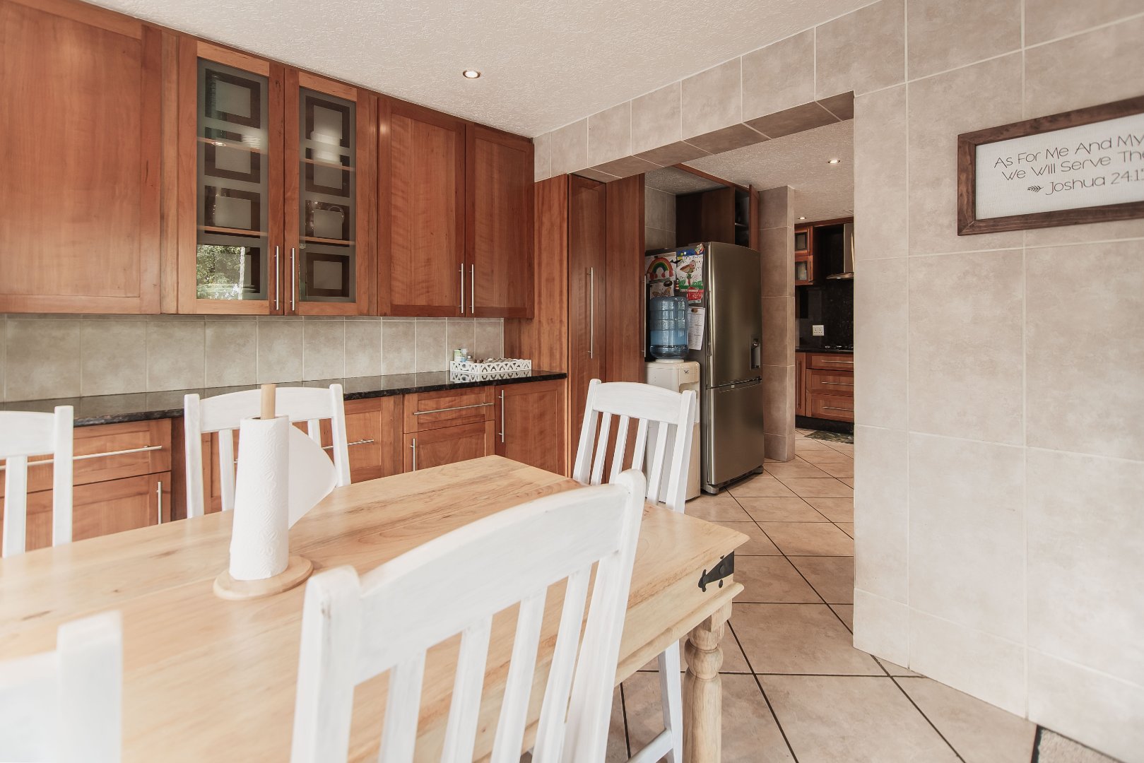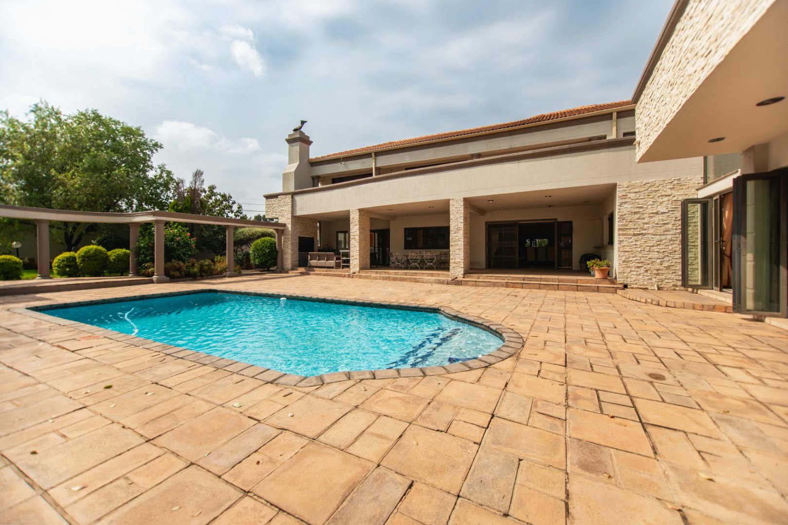 This expansive 5-bedroom home offers the perfect blend of comfort and style, set on a generous 1,664 m2 stand. Featuring multiple living spaces including a lounge, TV room, family room, and a separate dining room, it’s ideal for both everyday living and hosting guests. The modern kitchen, finished with granite counters and a breakfast nook, is complemented by a pub for entertaining. With 4.5 bathrooms, a study, and a main en-suite, there’s ample space for the whole family. Outdoor living is a pleasure with a pool, braai area, and beautiful grounds. Additional features include staff accommodation, double garages, two carports, and extra parking. Enjoy the convenience of prepaid electricity and the comfort of a home designed for both relaxation and entertaining.