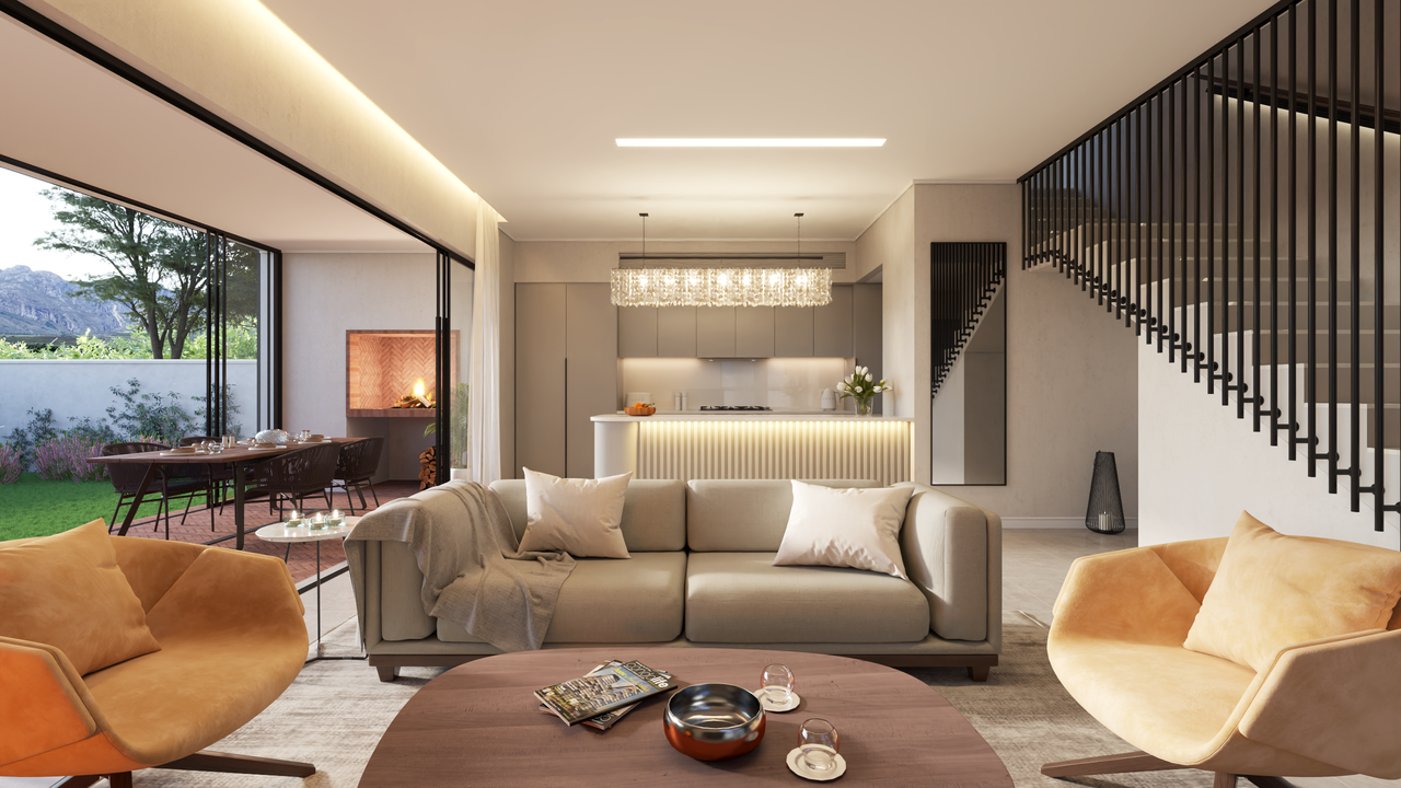 The heart of Drakenzicht lies in its designer 3- and 4-bedroom villas, a testament to Legaro's unwavering commitment to perfection. Created by the renowned Daffonchio Architects, each villa showcases impeccable attention to detail and timeless elegance. The interiors embrace a neutral palette that exudes sophistication, with premium features including SMEG appliances, Stephen Pikus chandeliers, wood-burning fireplaces, gas stoves, and Oggie timber flooring, all encased in a striking Versus coated facade.