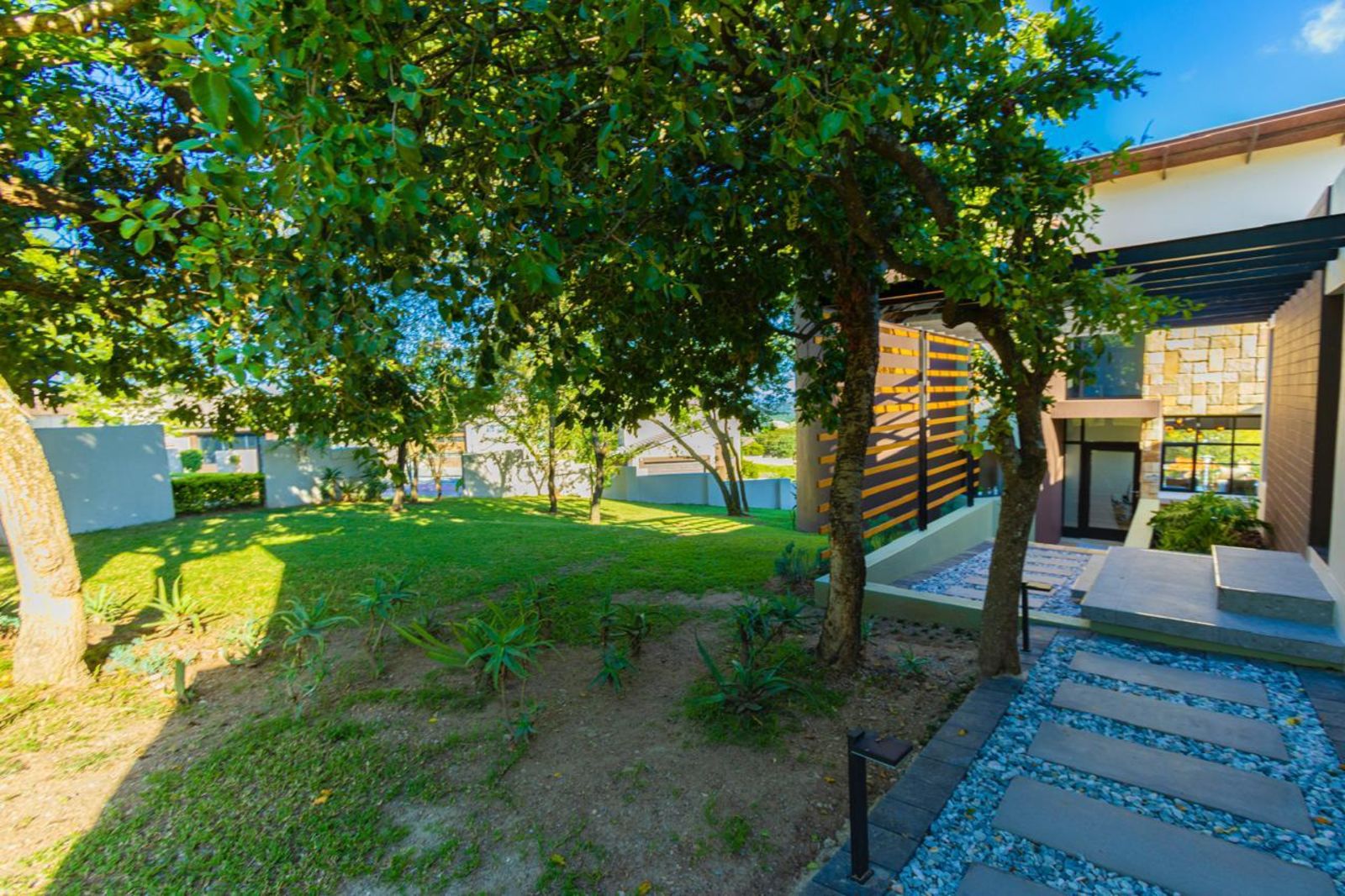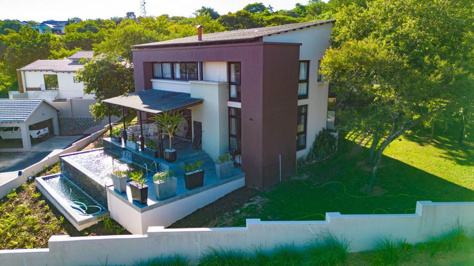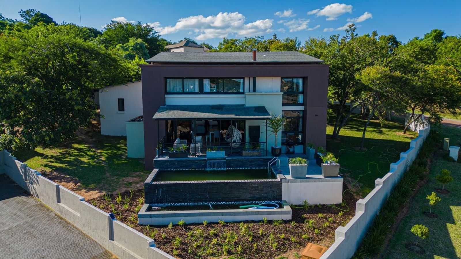 A pristine swimming pool takes center stage in the beautifully landscaped backyard, offering a refreshing escape on warm days. The outdoor space is designed for relaxation and entertainment, complete with a braai area and a shaded lounging section.