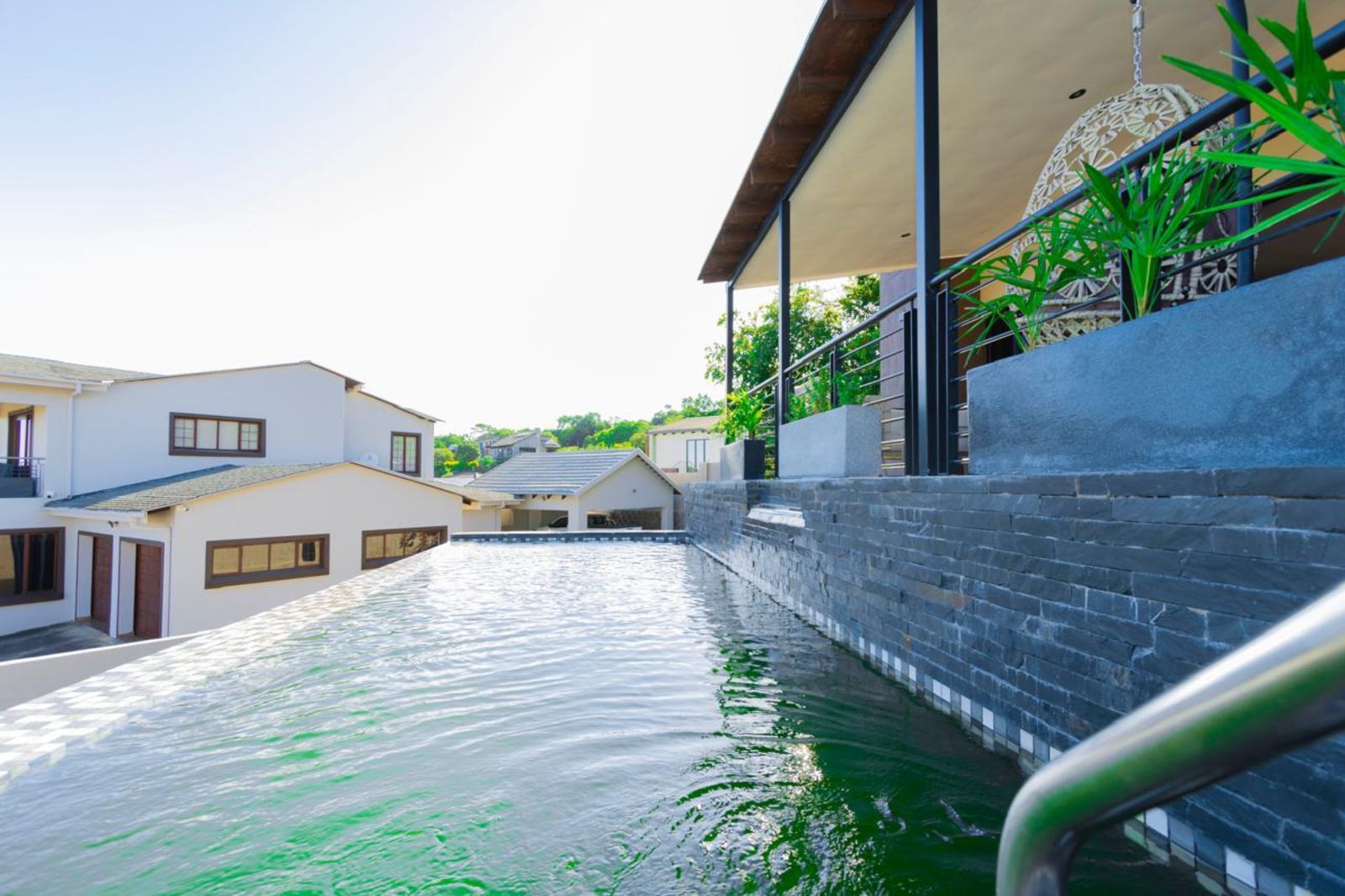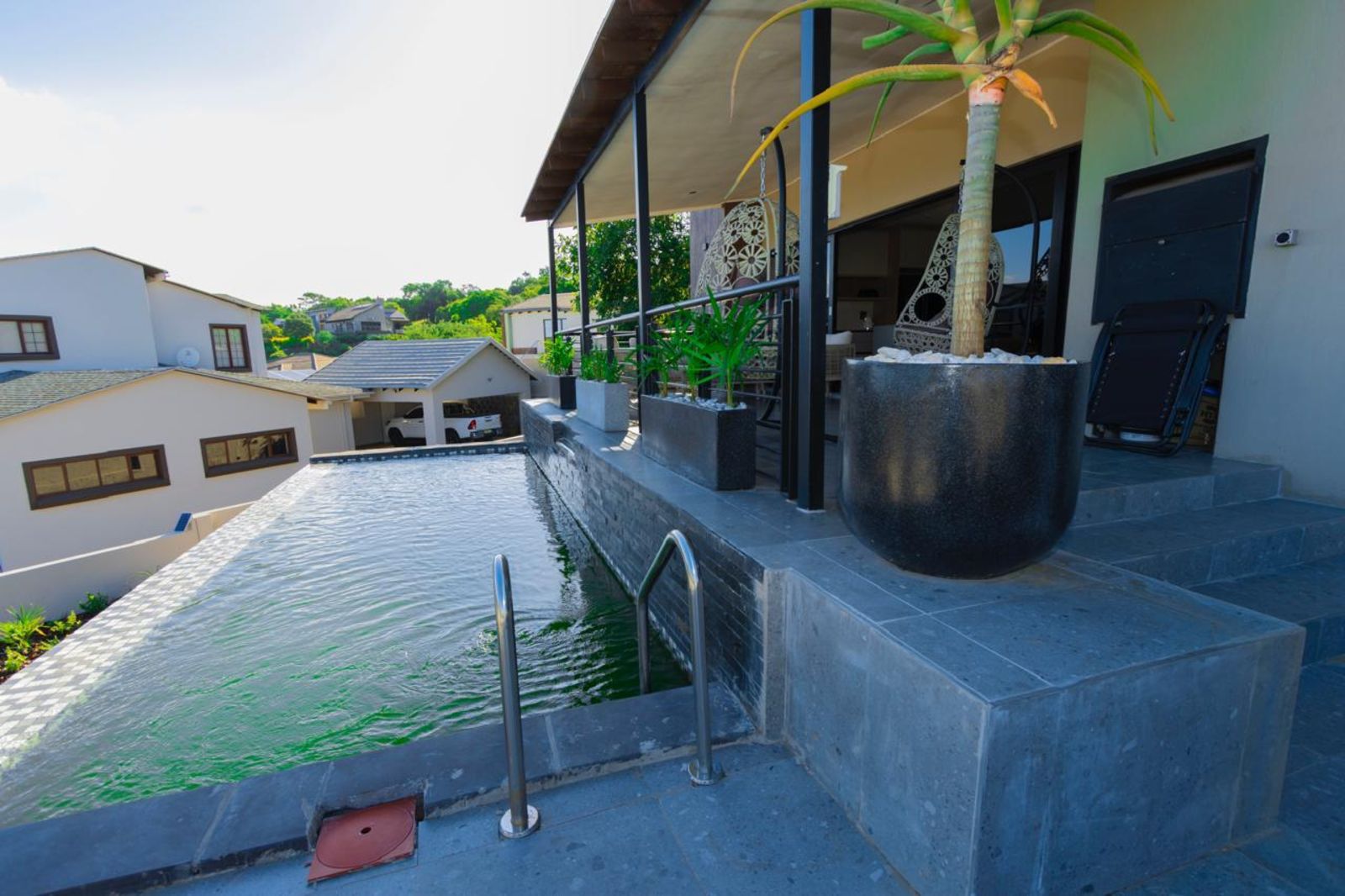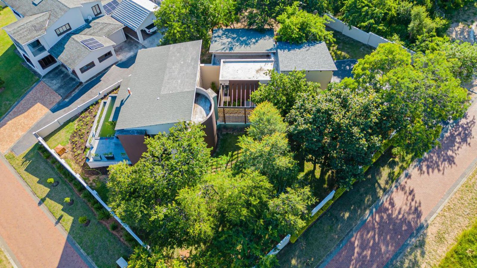 A pristine swimming pool takes center stage in the beautifully landscaped backyard, offering a refreshing escape on warm days. The outdoor space is designed for relaxation and entertainment, complete with a braai area and a shaded lounging section.