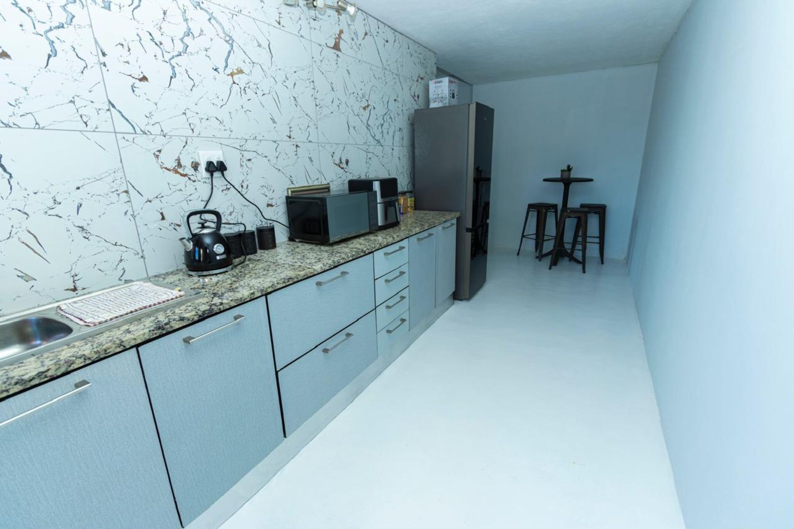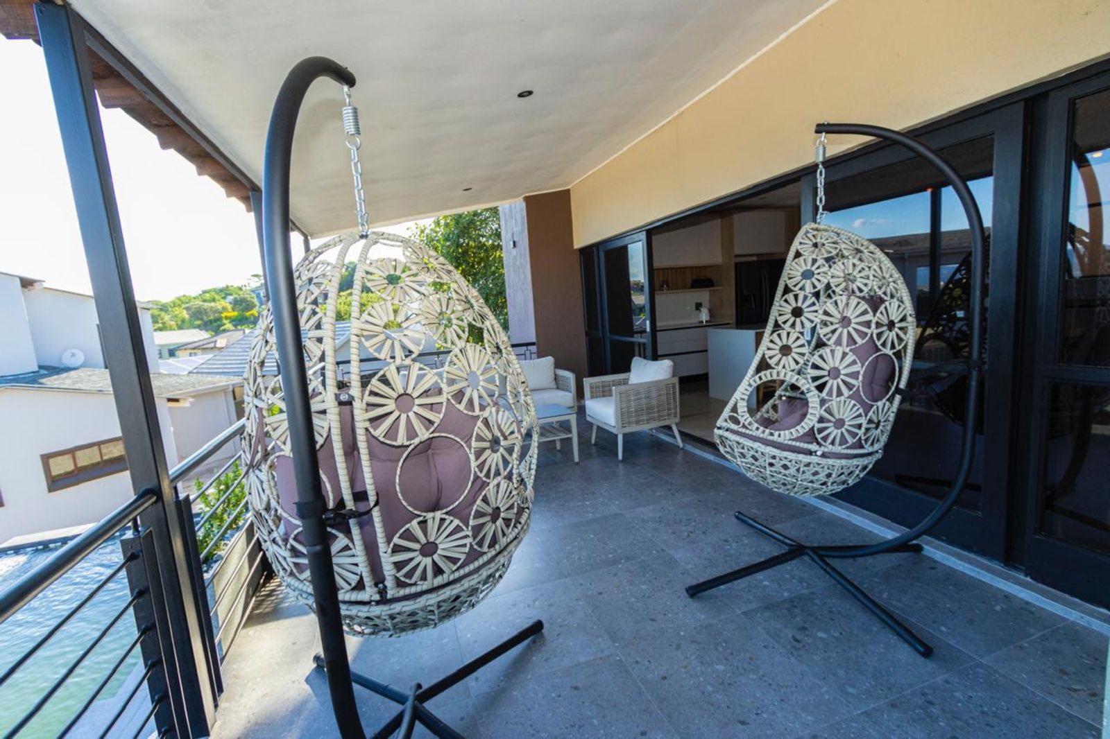 The open-plan living spaces exude sophistication, featuring a state-of-the-art kitchen with granite countertops, high-end appliances, and a center island. The dining area seamlessly flows into the stylish lounge, which opens onto a covered patio, perfect for outdoor entertainment.