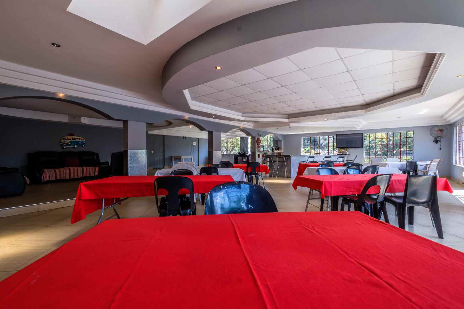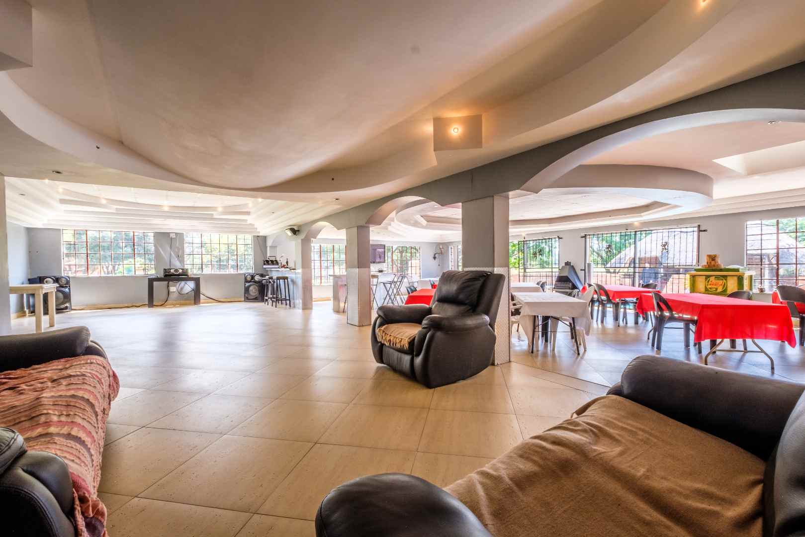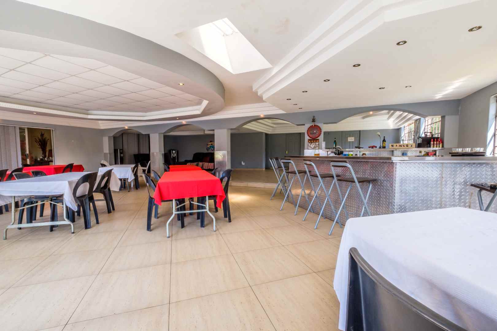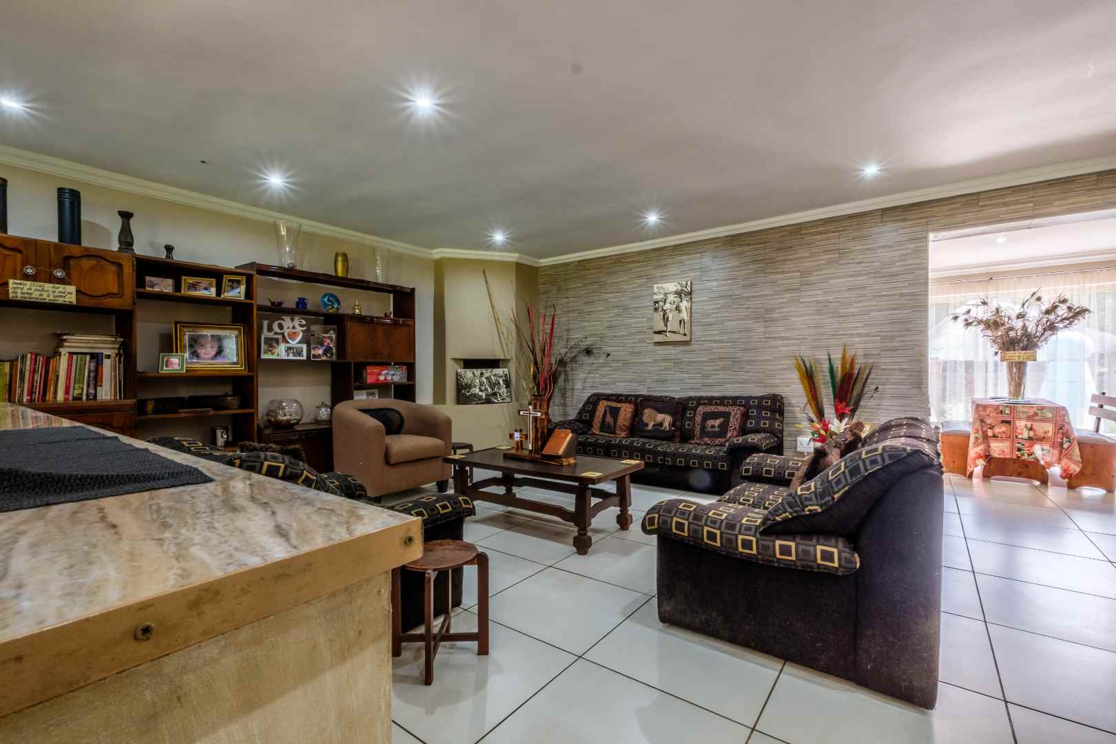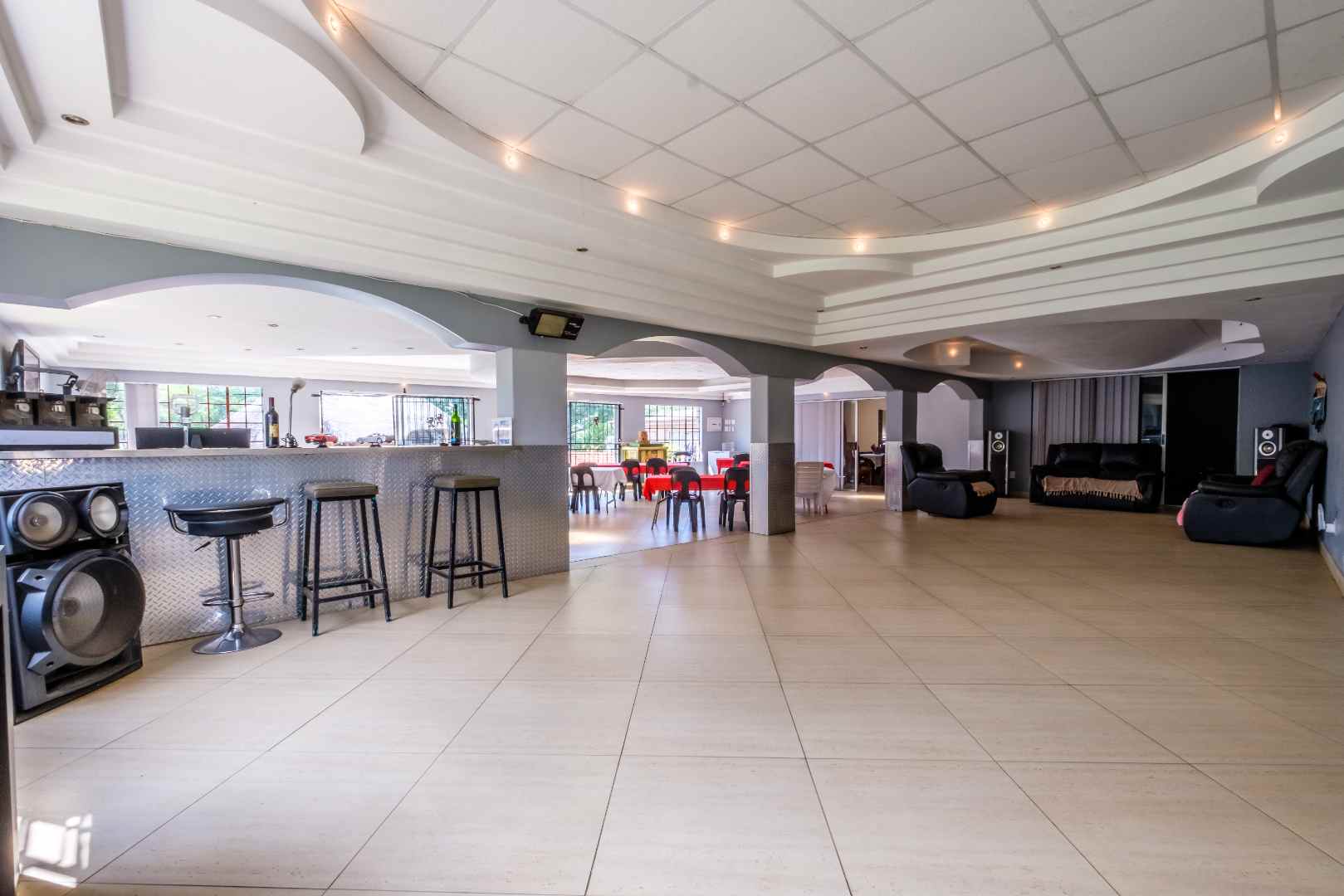 Then, leading off of both the dining area and the central media room is the massive entertainment space. About 200 square meters, tiled, with feature ceiling, built-in bar and commercial-standard toilet facilities, which then leads out onto the pool and lapa, with built-in braai and pizza oven