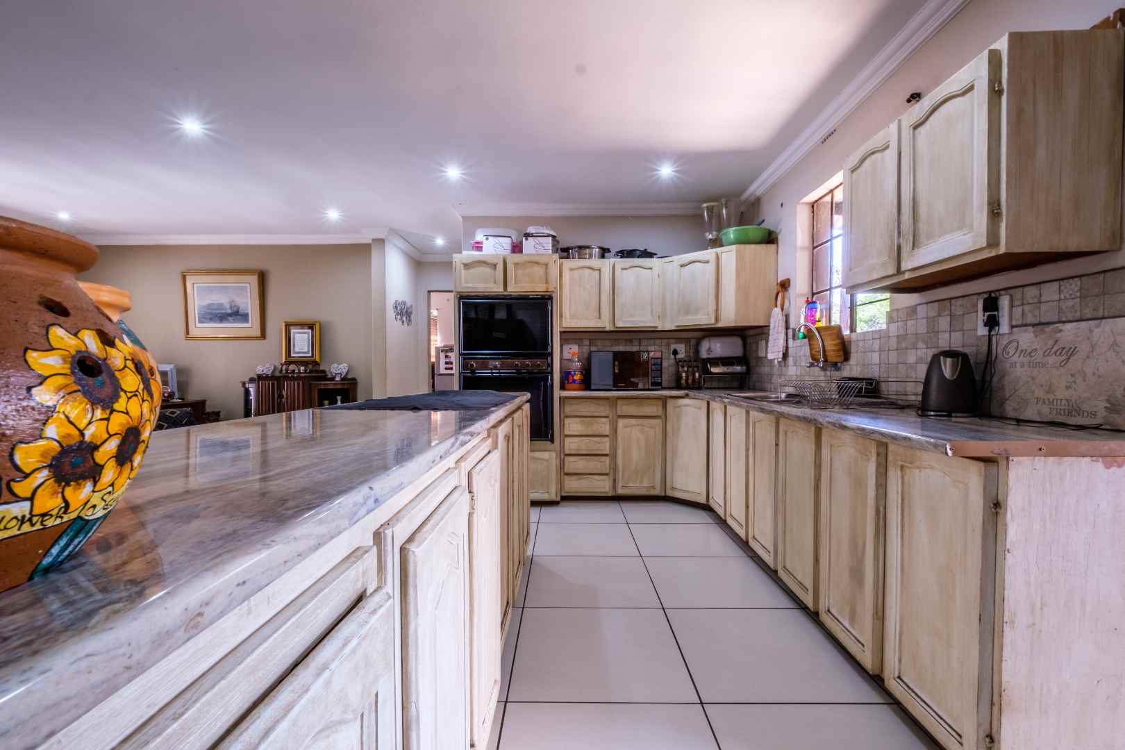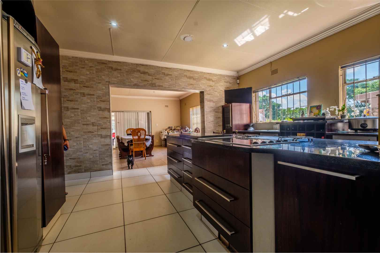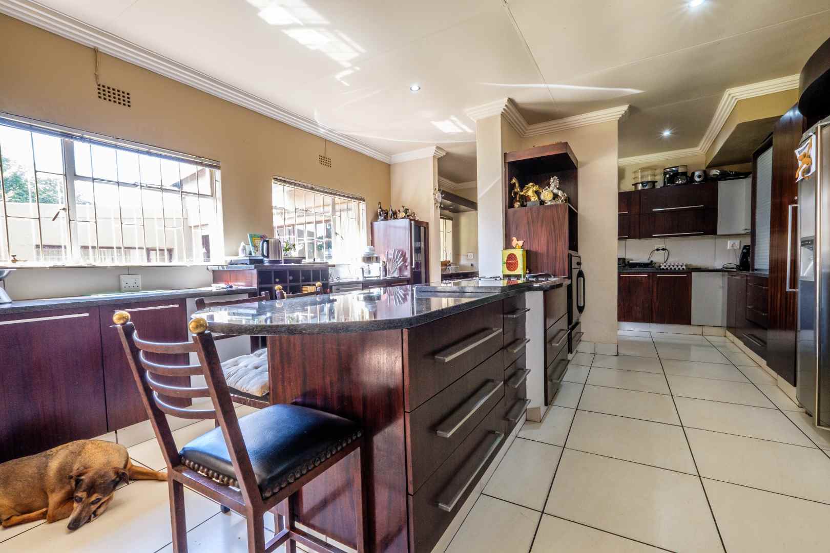 To the other side, the functional and stylish kitchen. With a large centre island, beautifully-fitted in dark-wood cabinetry and black granite. Besides the privacy of the initial scullery area, there’s a separate additional, functional and well-fitted scullery/laundry room. The kitchen also opens, via a semi open-plan design, to a spacious dining area