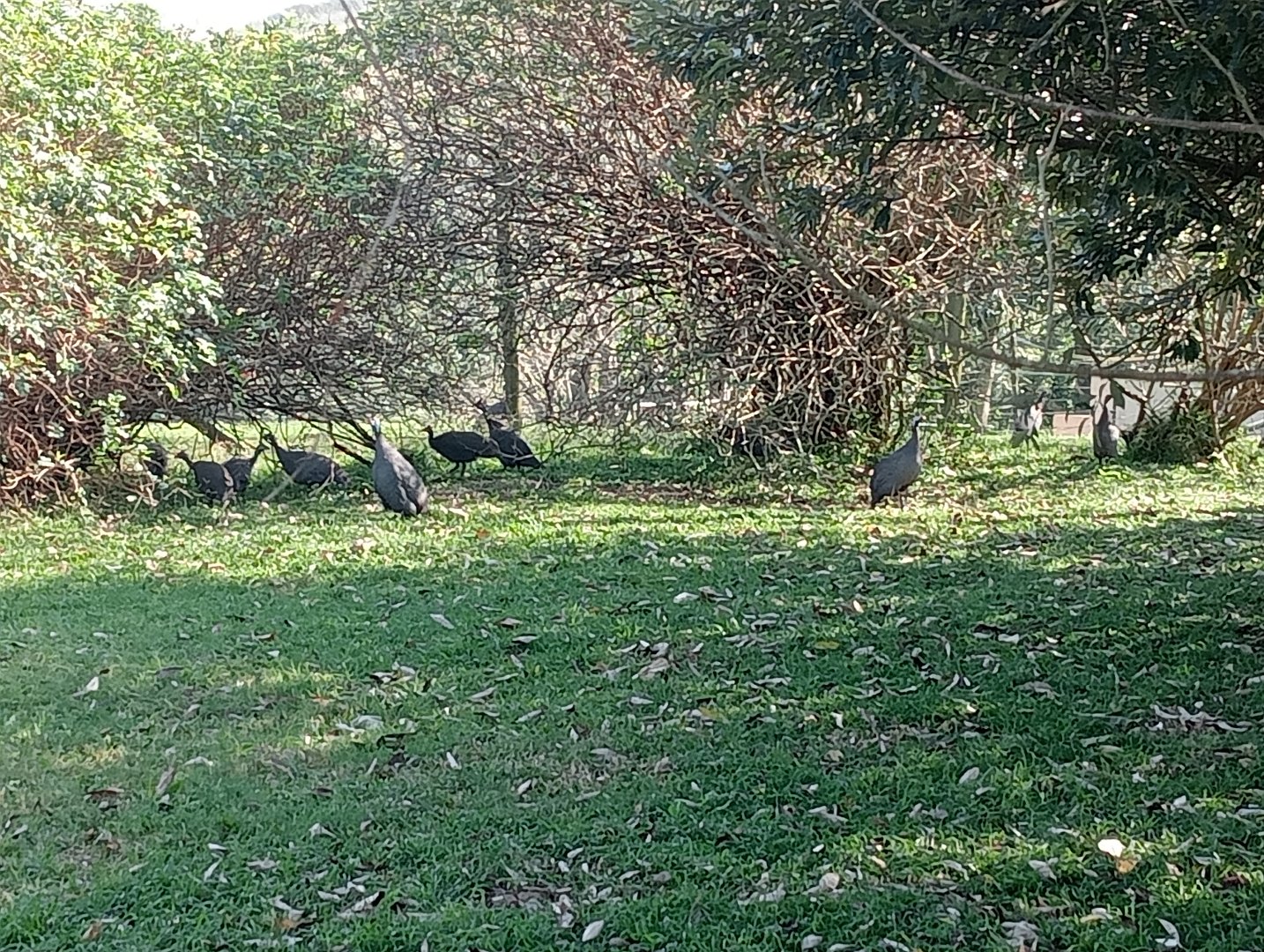 50+ Wild Guinea Fowl and 2x Grey Duikers roam freely around the property.