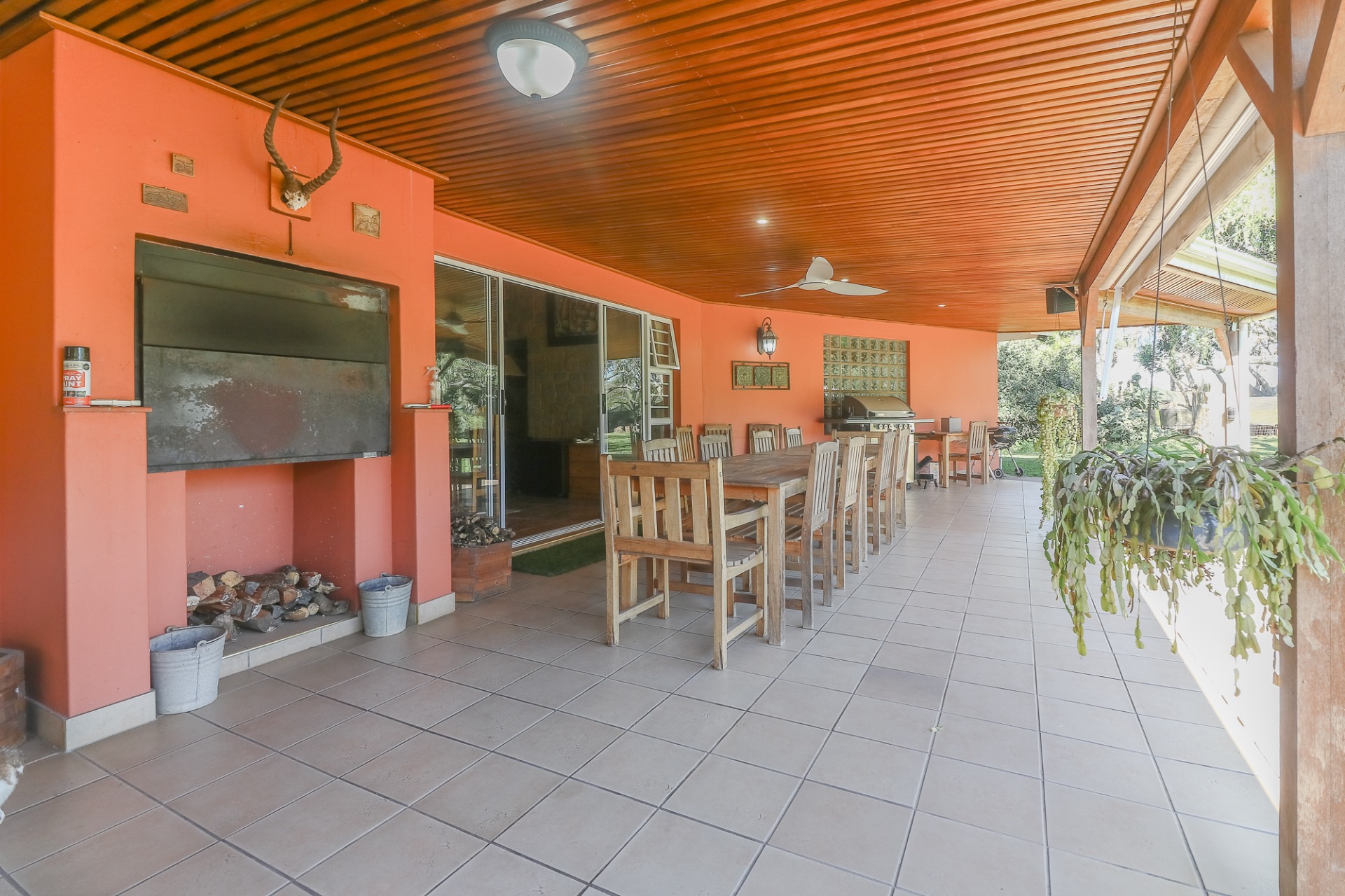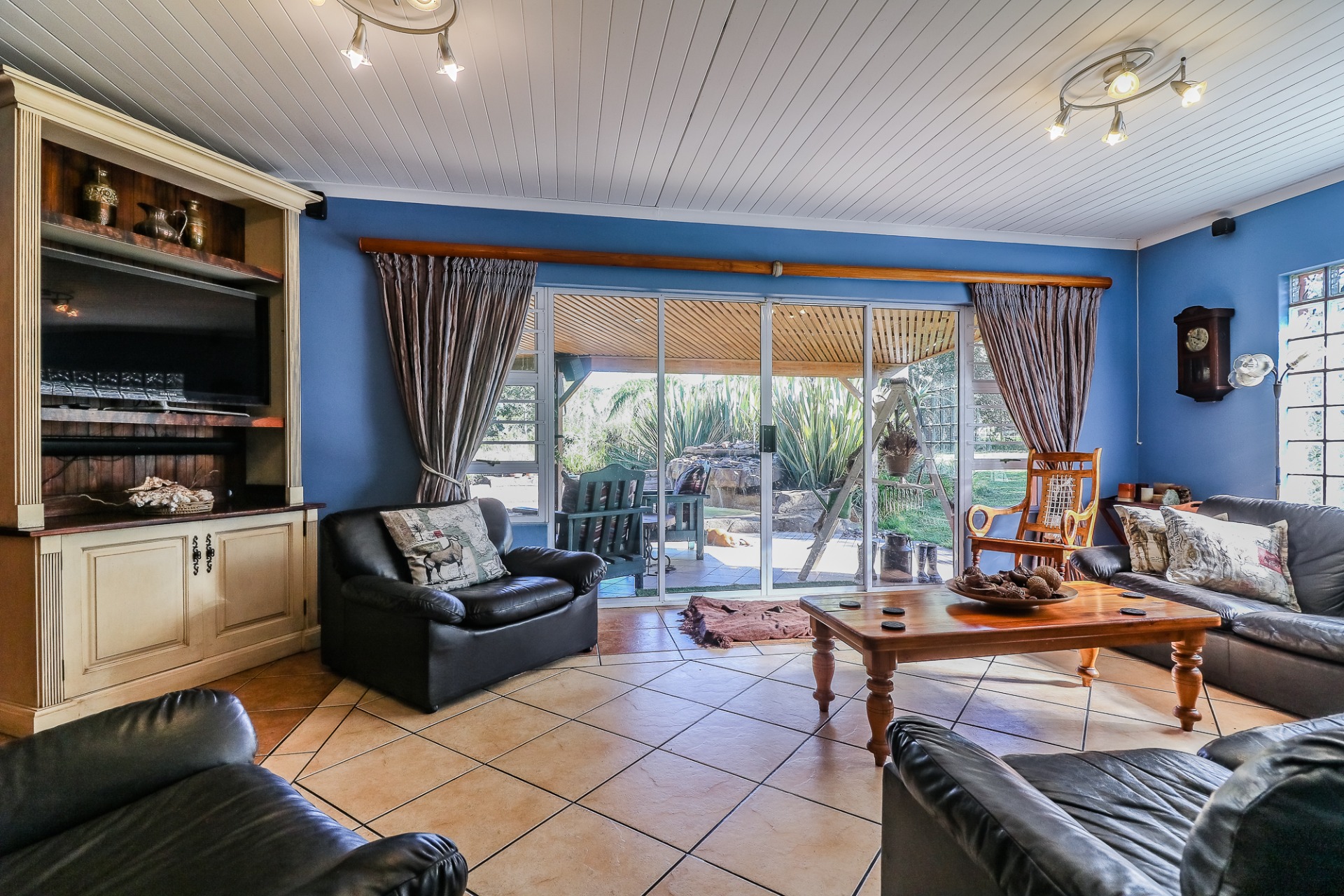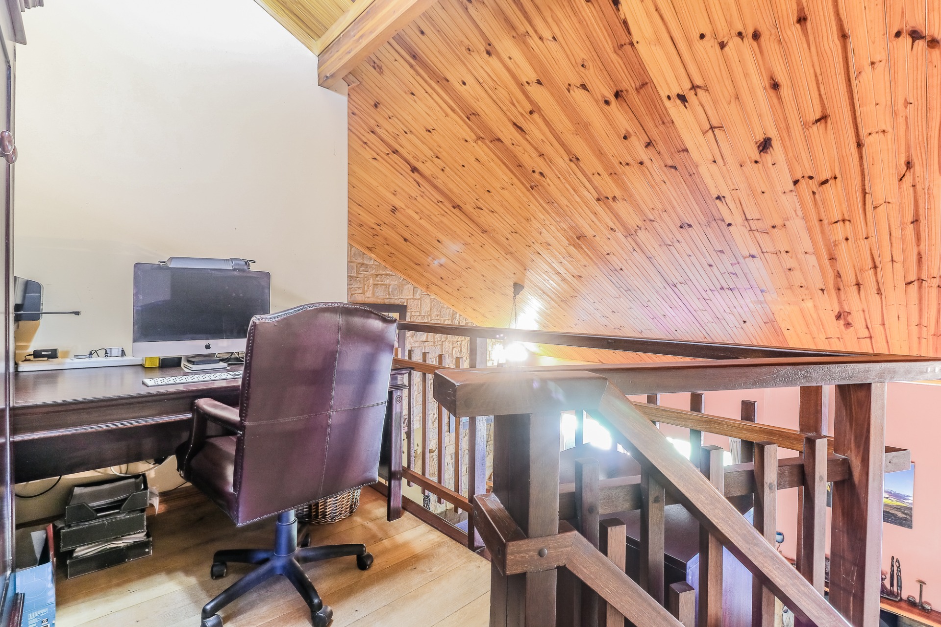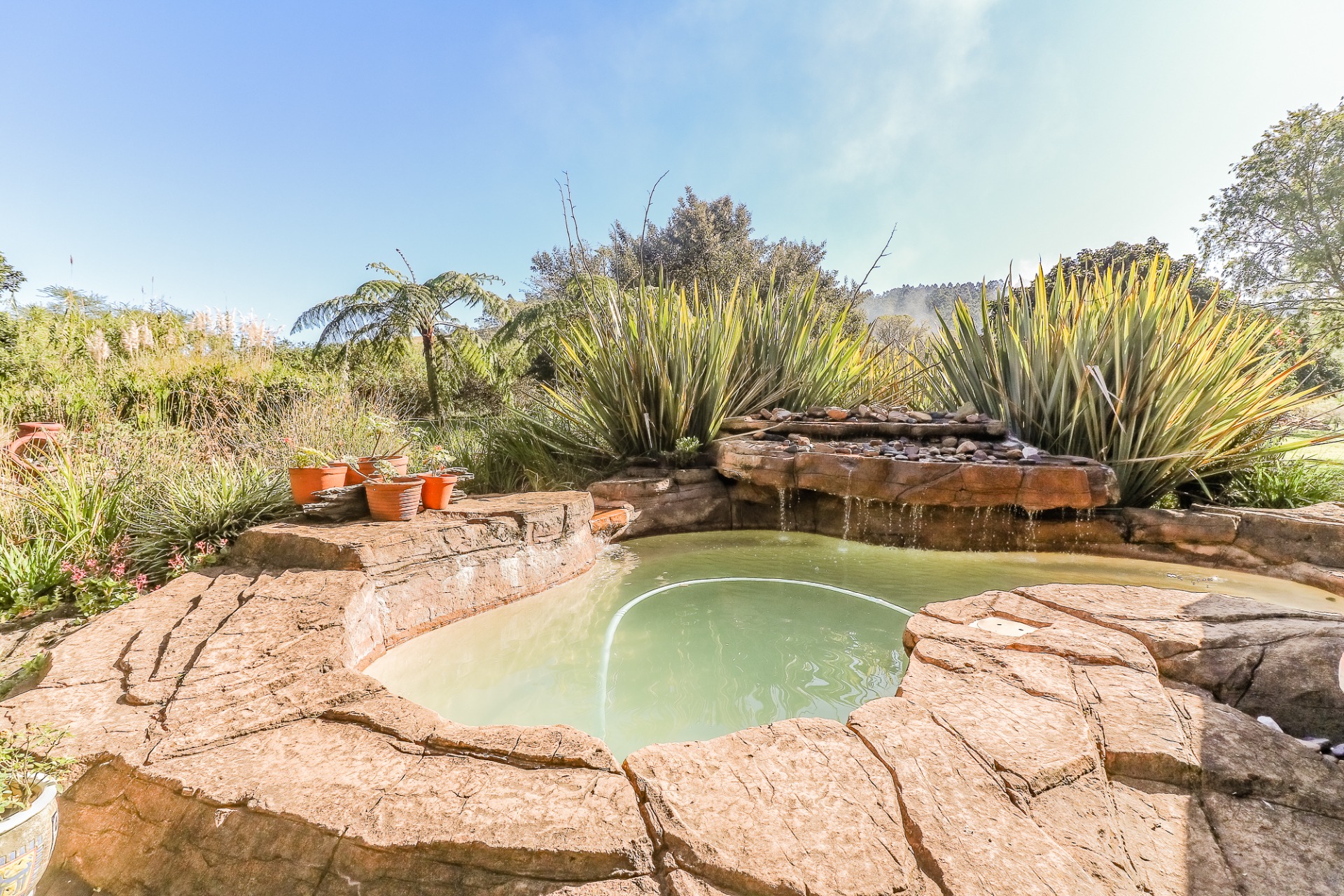 The pub, open plan dining room & lounge with feature fireplace offer warmth, charm & opens onto a deep all weather verandah with built braai. Accessed via large sliding glass doors, It runs the entire length of the house & extends onto the garden with pool & feature waterfall.