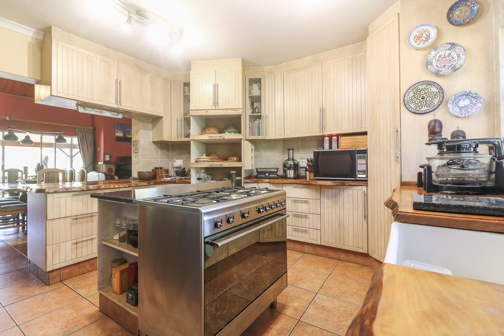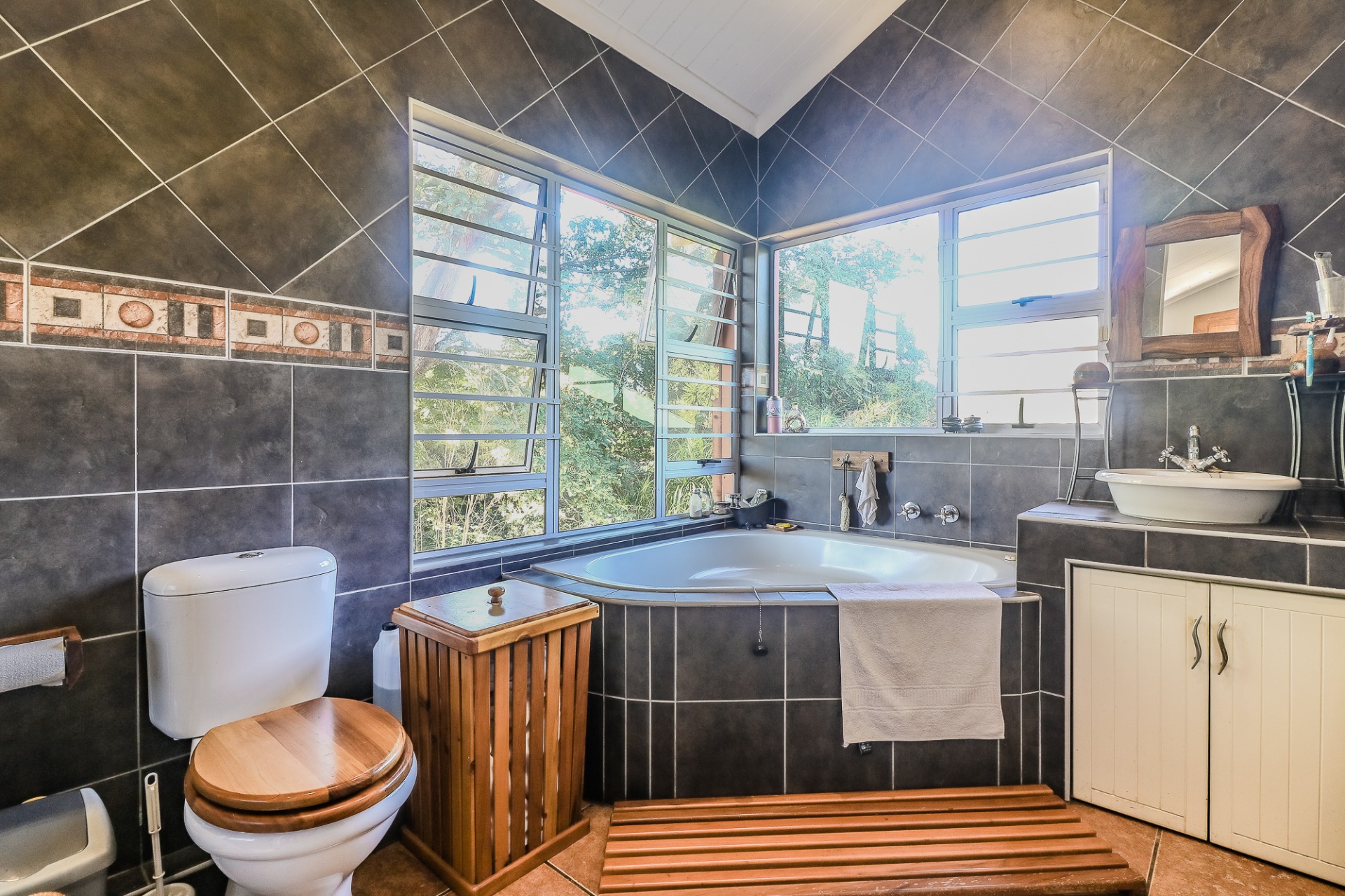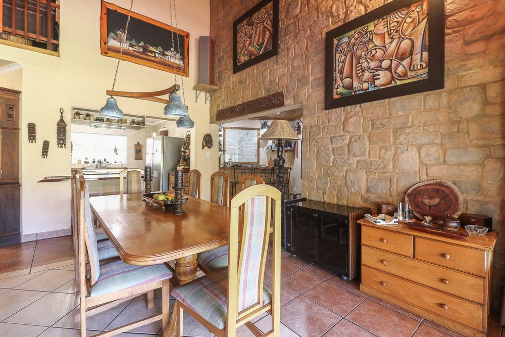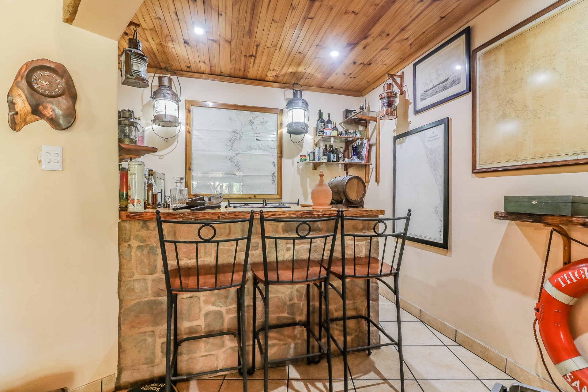 The pub, open plan dining room & lounge with feature fireplace offer warmth, charm & opens onto a deep all weather verandah with built braai. Accessed via large sliding glass doors, It runs the entire length of the house & extends onto the garden with pool & feature waterfall.