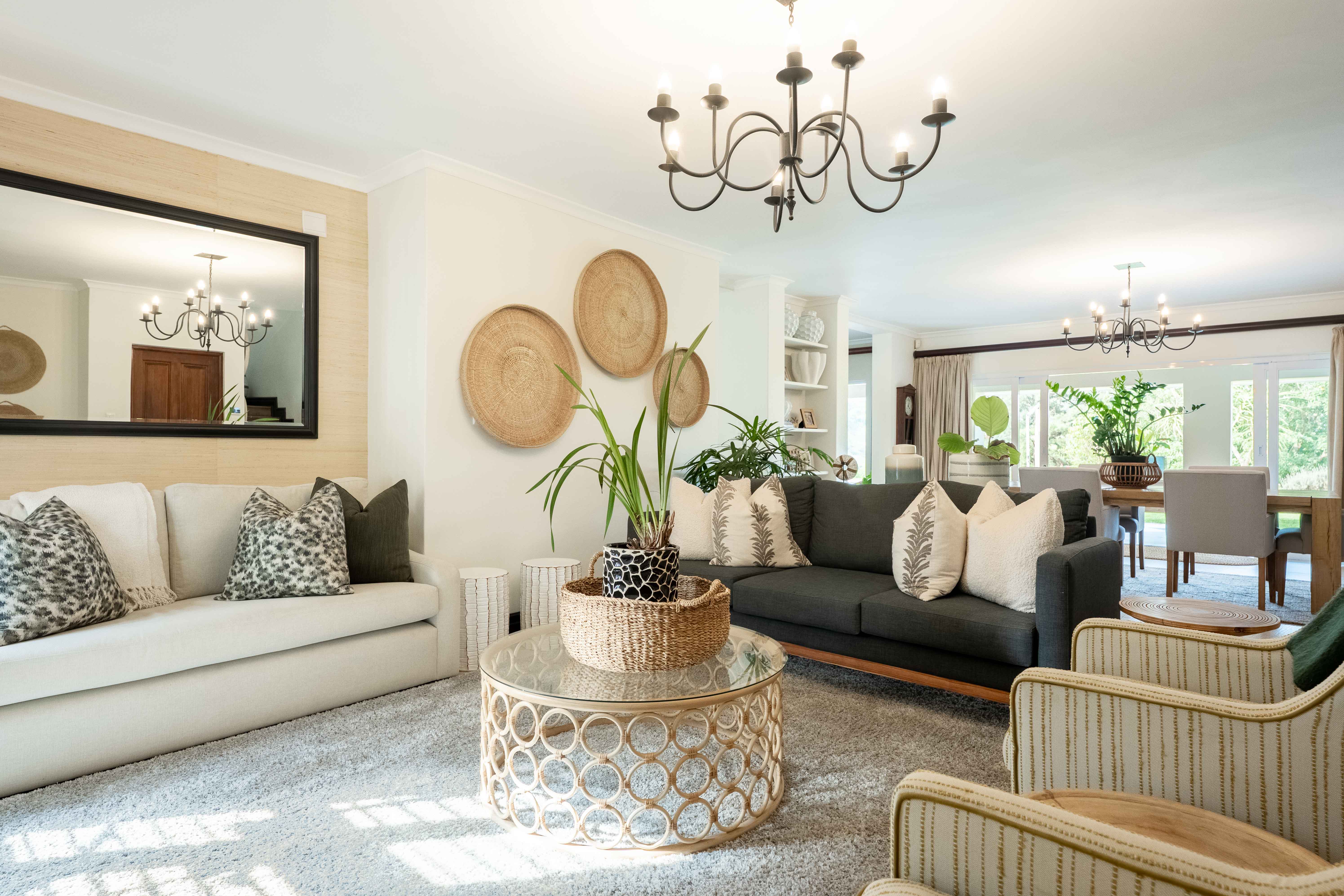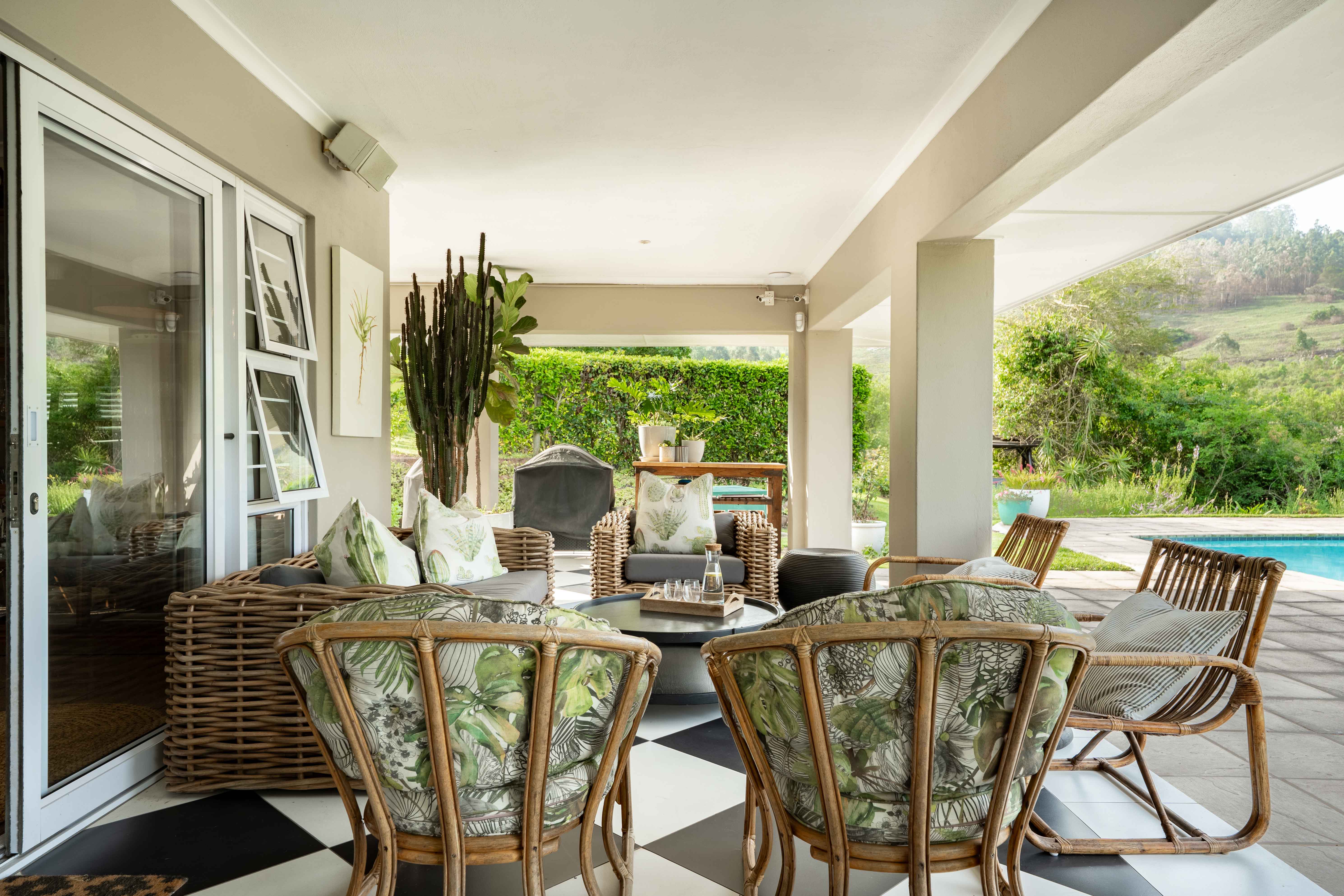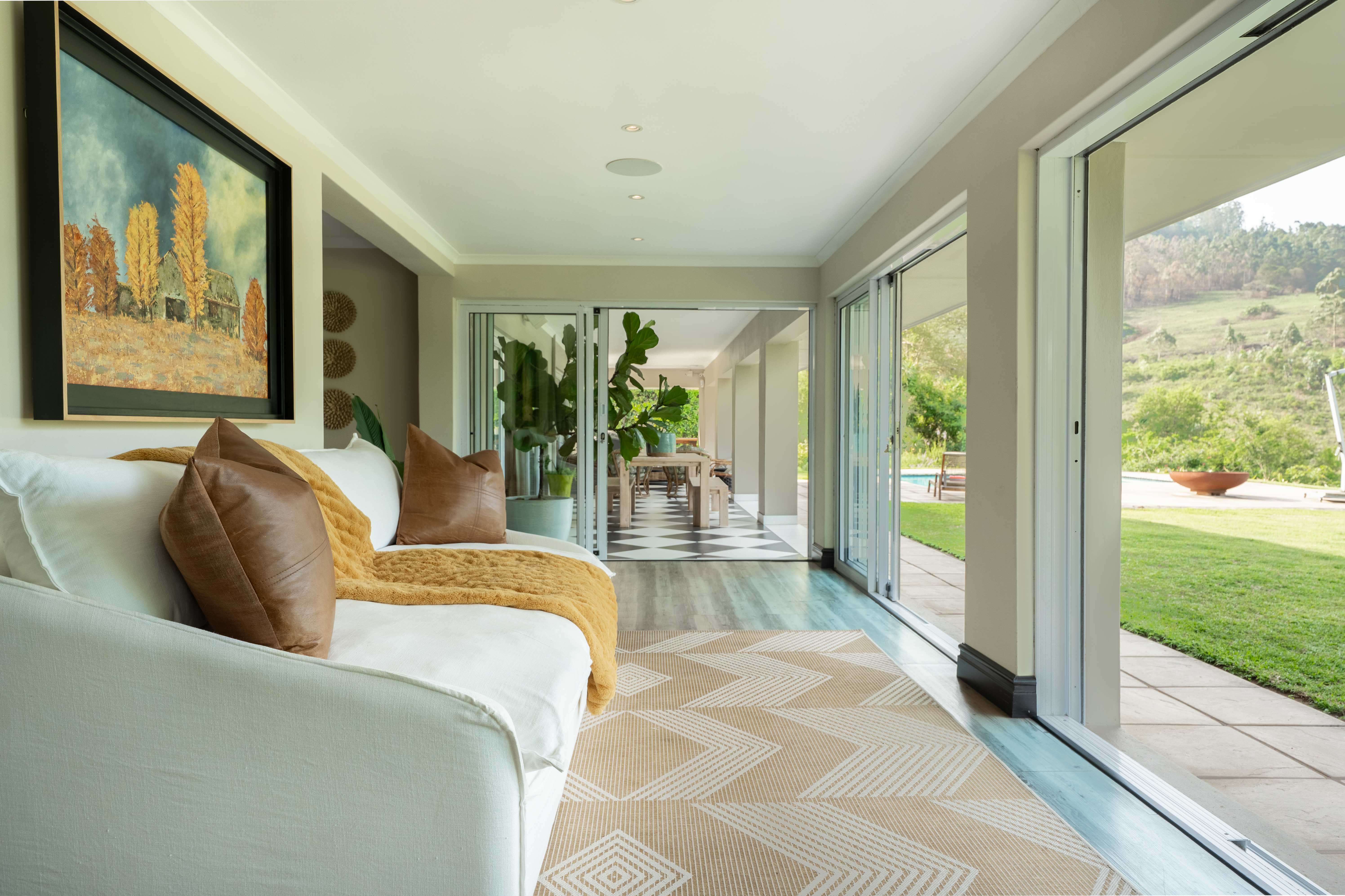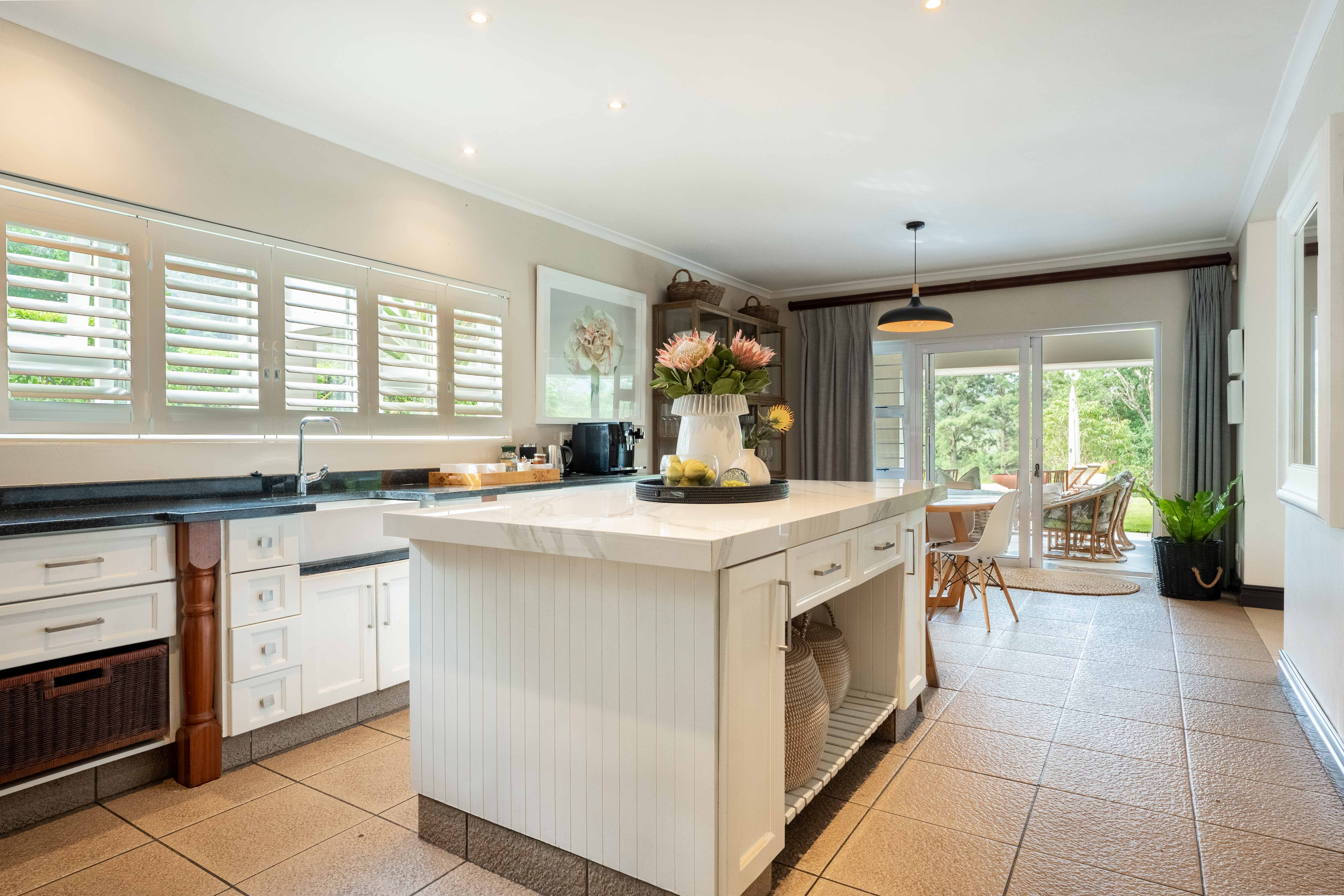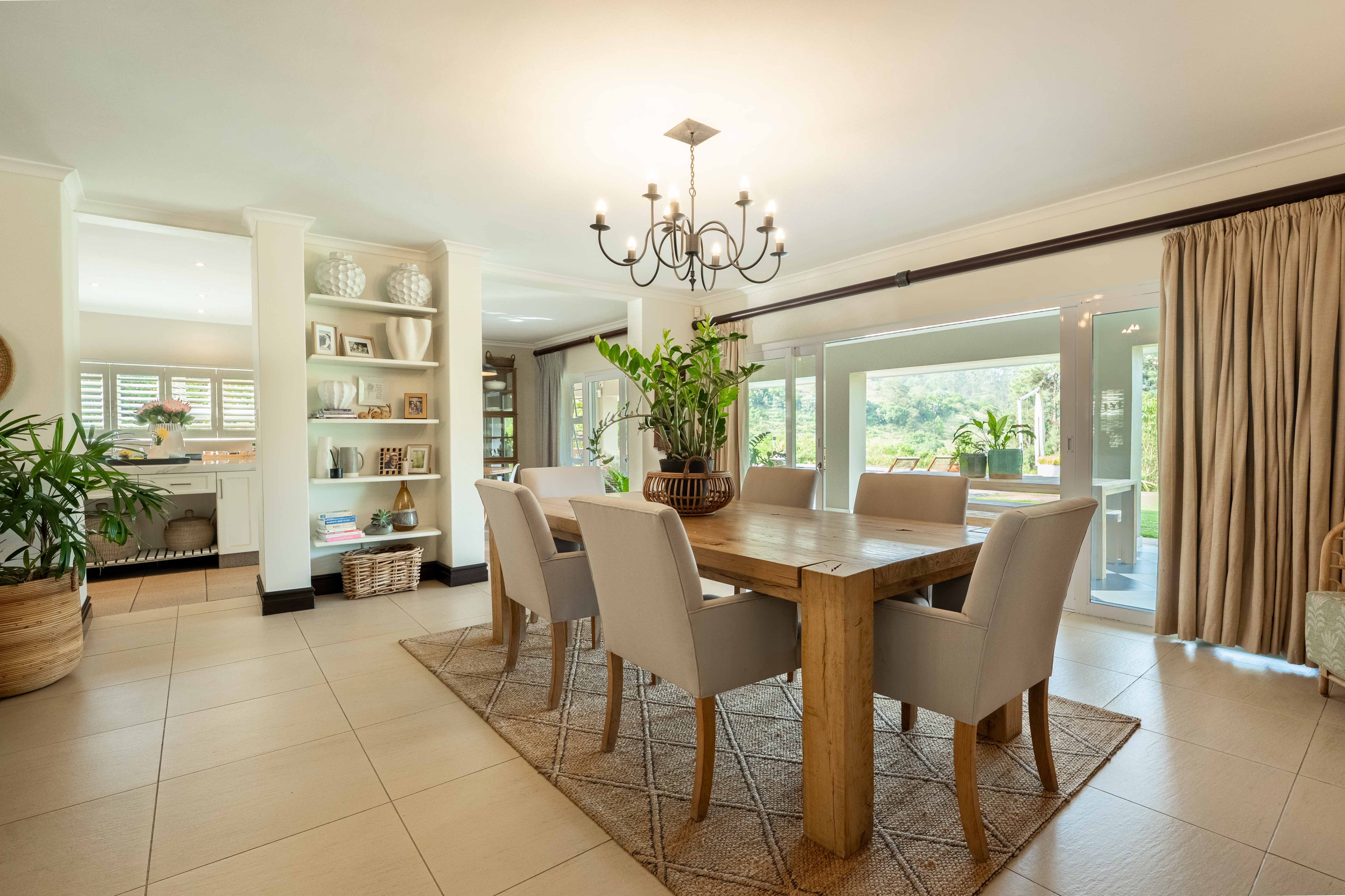 Designed for luxury living, the home welcomes you with light-filled open-plan spaces, a seamless flow, and high-end finishes throughout. The ground floor features a stunning open plan space including a formal lounge with a log-burning fireplace, a dining area that easily seats ten, and a spectacular chef’s kitchen fitted with quartz and granite countertops, a Smeg gas stove, and a spacious scullery. For the entertainer, a separate entertainment lounge with a custom-designed bar and wine cellar opens through folding stacking doors onto a wide wrap around verandah overlooking the sparkling pool and breathtaking views of rolling countryside.