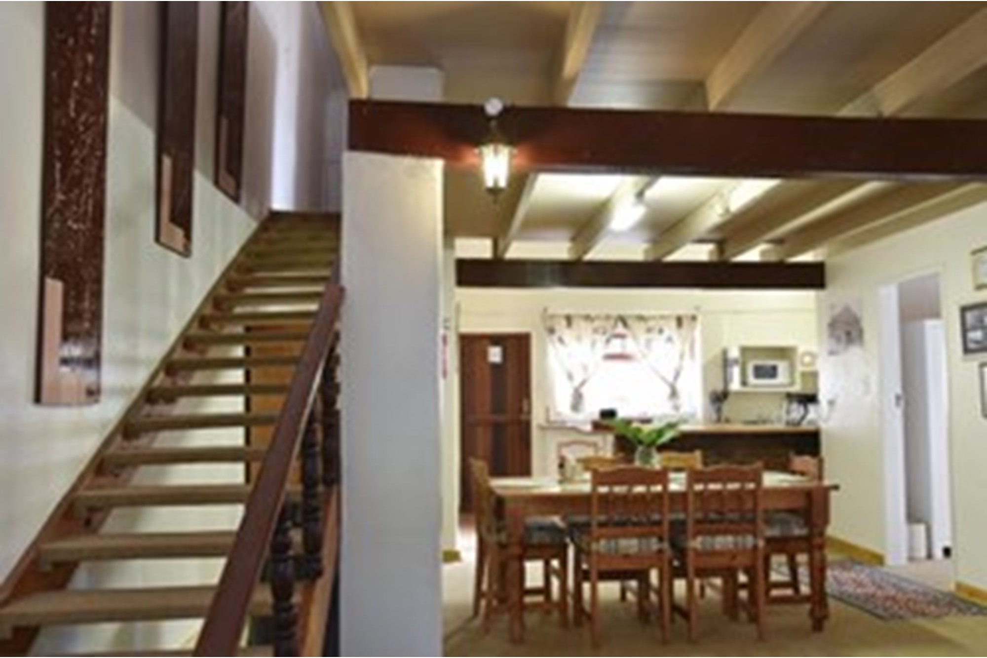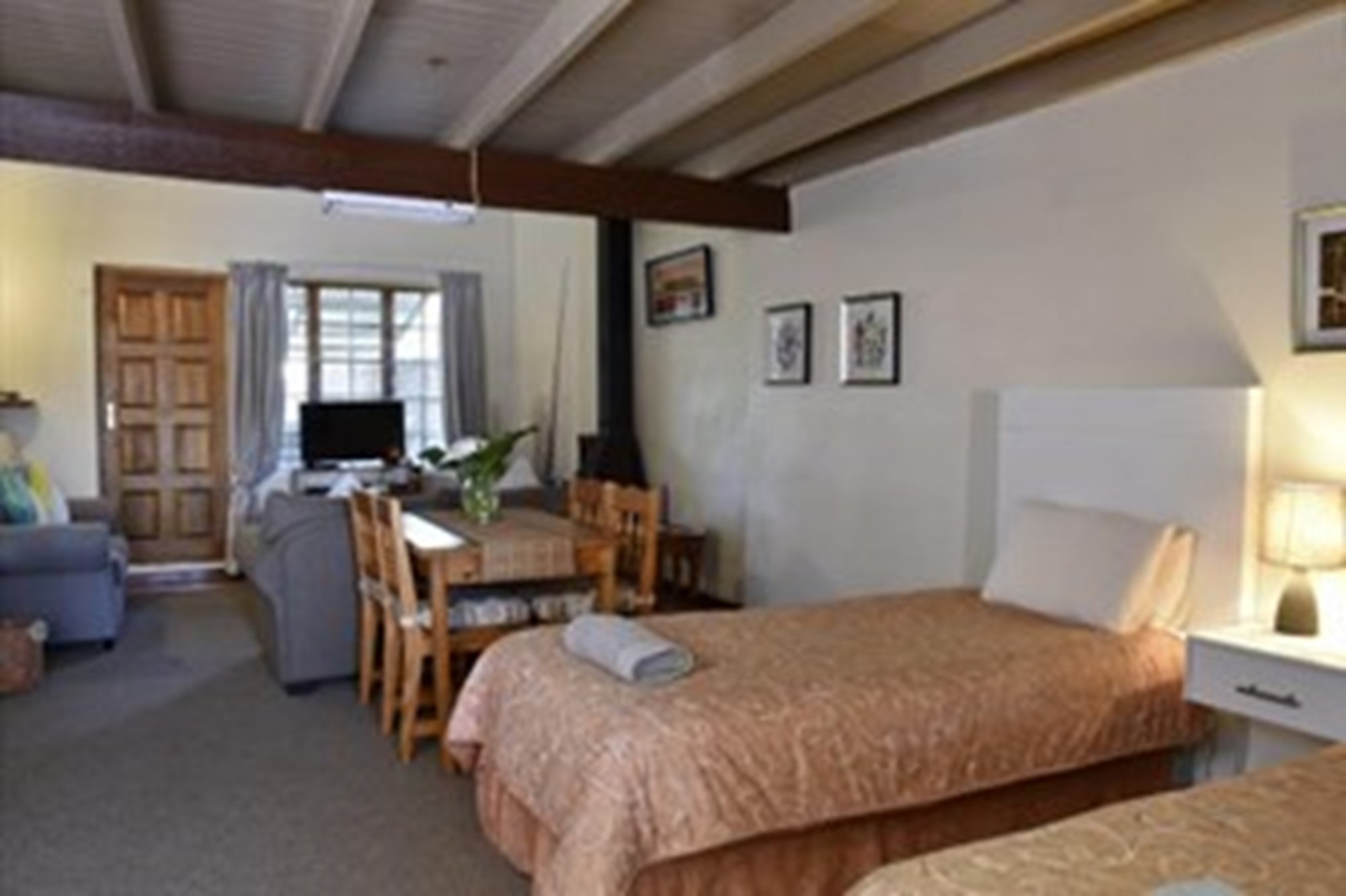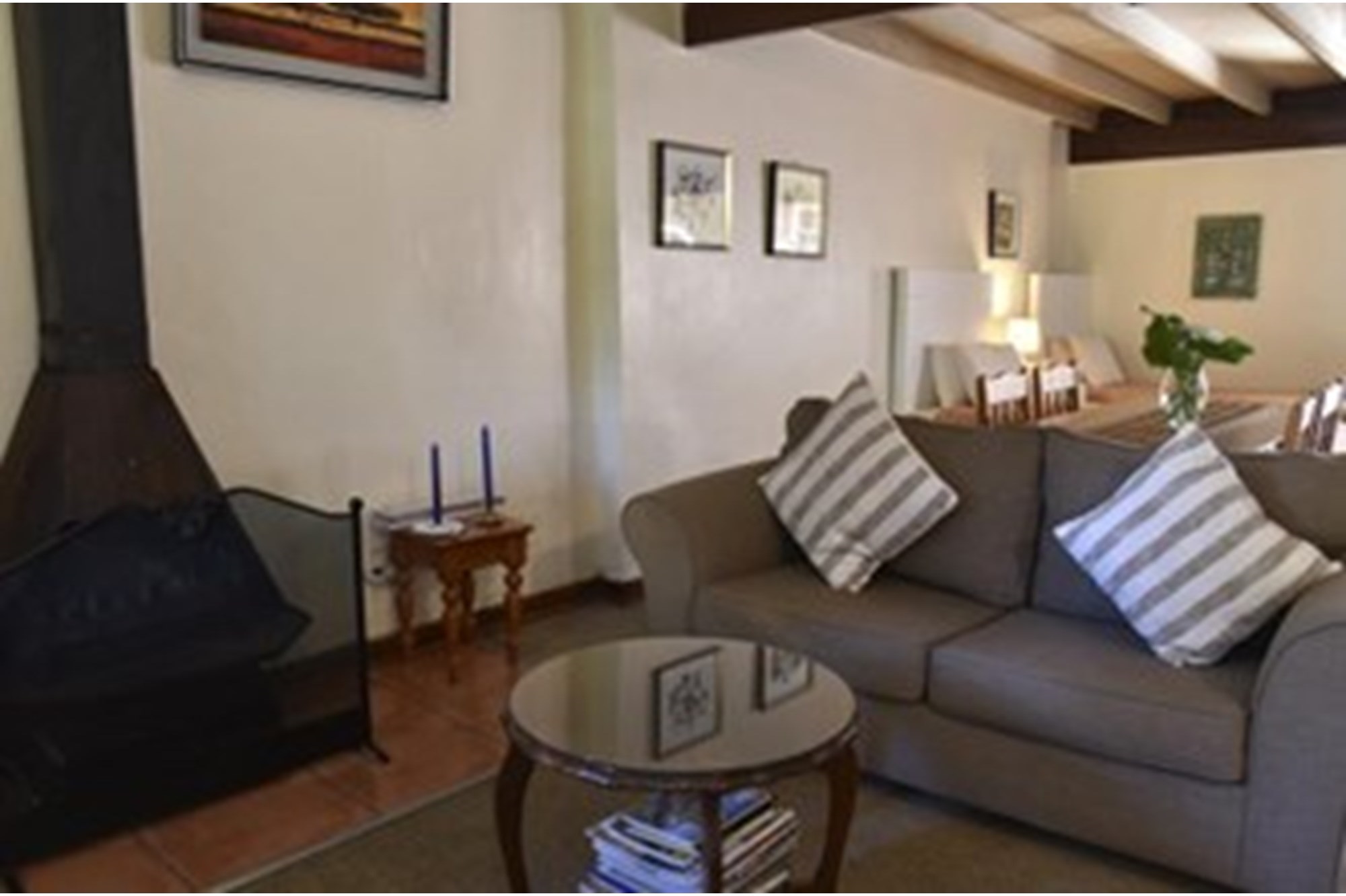 The cozy Memoir Cottage is a two-bedroom retreat ideal for smaller groups. It features an open-plan lounge and fully equipped kitchen. The downstairs bedroom has two single beds and an en-suite bathroom, while the upstairs bedroom offers a queen-size bed and an en-suite bathroom. The lounge leads out to a patio with braai facilities, providing the perfect spot to unwind after a day of exploring.