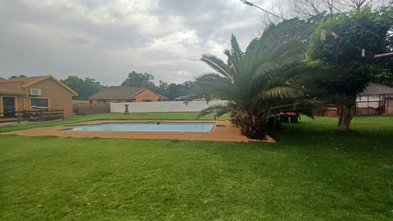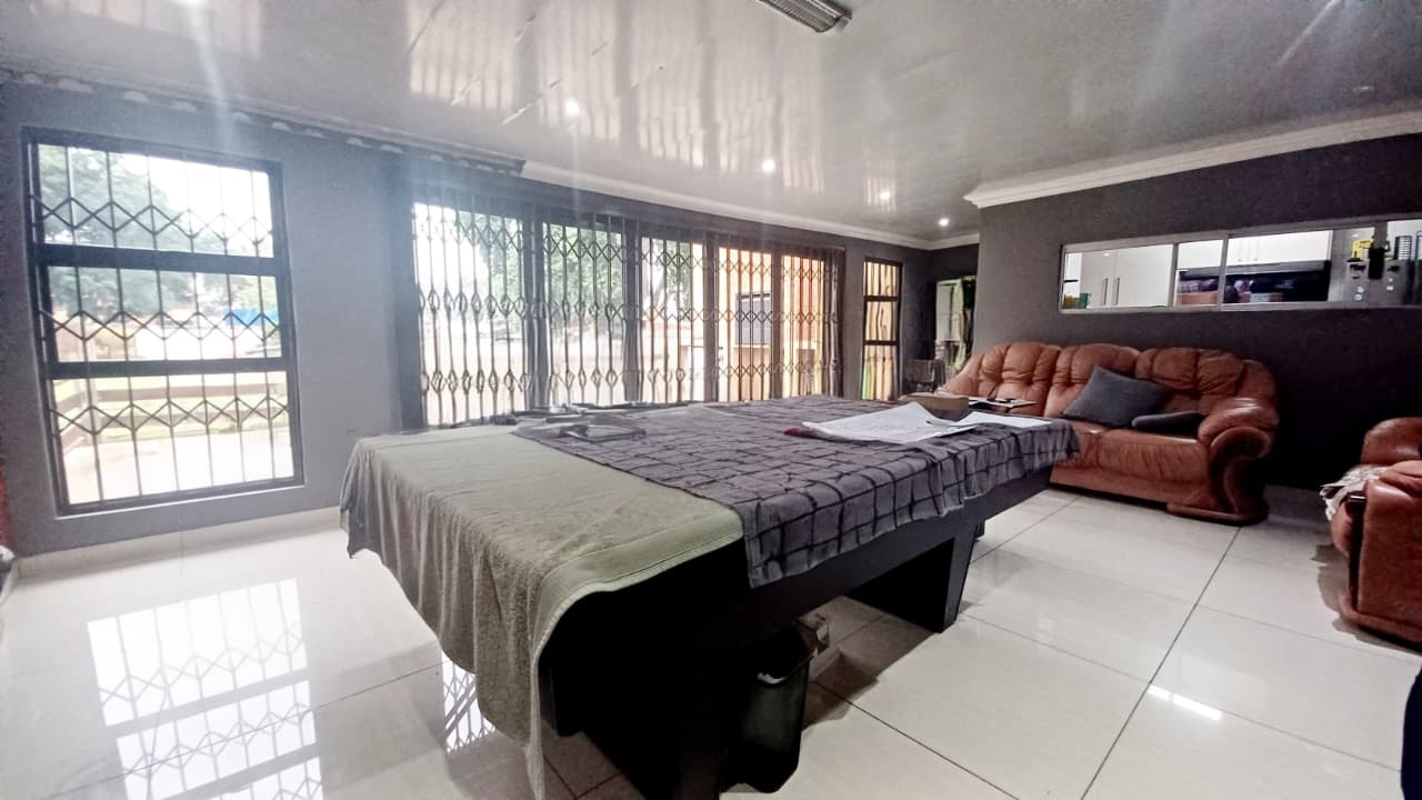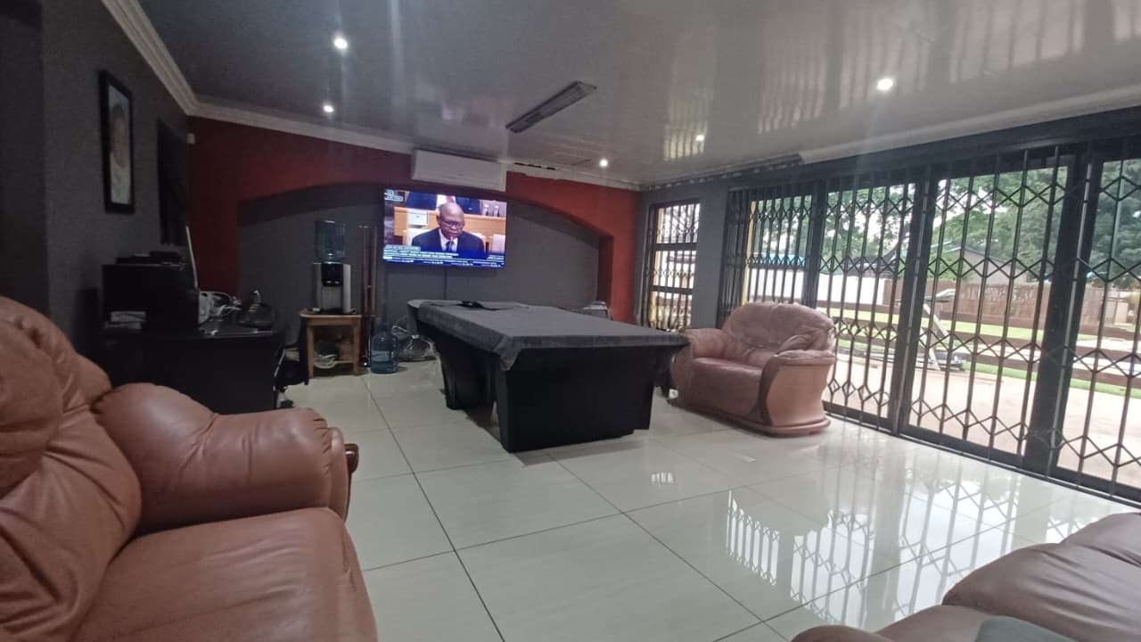 - A large entertainment room with a big window and sliding doors leading to the outside patio with a braai area and swimming pool
