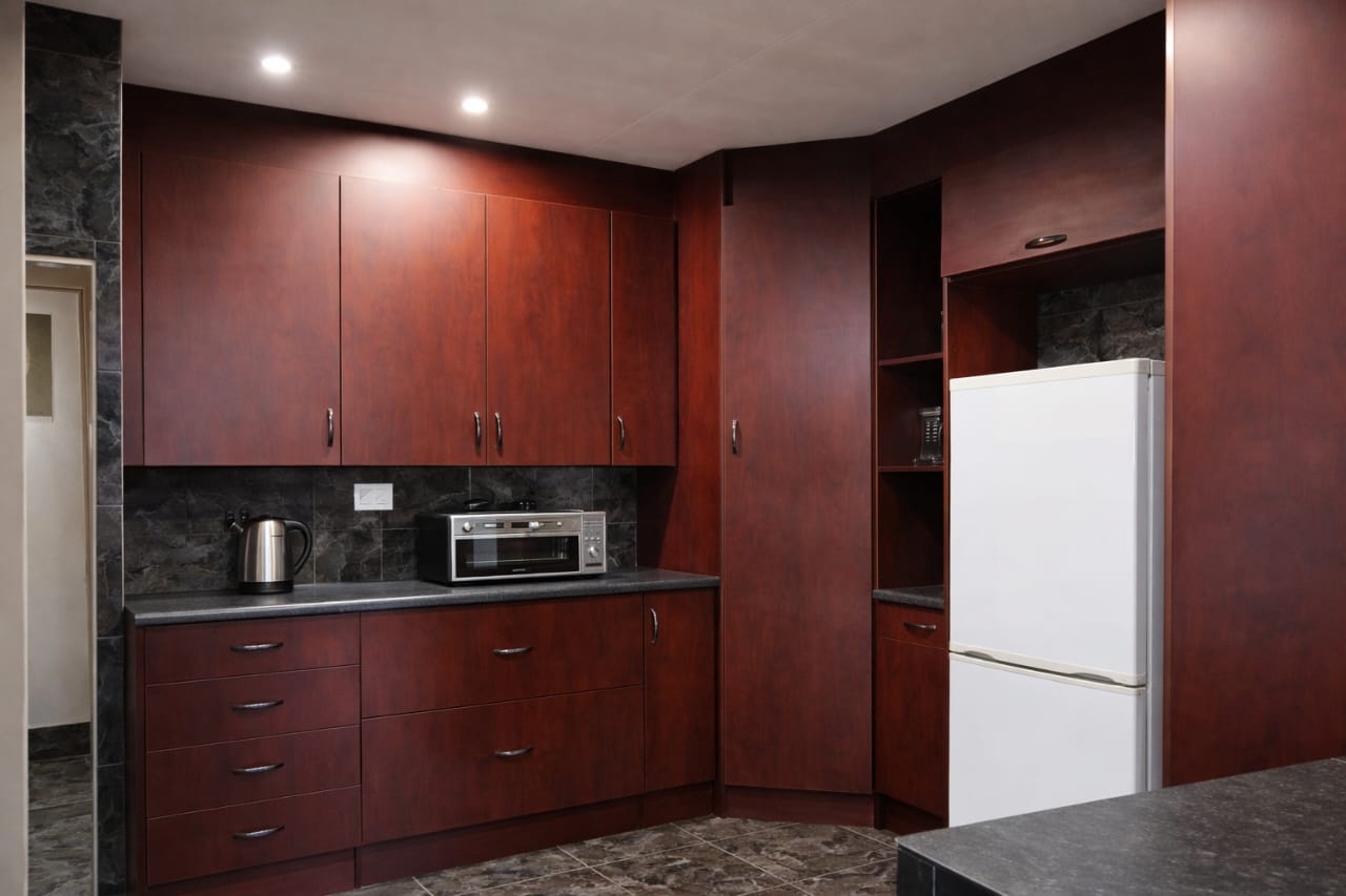 - Kitchen with ample storage and space for dining