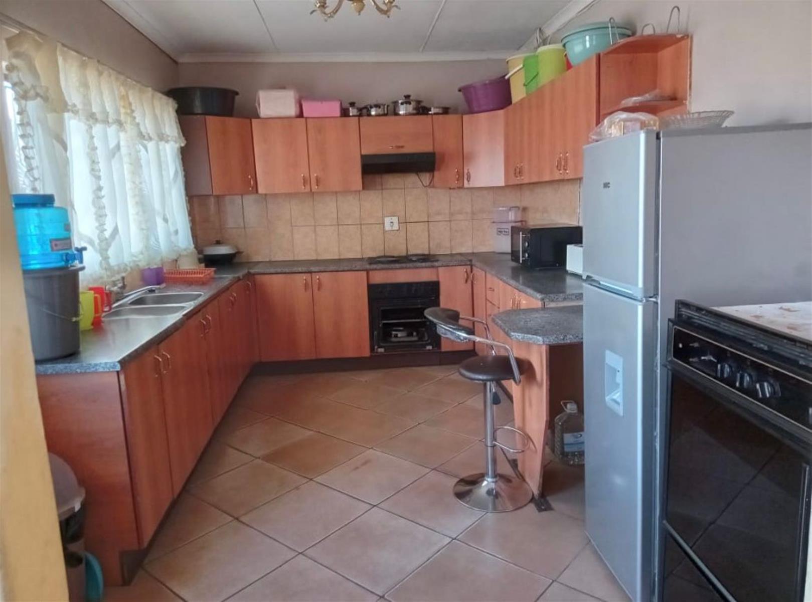 The interior of the house features a modern touch with fully tiled floors that make cleaning easy and give the home a sleek, fresh look. The kitchen is fitted with built-in cupboards, providing ample storage space and making family gatherings or dinner preparations both enjoyable and convenient.