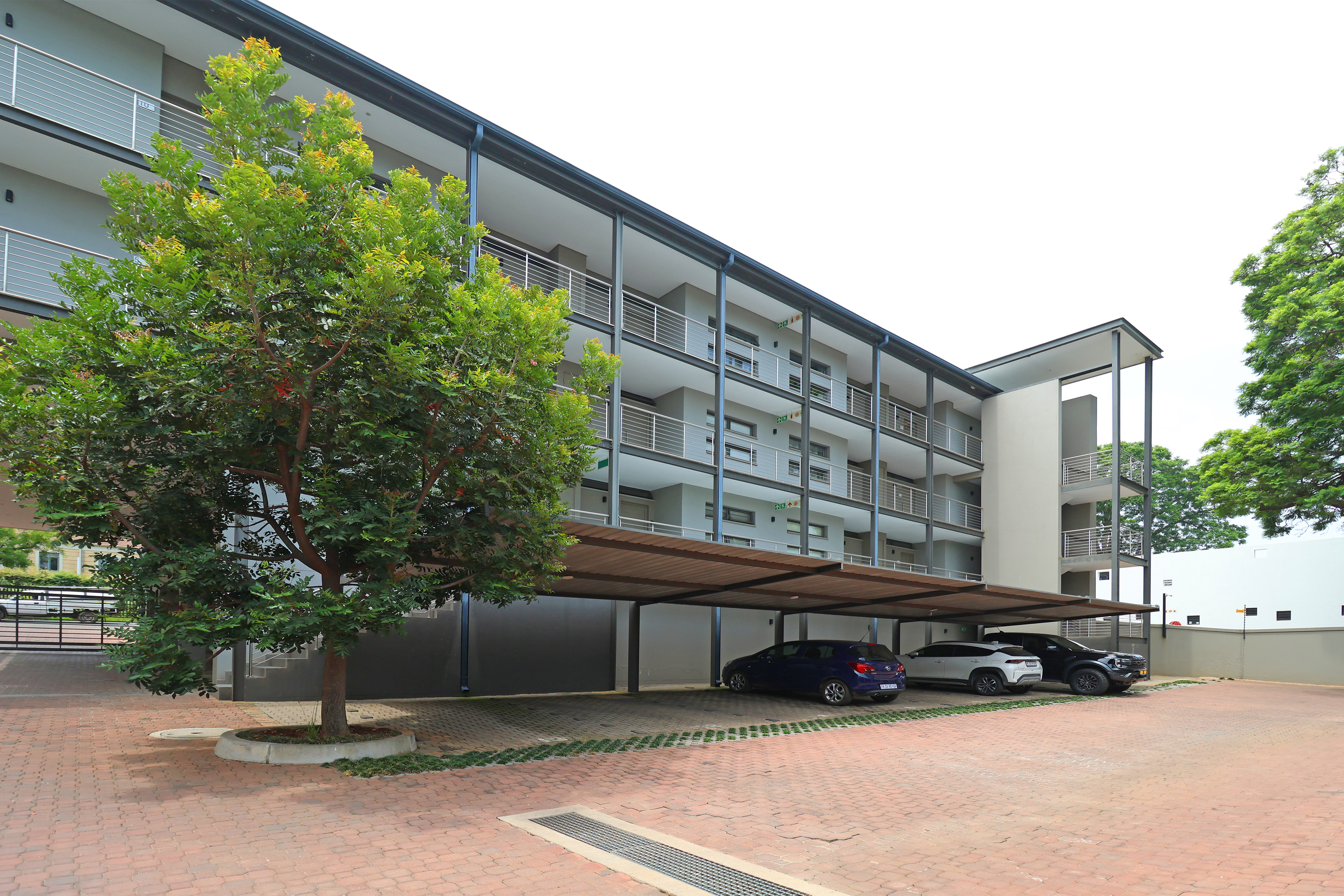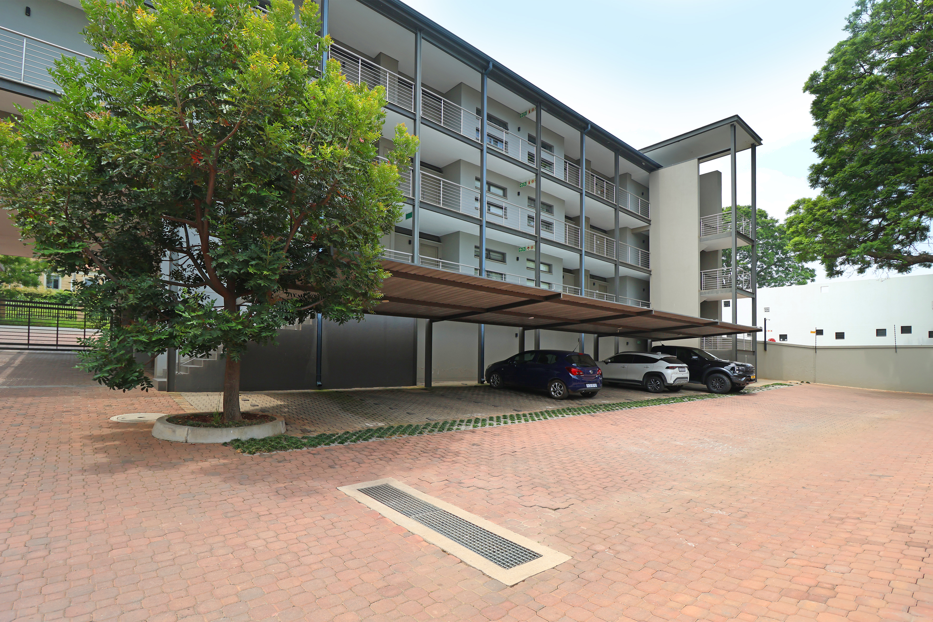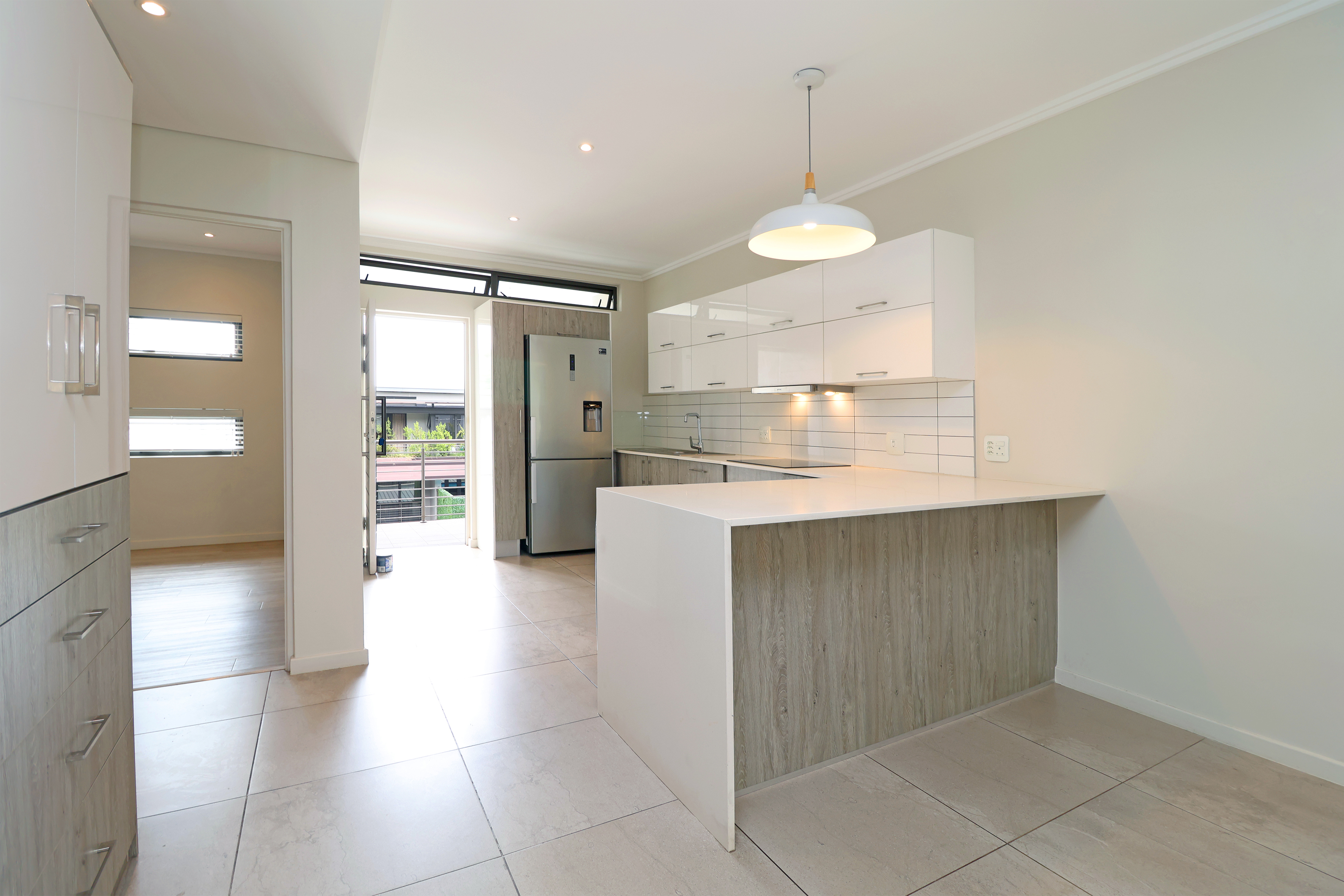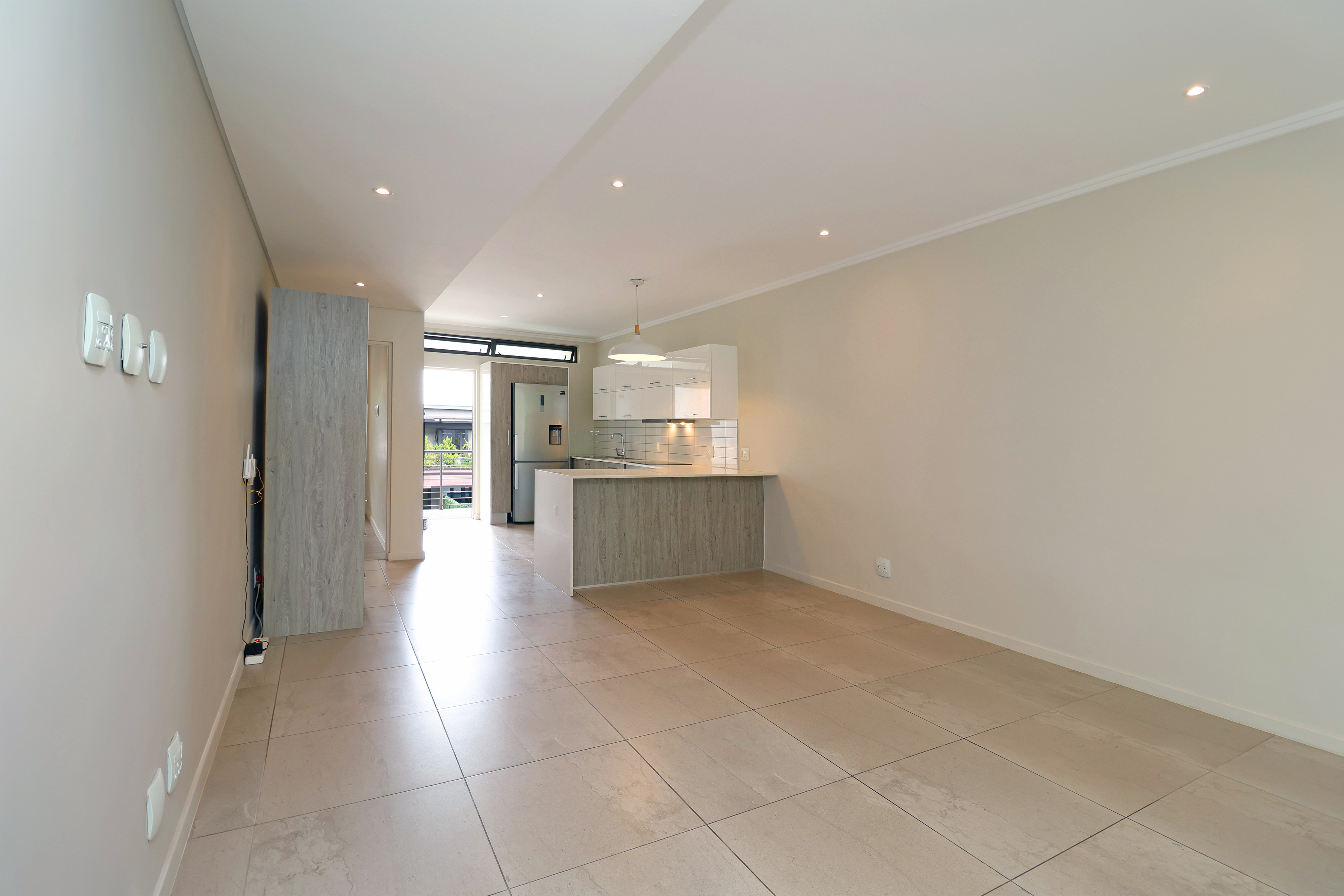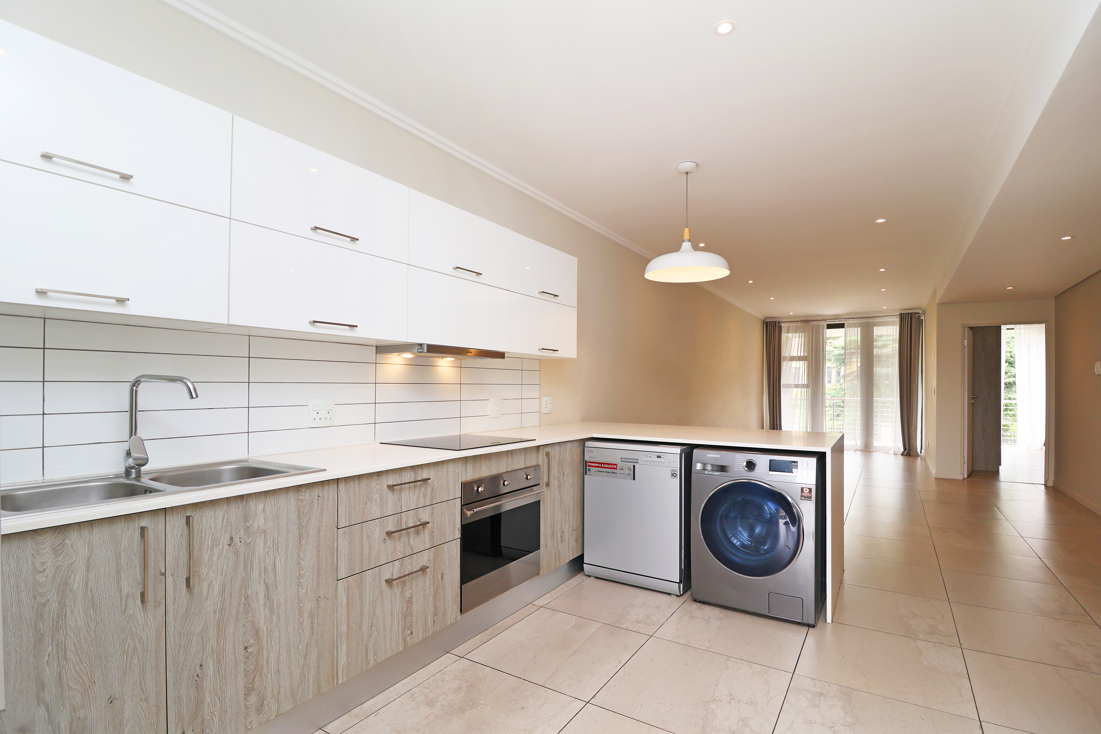 The living area is tiled and flows through floor-to-ceiling stacking doors onto a spacious, fully covered north-facing balcony, creating an ideal space for all-weather entertaining. The kitchen is finished with stylish stone countertops and ample cupboard space, and comes fully equipped with a fridge, washing machine, and dishwasher.