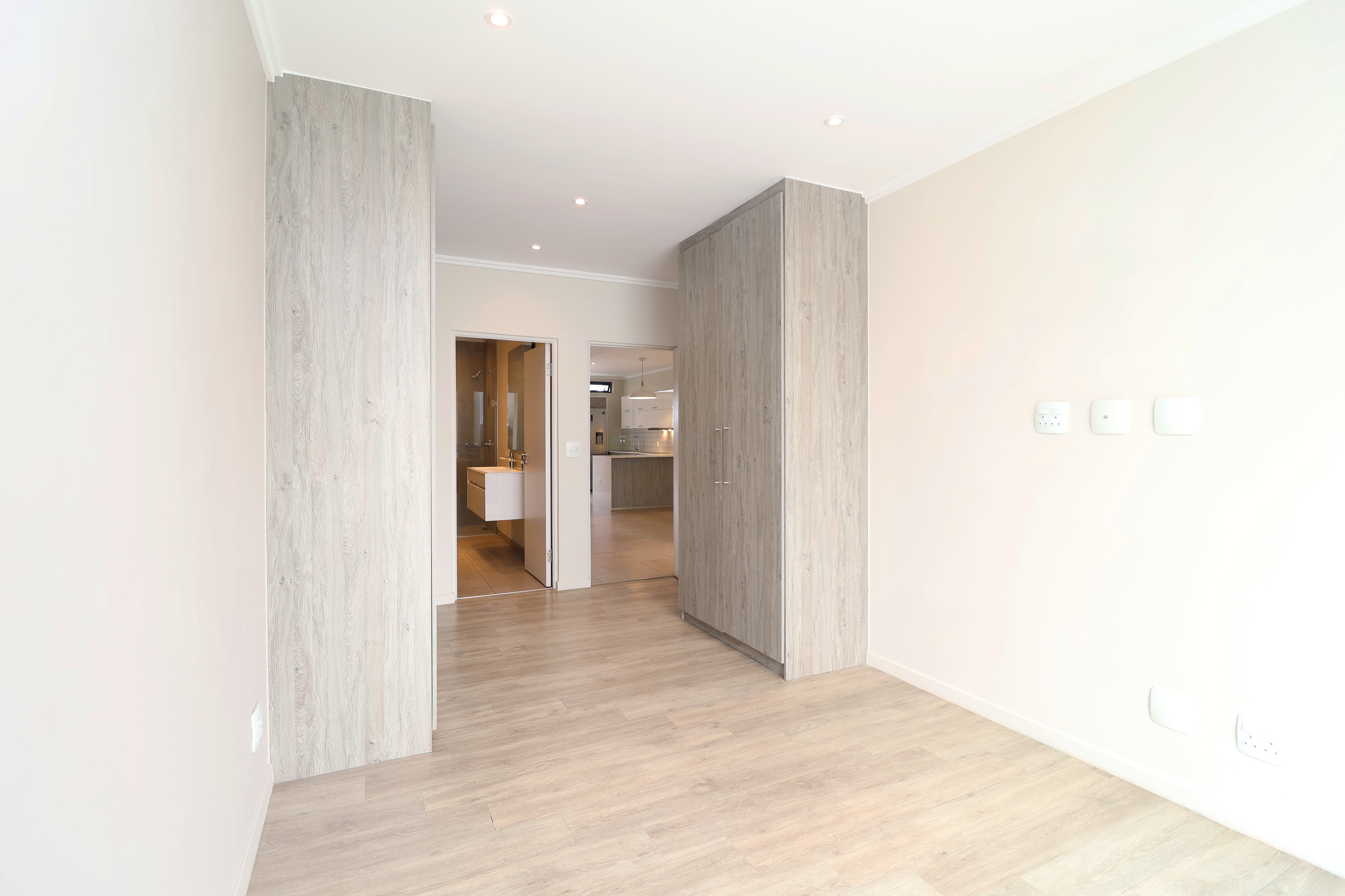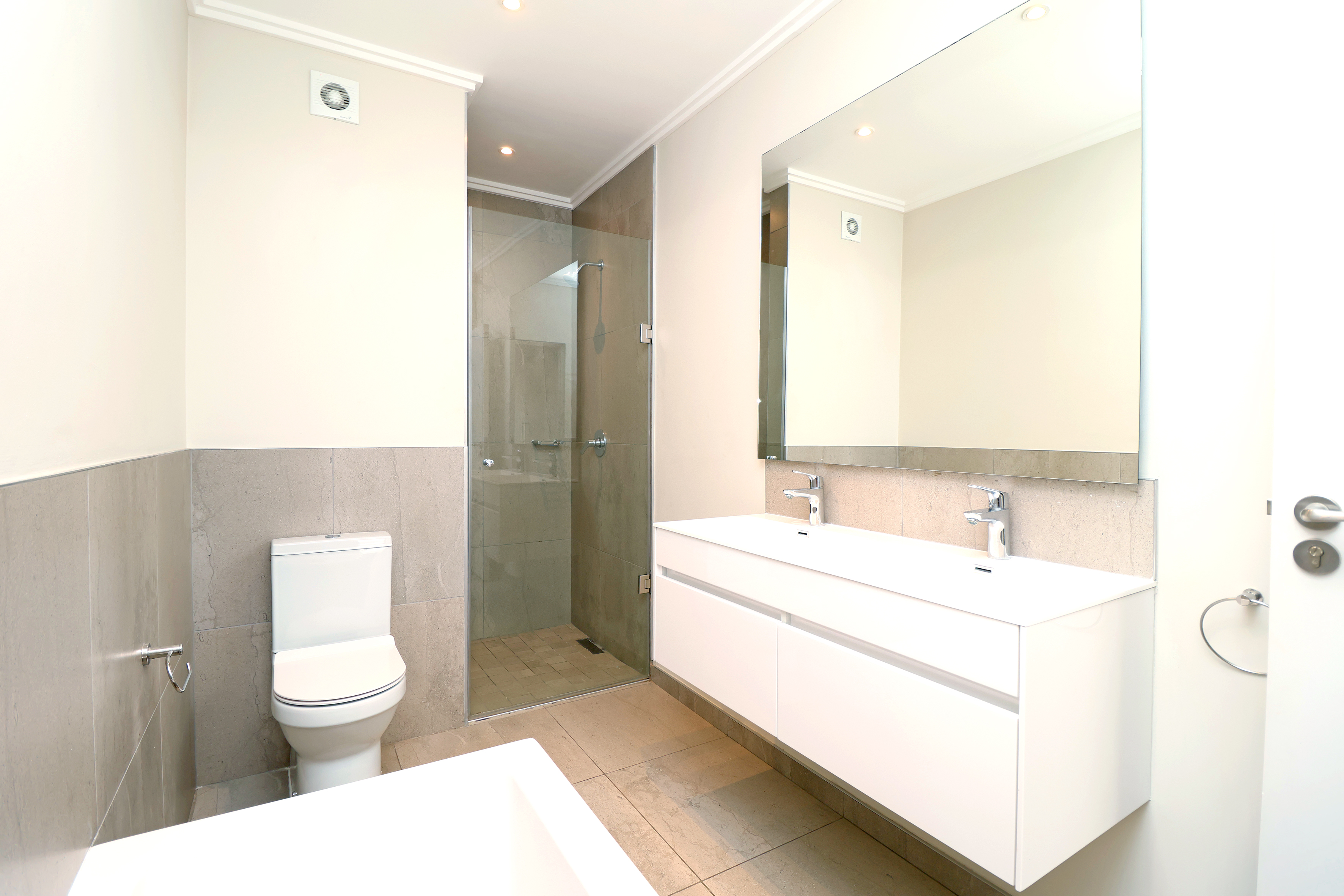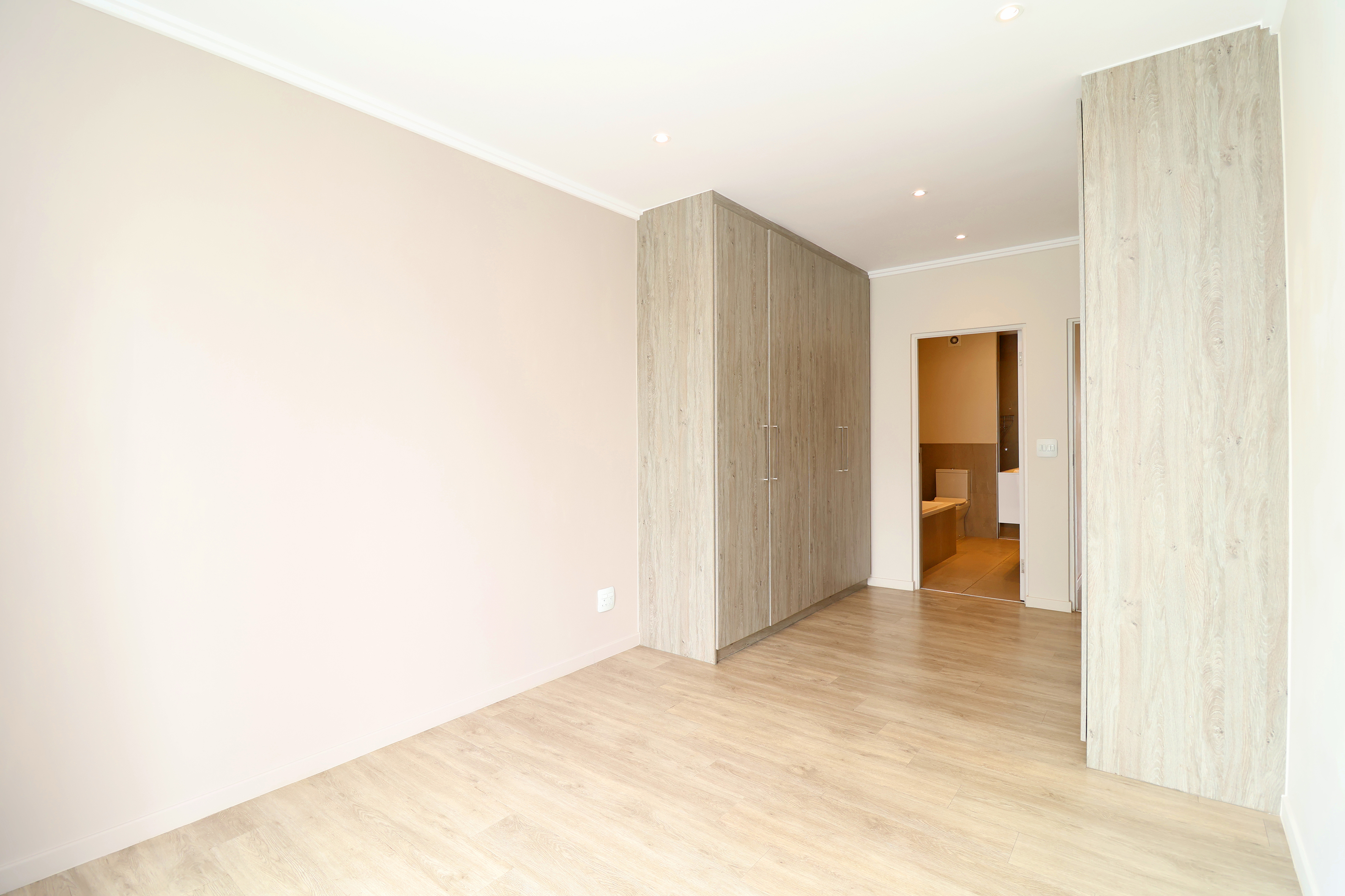 Both bedrooms feature warm laminated flooring, with the main bedroom offering a full en-suite bathroom with a double vanity.