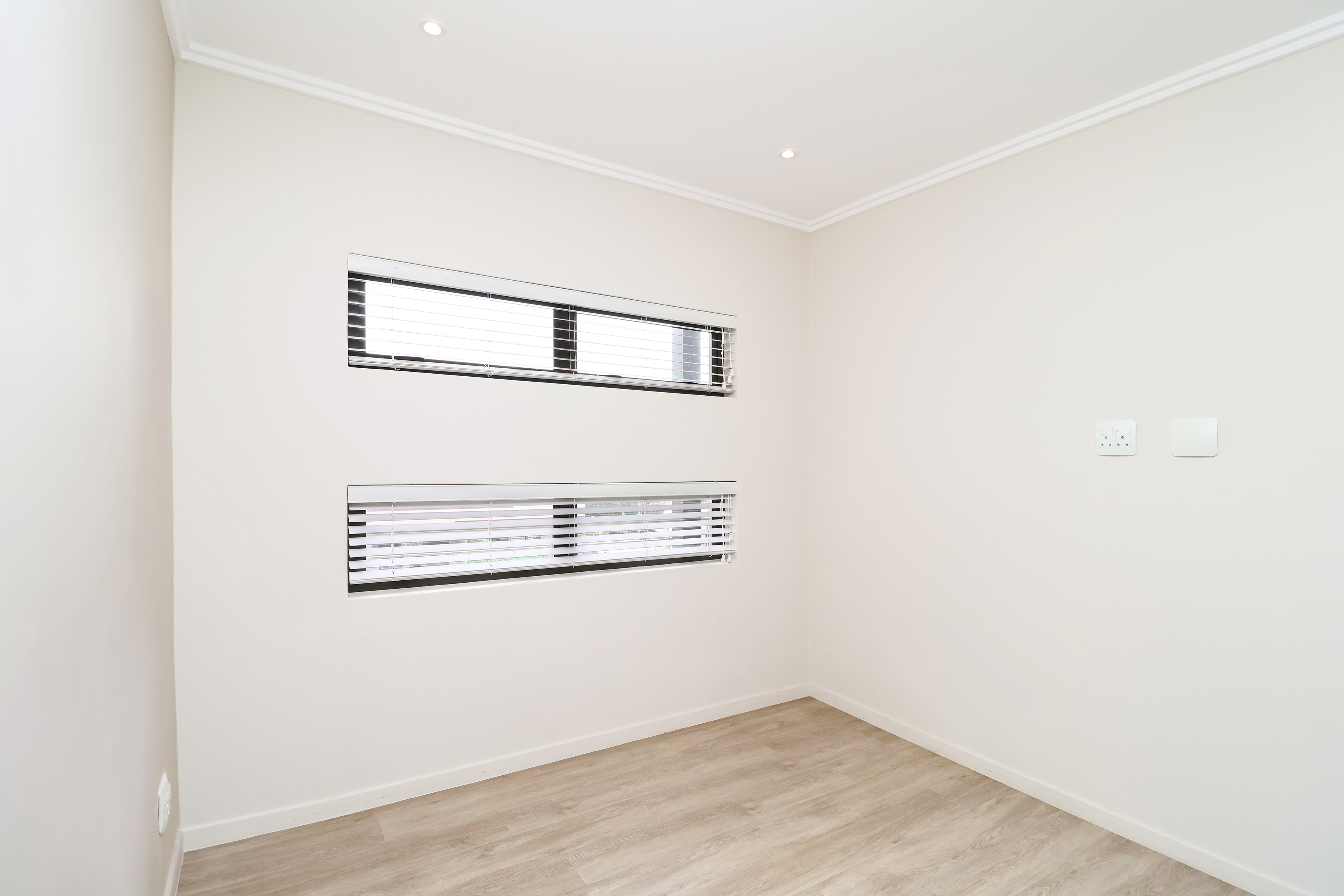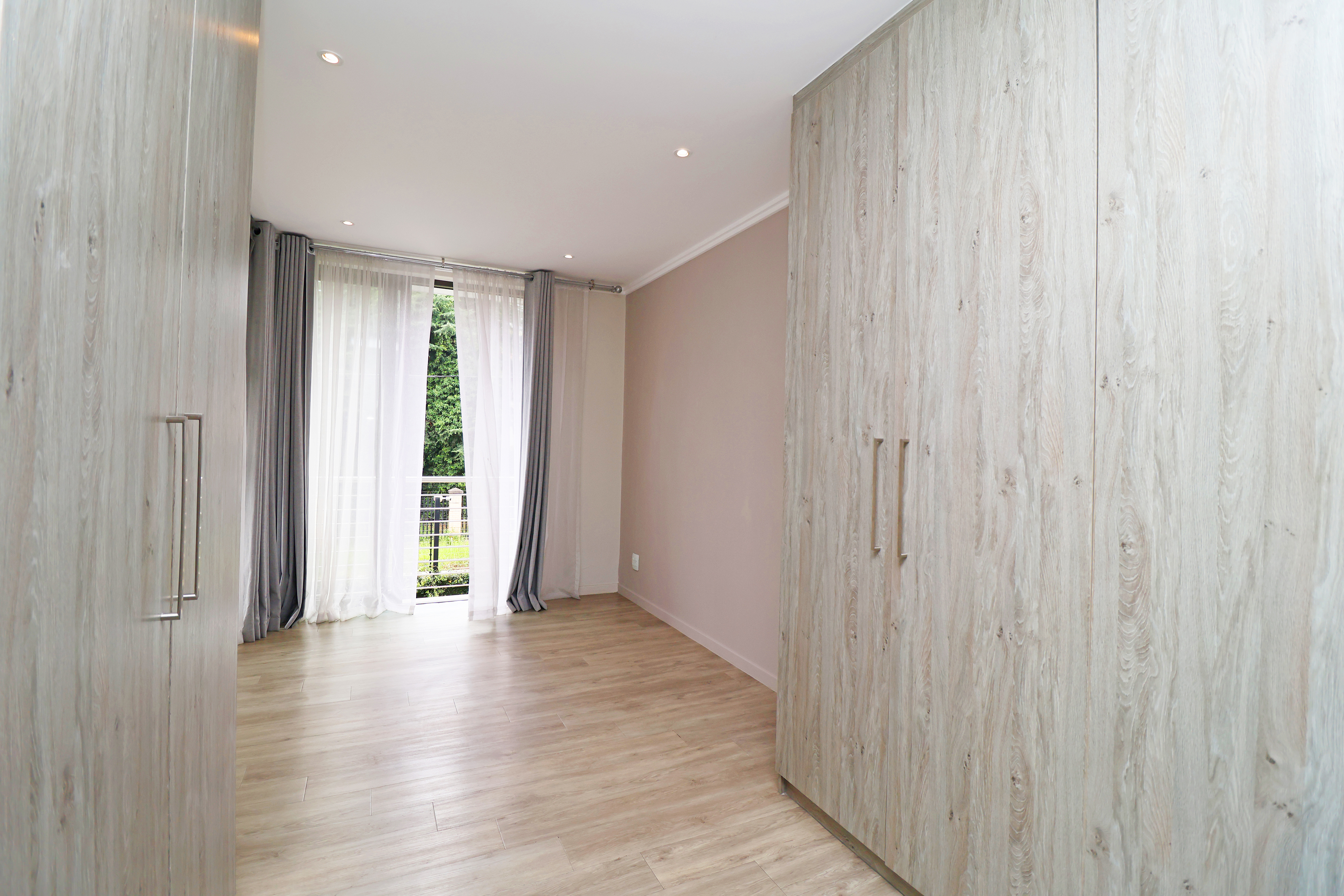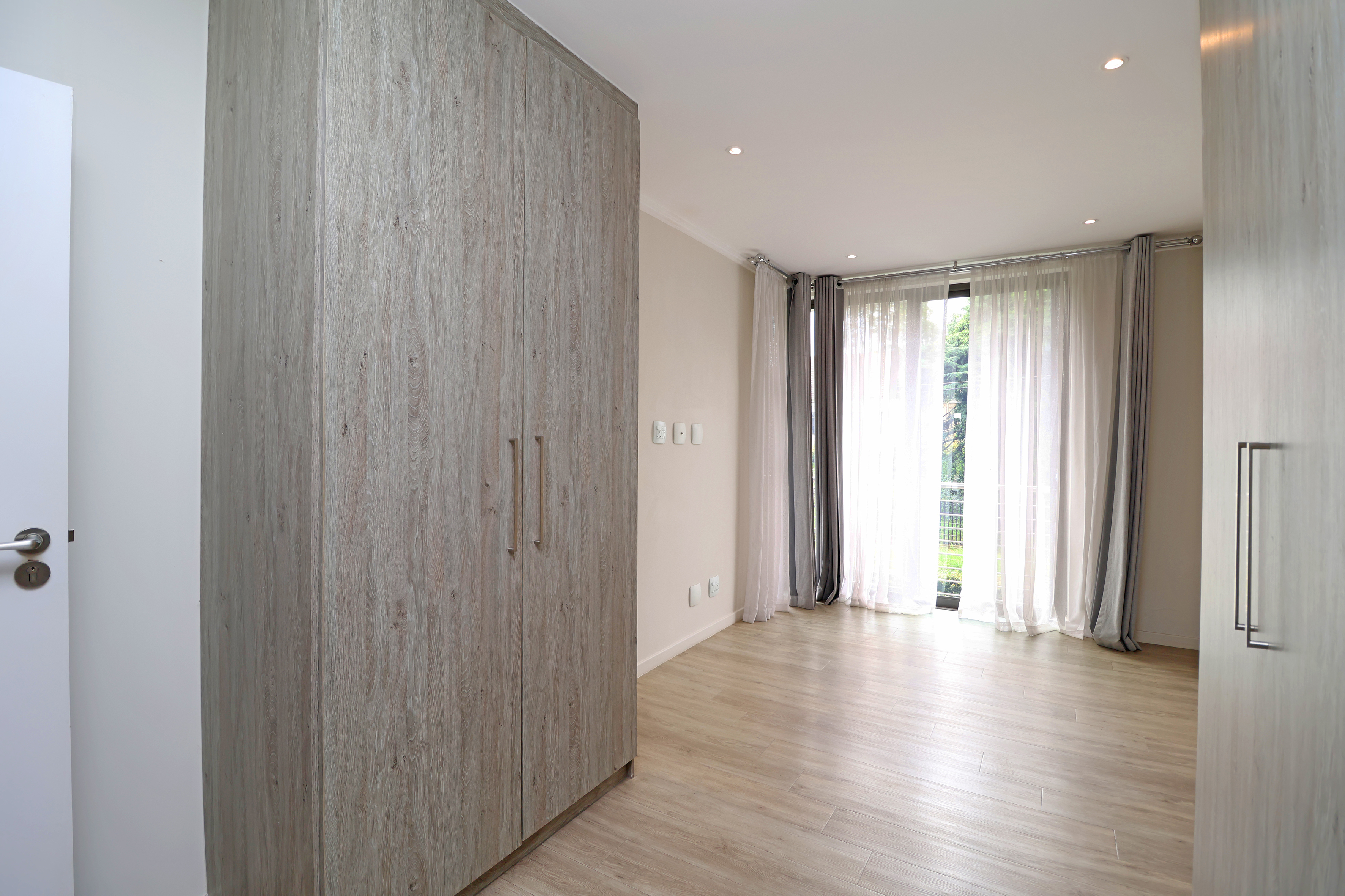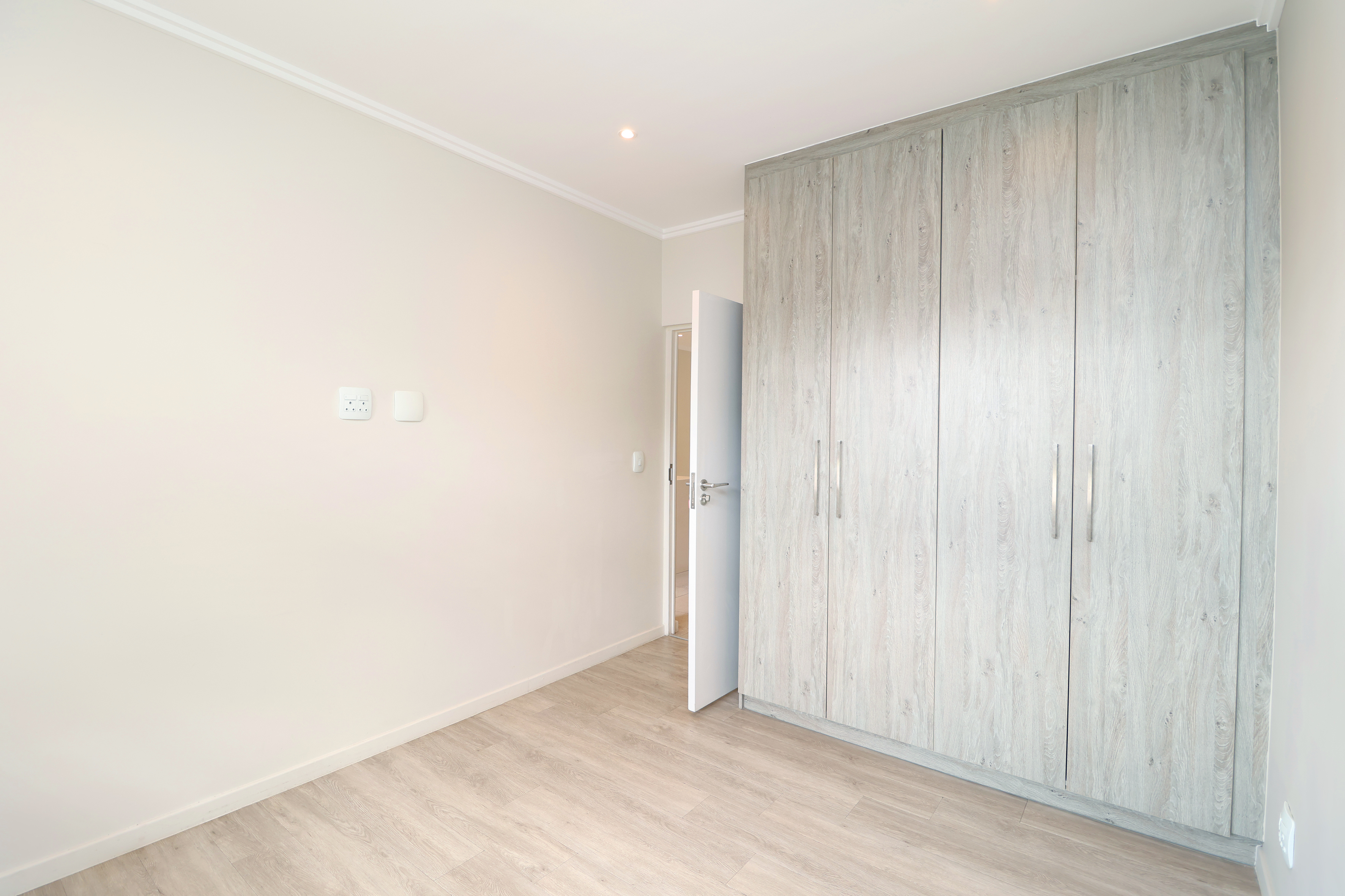 Both bedrooms feature warm laminated flooring, with the main bedroom offering a full en-suite bathroom with a double vanity.