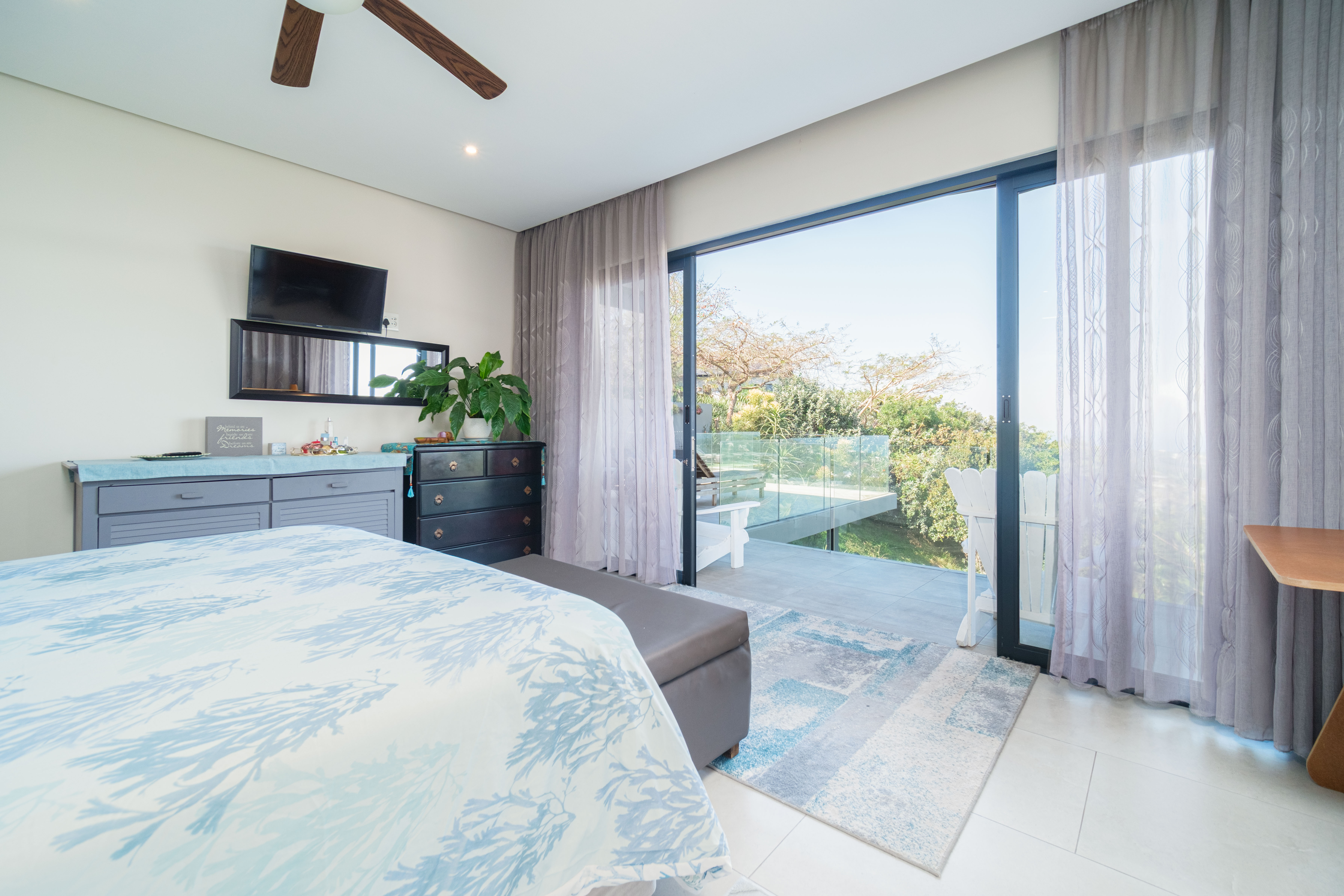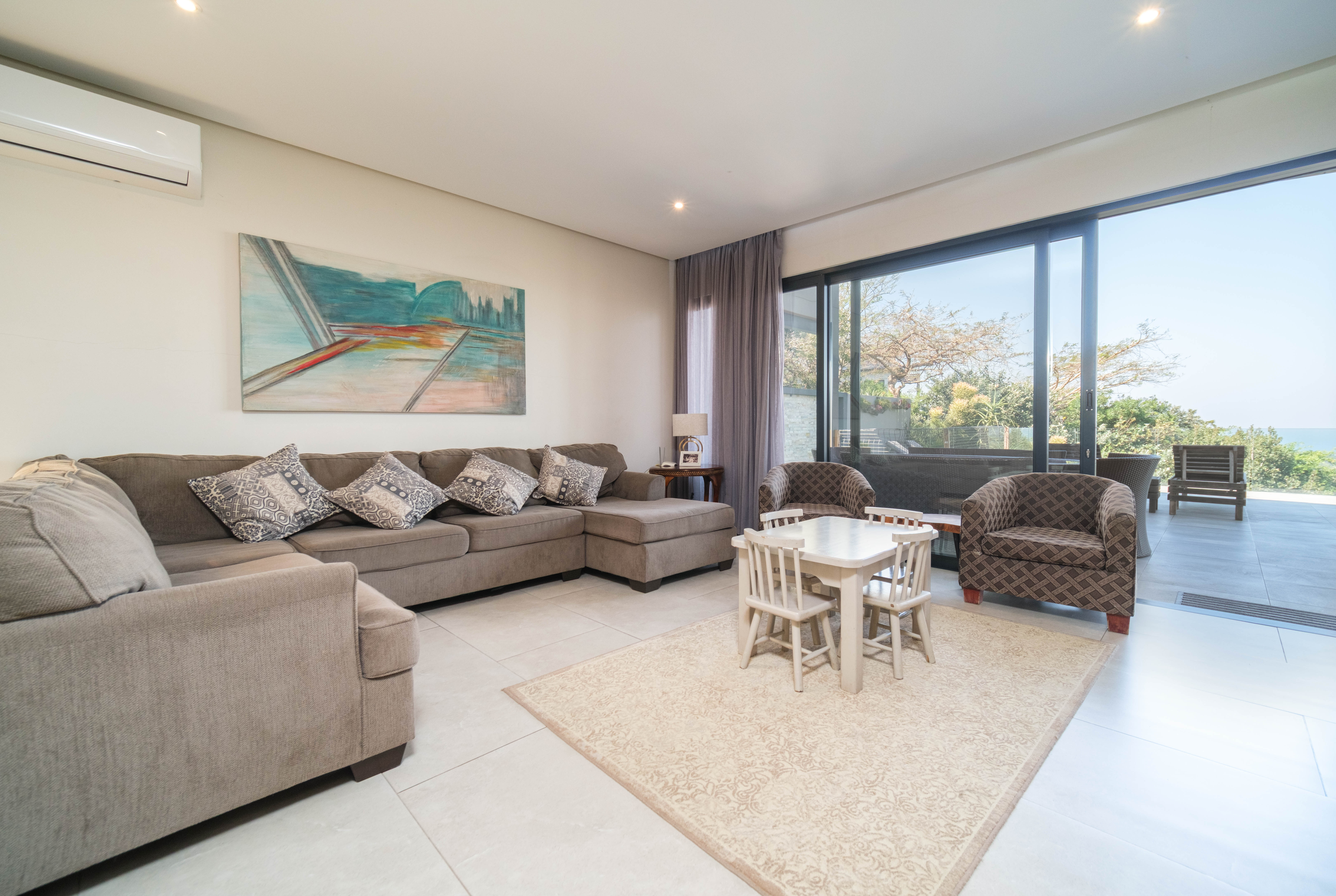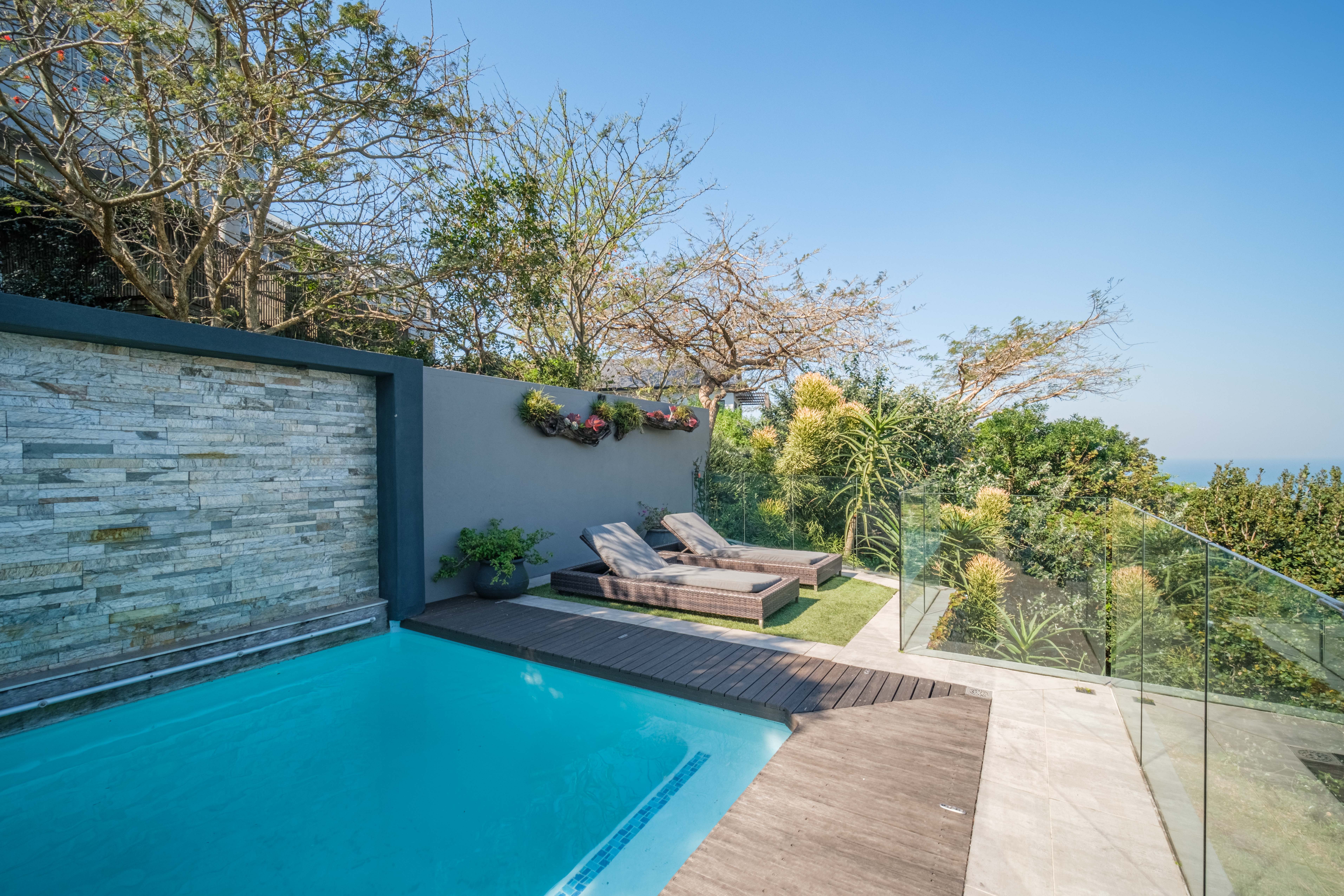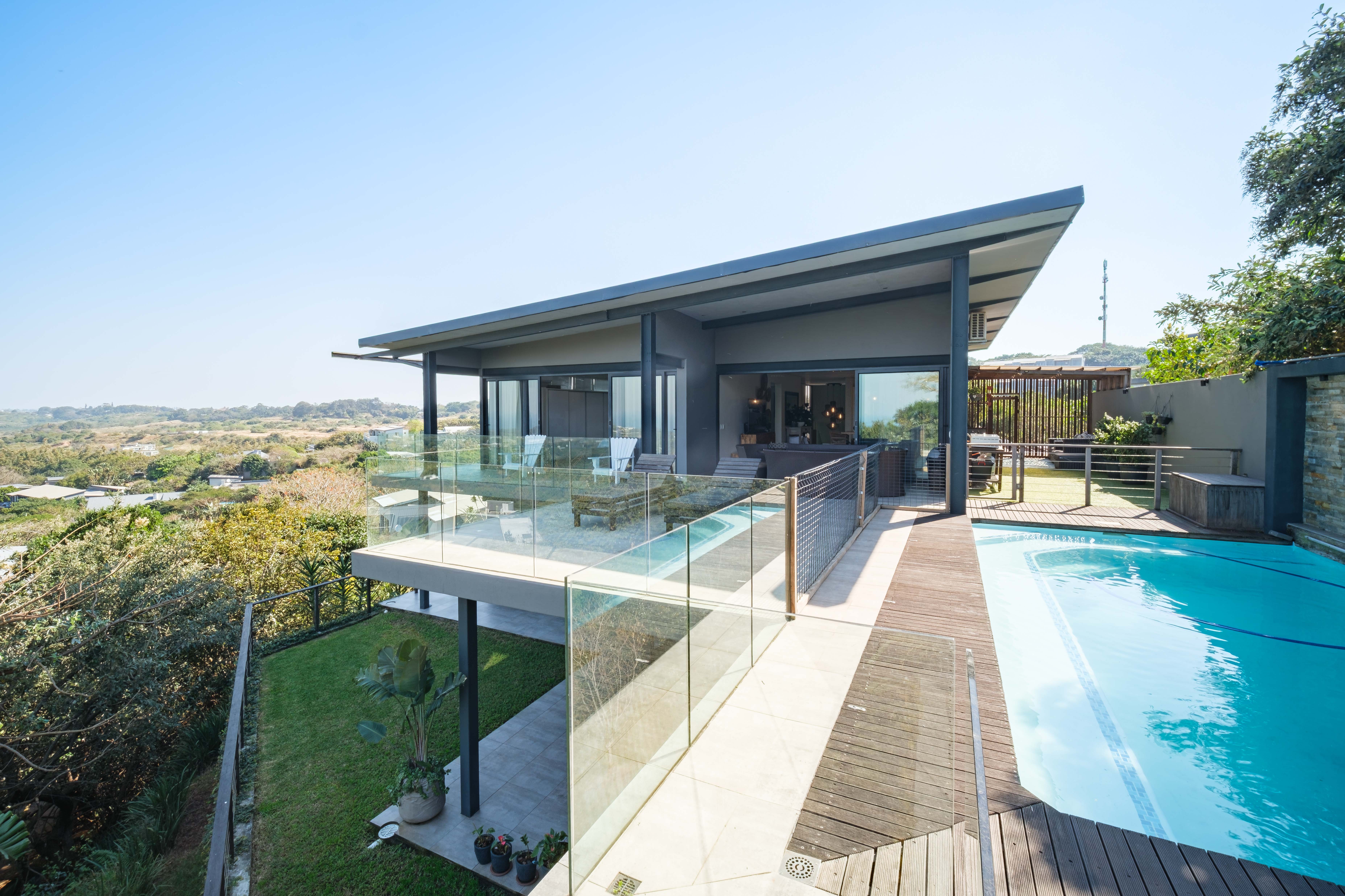Featuring five spacious bedrooms, each with direct access to a private outdoor area, and five and a half beautifully appointed bathrooms, this residence effortlessly blends indoor-outdoor living. The expansive living spaces open out to a sparkling swimming pool, perfect for enjoying the warm North Coast climate and stunning sea vistas.