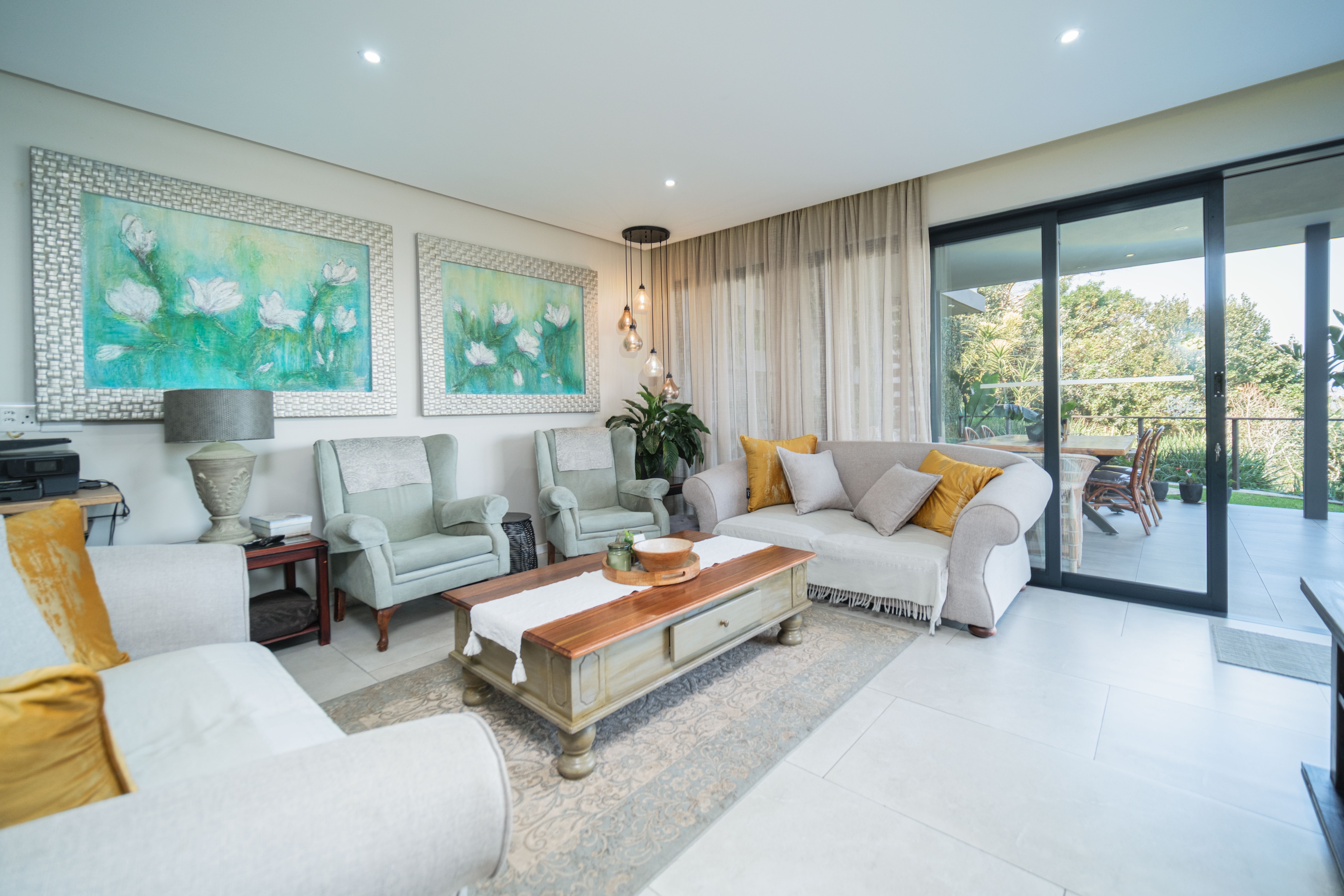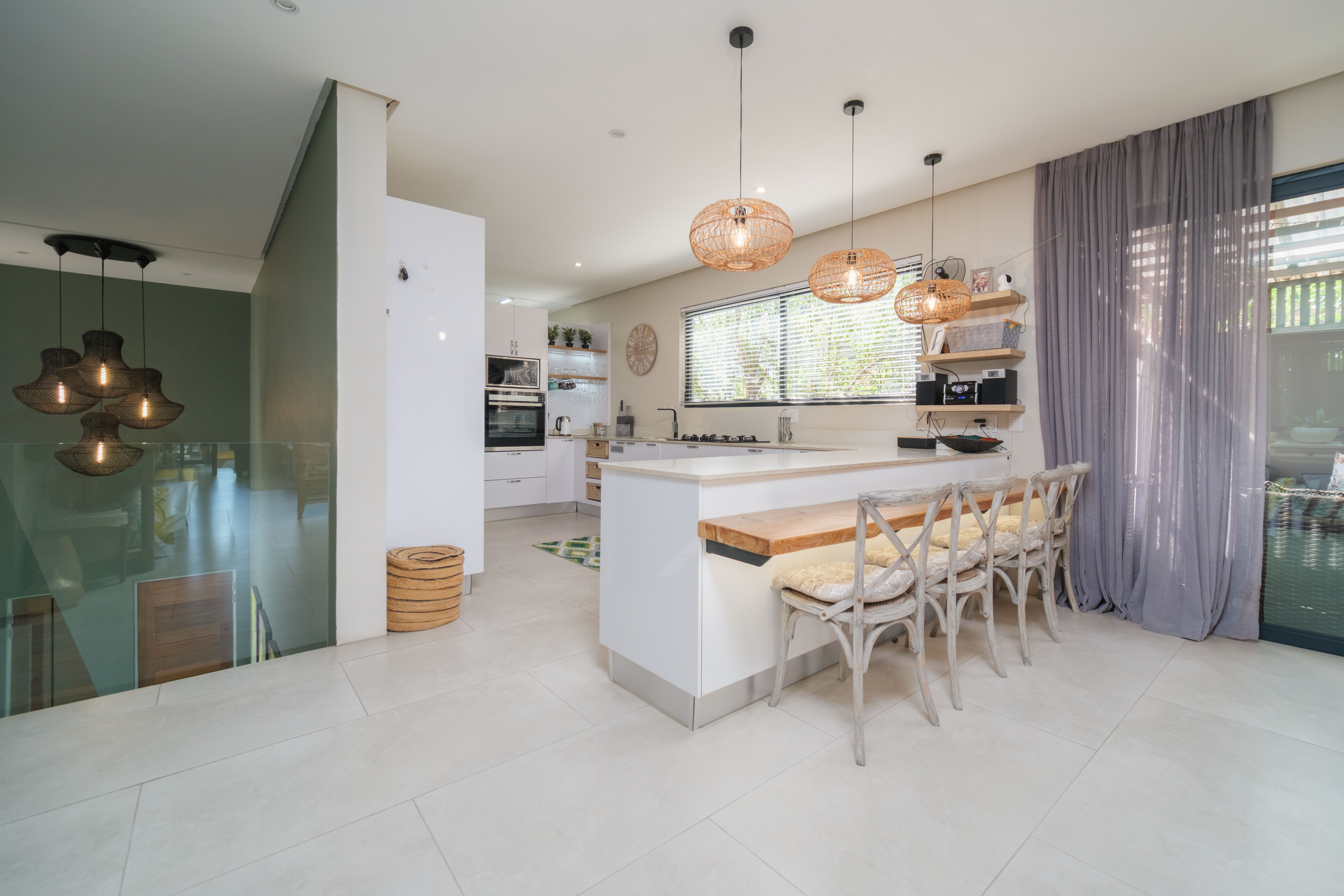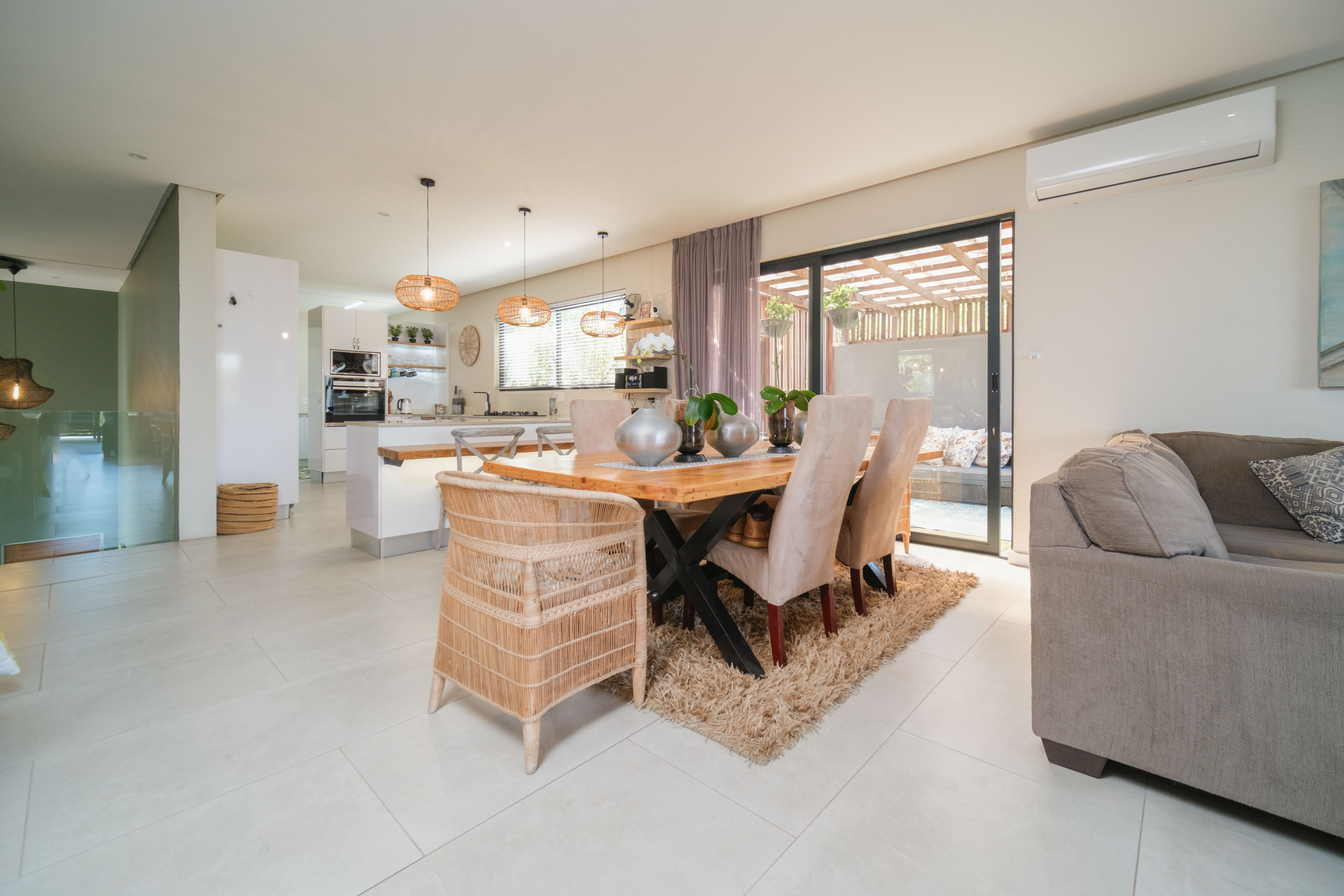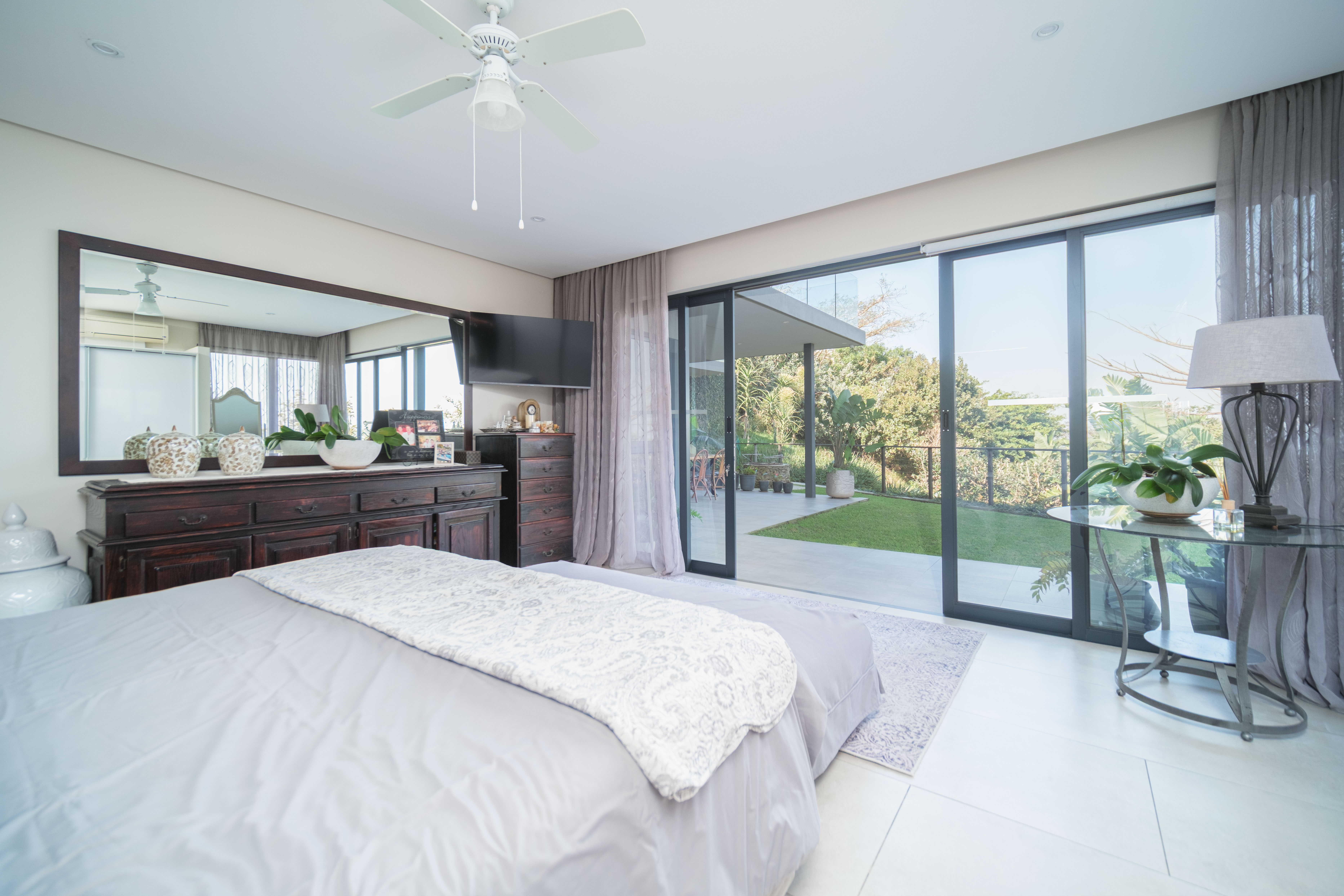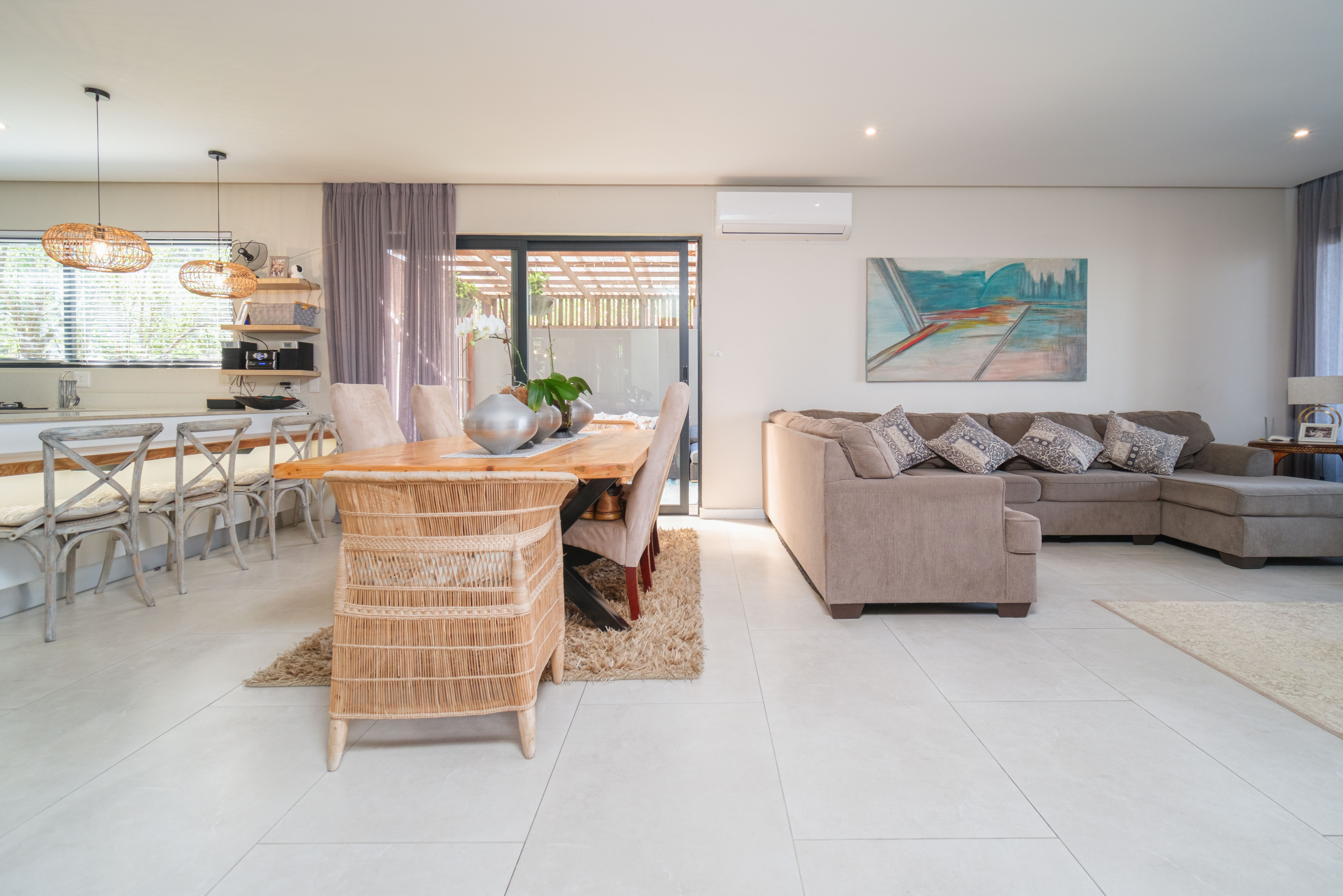 Featuring five spacious bedrooms, each with direct access to a private outdoor area, and five and a half beautifully appointed bathrooms, this residence effortlessly blends indoor-outdoor living. The expansive living spaces open out to a sparkling swimming pool, perfect for enjoying the warm North Coast climate and stunning sea vistas.