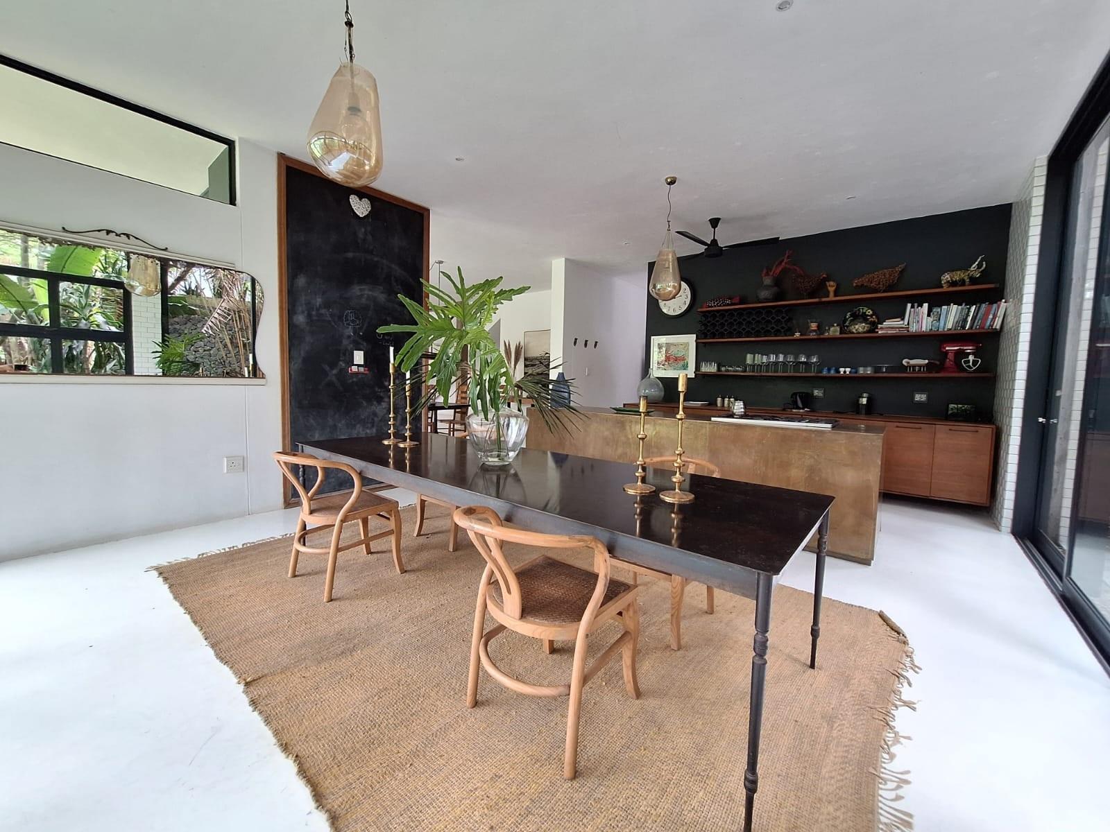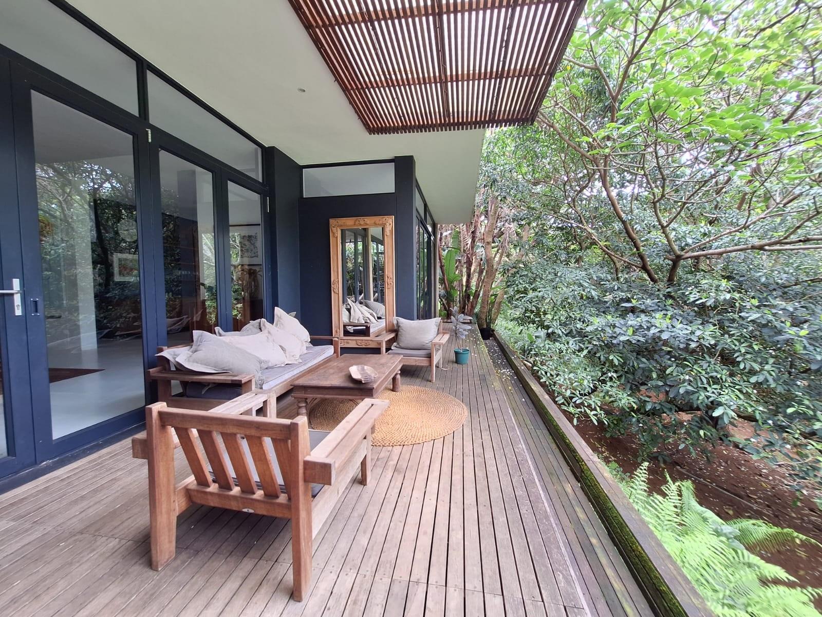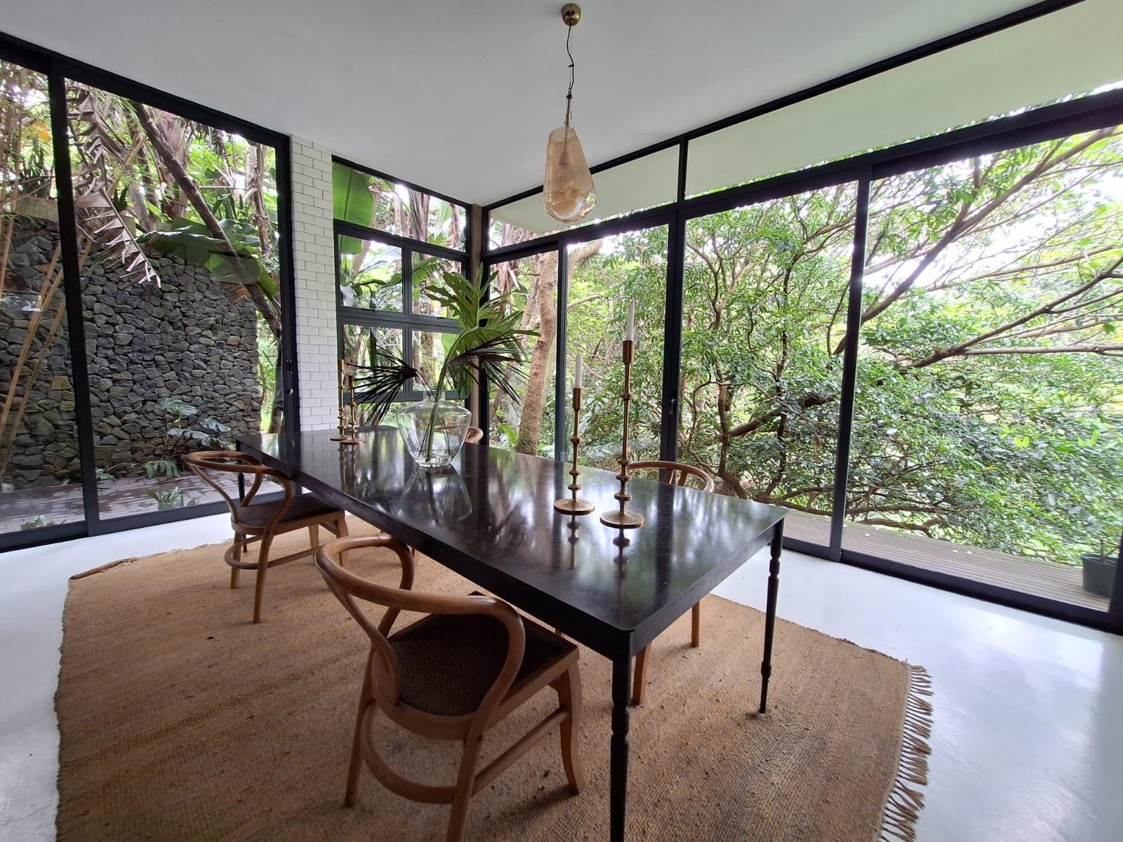 The dining area extends onto a private deck nestled among lush greenery, providing the perfect setting for relaxed family gatherings or peaceful moments of solitude.