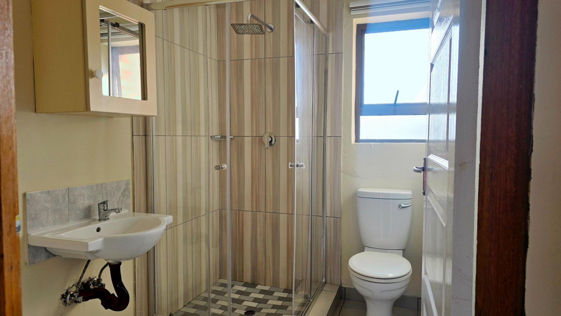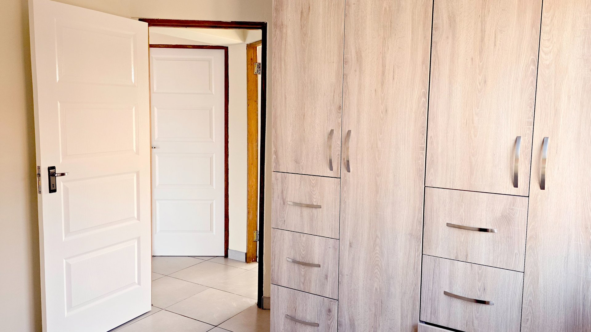 The apartment offers two spacious bedrooms, both tiled and fitted with built-in cupboards, providing ample storage and easy maintenance. The bathroom is neatly finished and includes a shower.