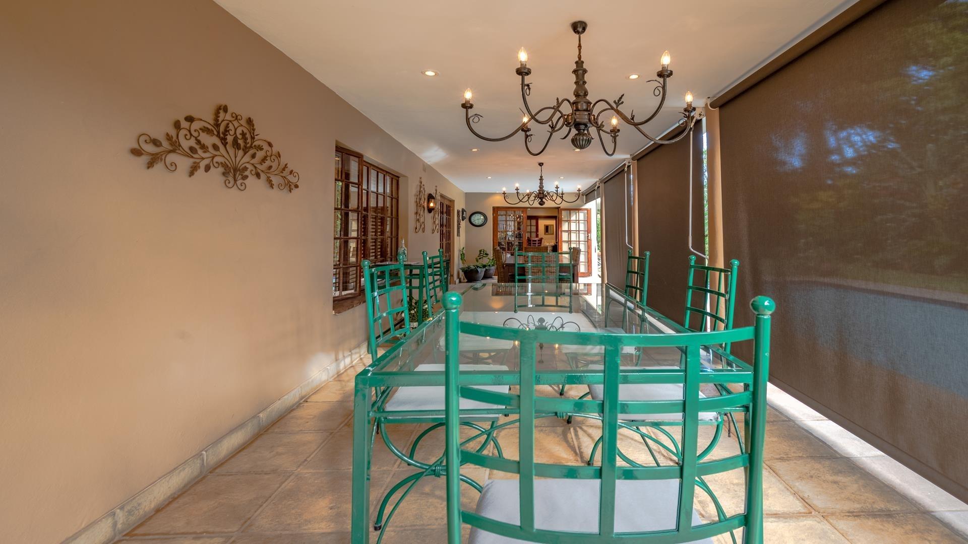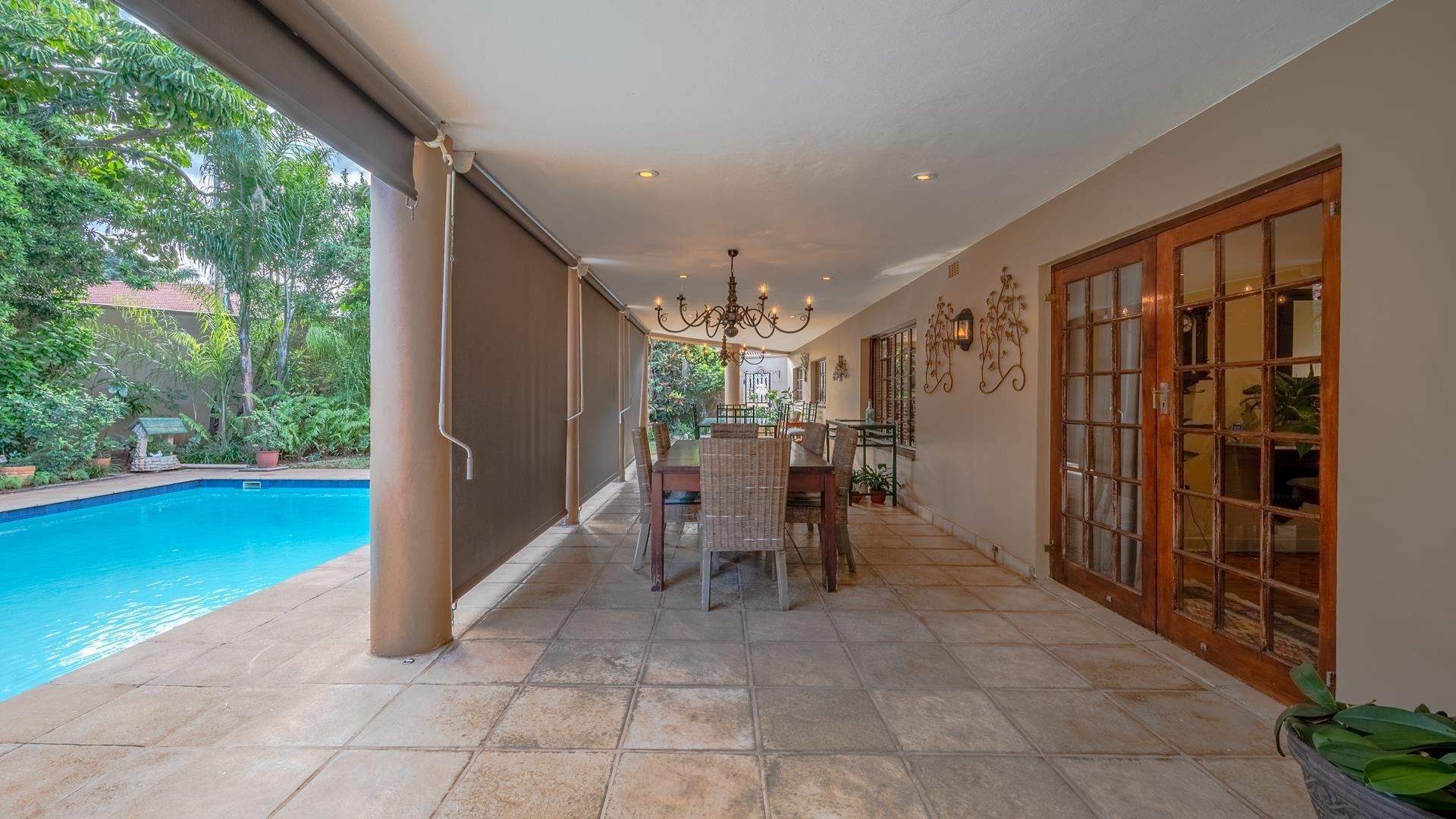 Covered patio overlooking a sparkling pool and lush garden.