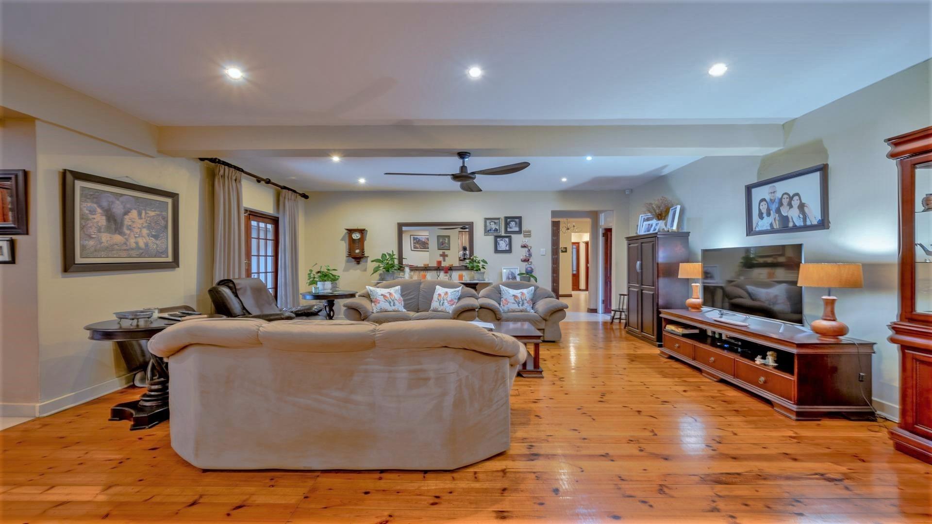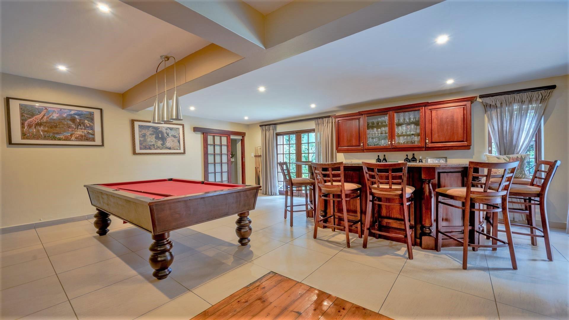 An open-plan lounge, dining room, and pub area with a pool table.