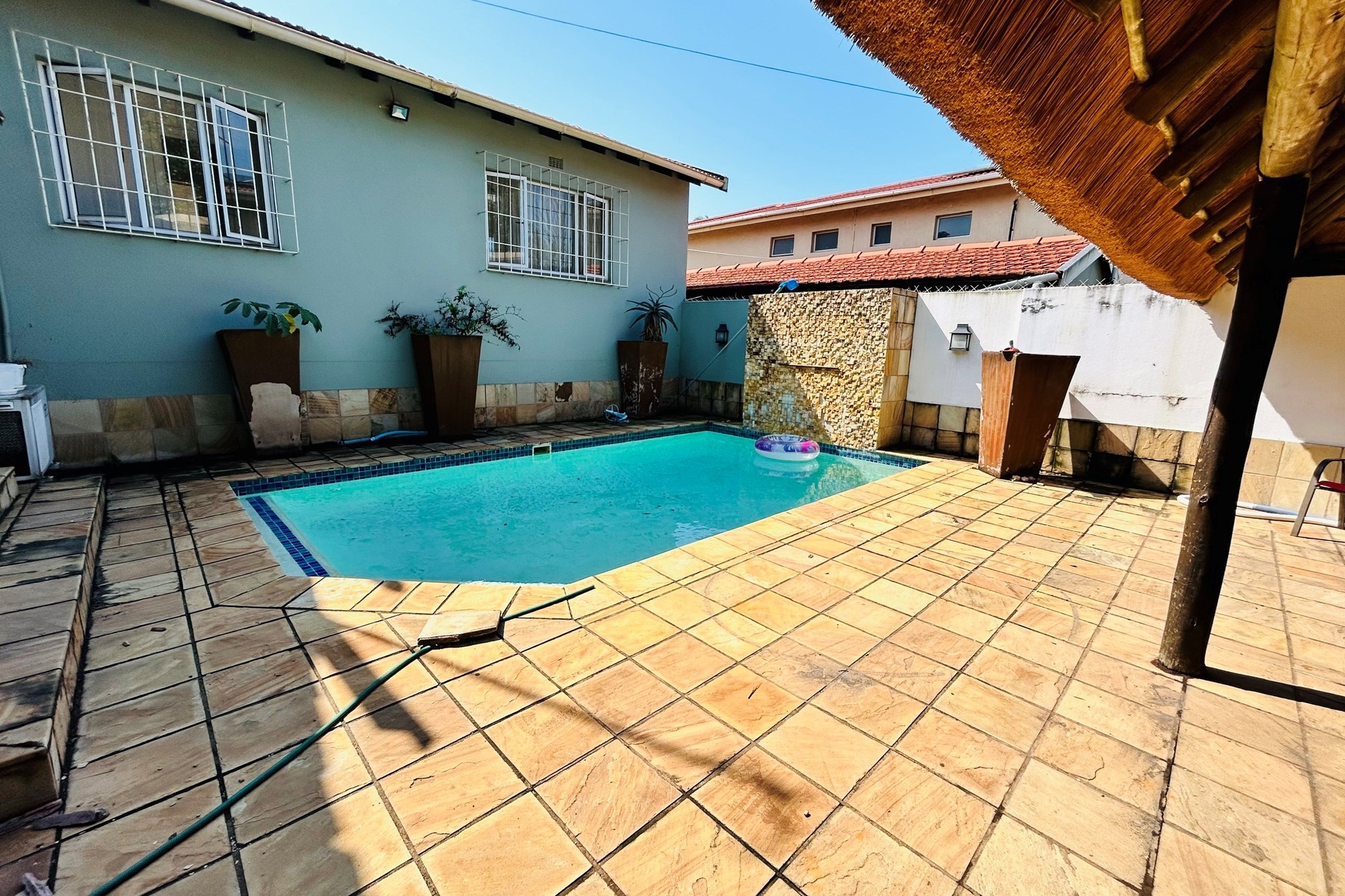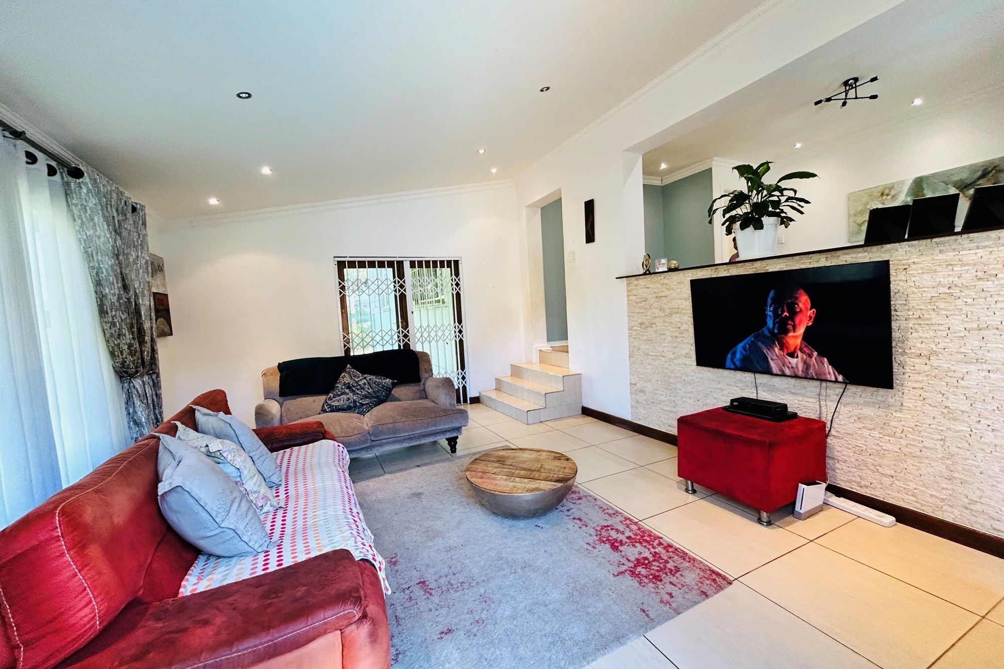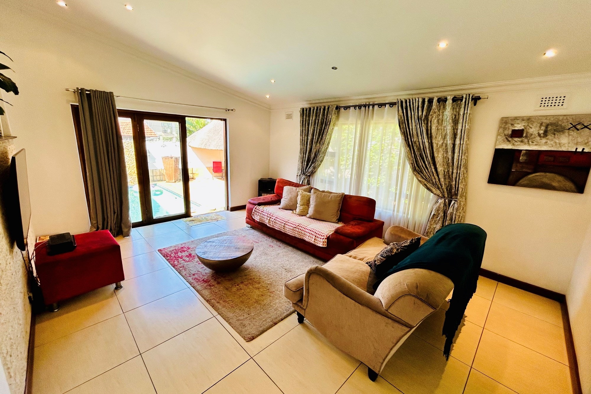 Open plan living room leads out to a large lapa overlooking the scenic water feature pool and leads to a large level garden for the children to play.