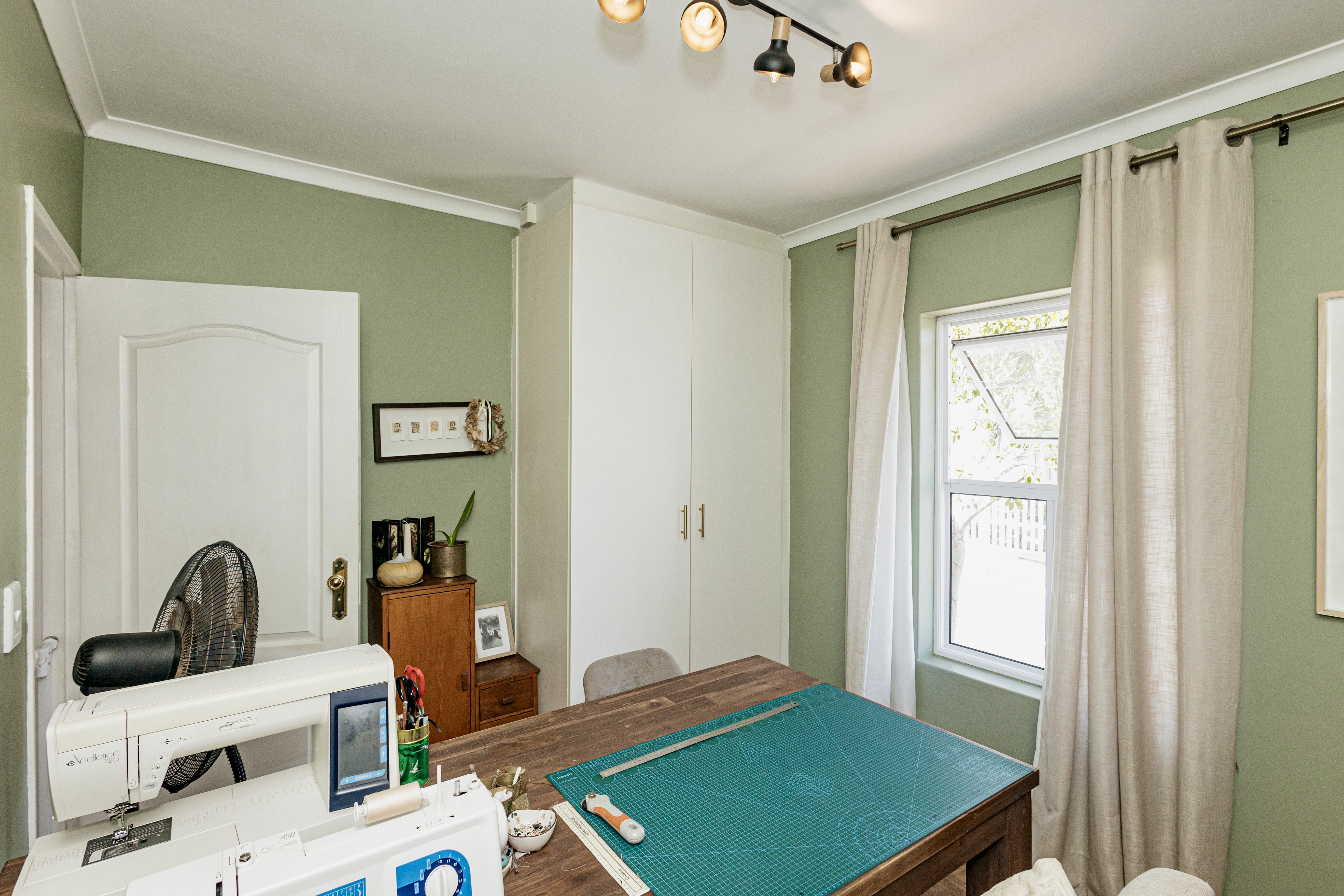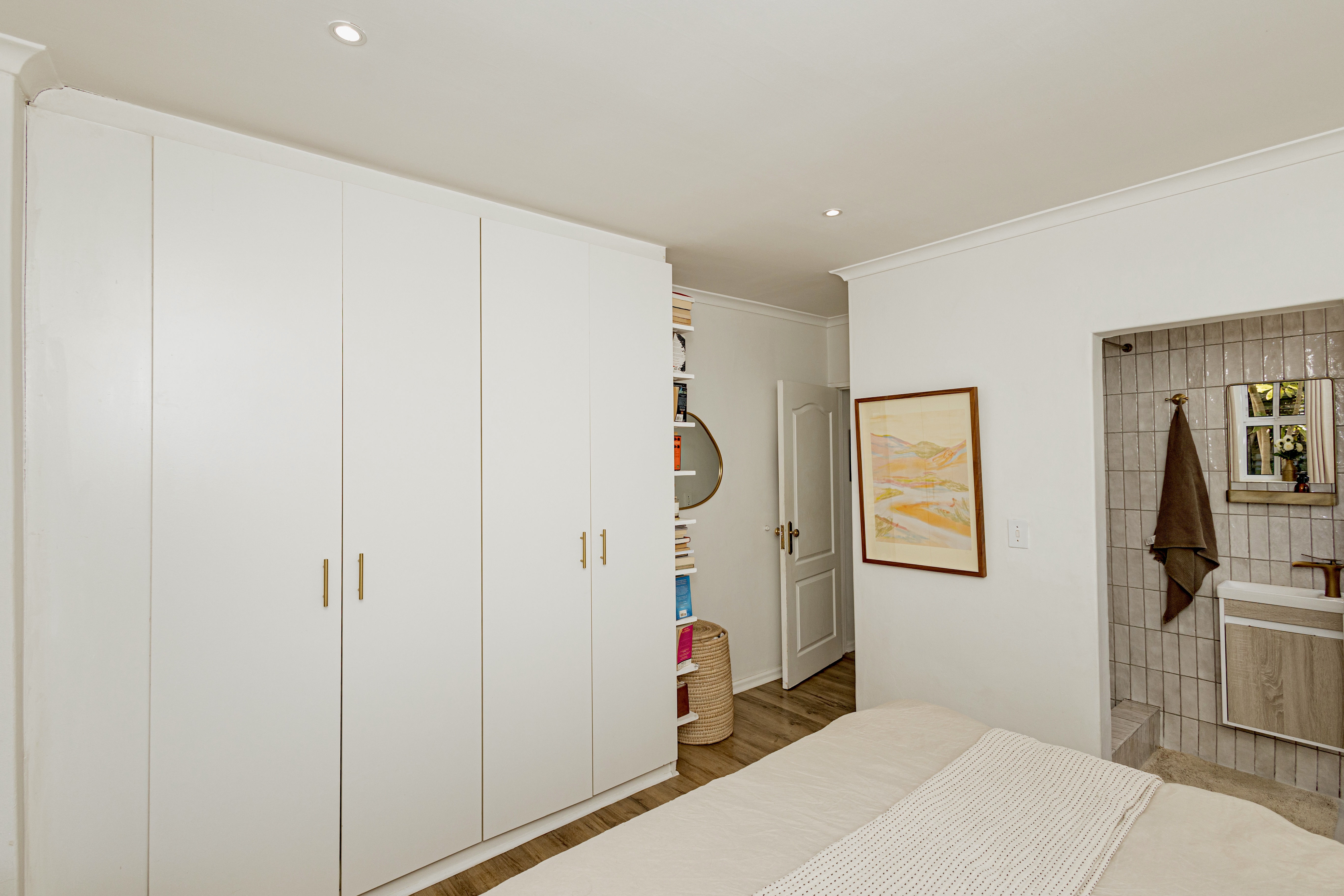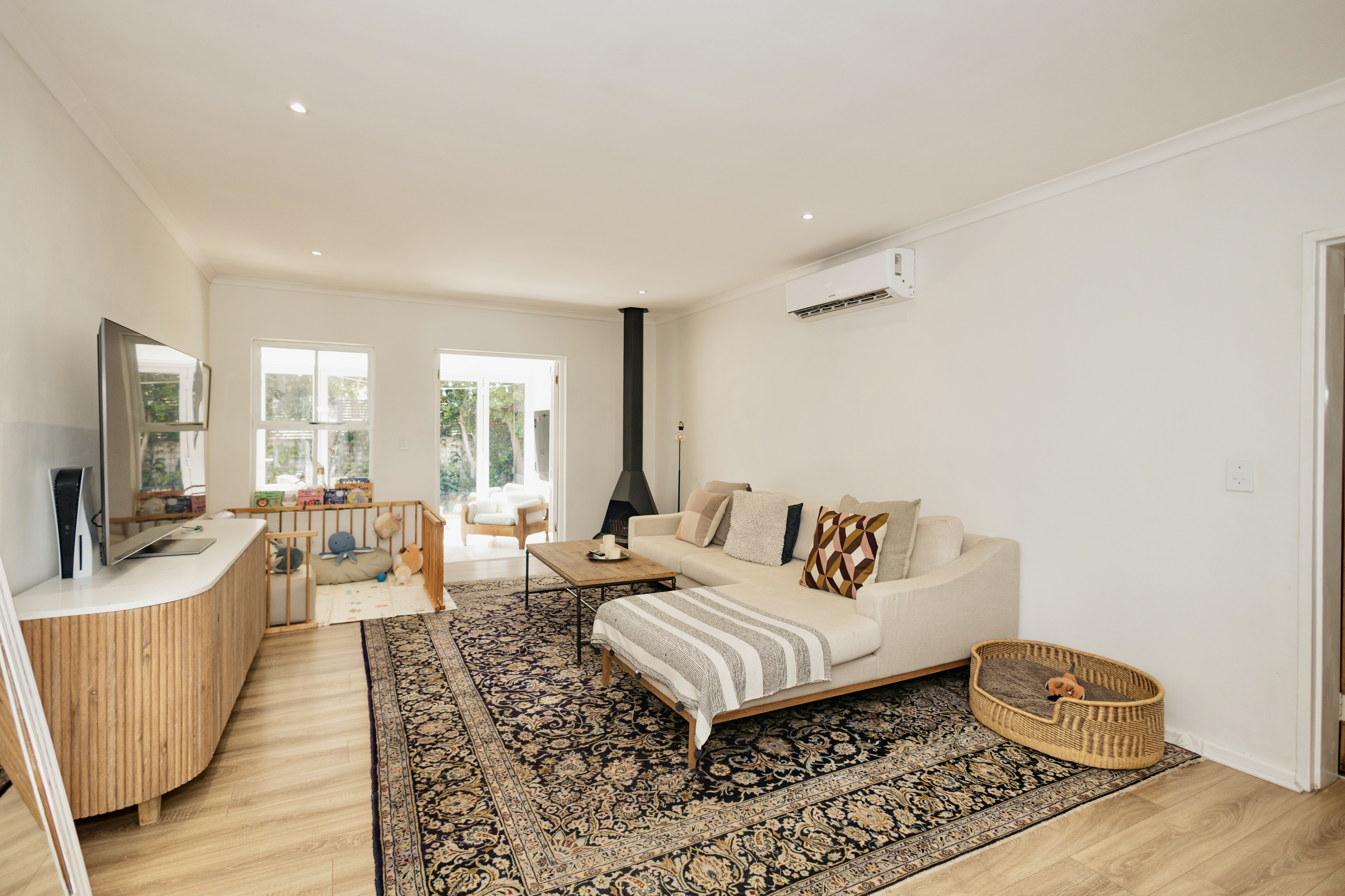 The brand-new open-plan country kitchen, featuring American White Oak open shelving, flows effortlessly into a spacious living area with a cozy fireplace. A separate scullery keeps everything neat, while two air conditioners ensure year-round comfort. All windows and exterior doors have recently been replaced with aluminium and fitted with Clearvue burglar bars, creating such a secure environment that the owners comfortably sleep with the sliding doors open. Levies are a low R355.