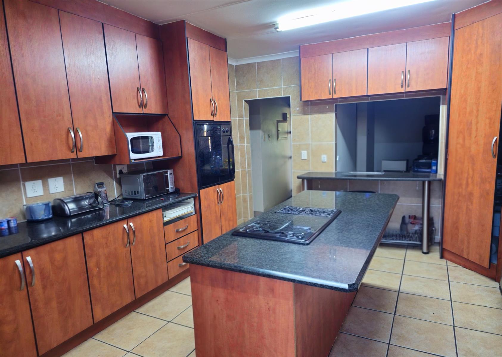 The property features three spacious bedrooms, all fitted with built-in cupboards, and three bathrooms, ensuring convenience and privacy for the whole family. The open-plan kitchen boasts modern finishes and flows seamlessly into the living areas, creating a welcoming space for everyday living and entertaining.