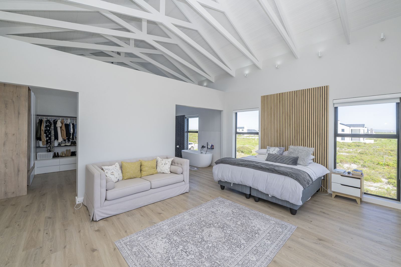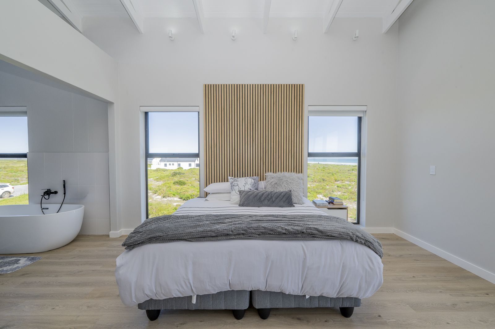 From sun-drenched living spaces with soaring ceilings to the seamless flow of frameless stacker doors opening onto a pool, firepit, and enclosed braai room, every detail of this home has been designed to embrace both comfort and style.