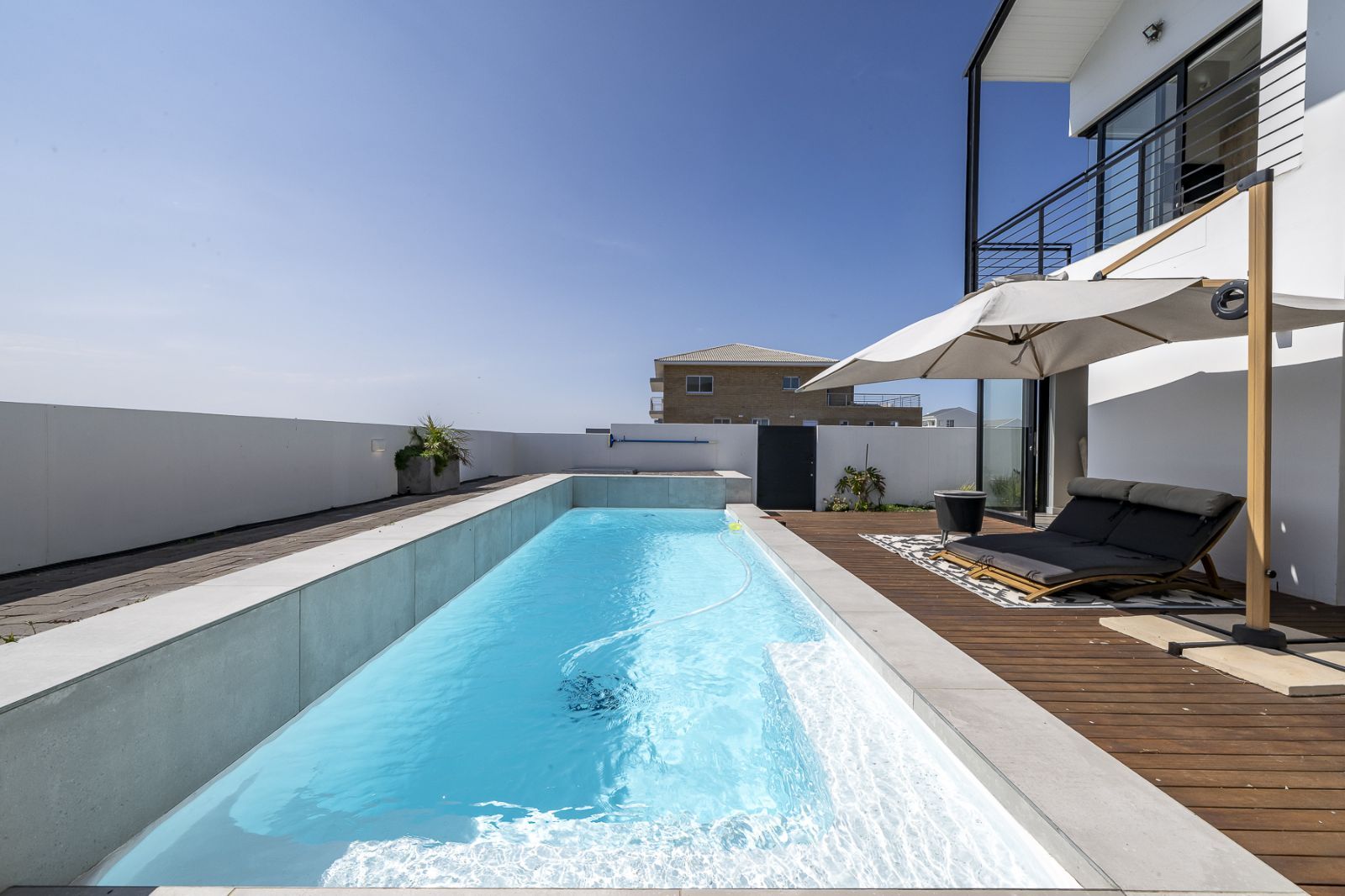 Indoor–Outdoor Lifestyle – pool, firepit, enclosed braai room, and Grepa decking.