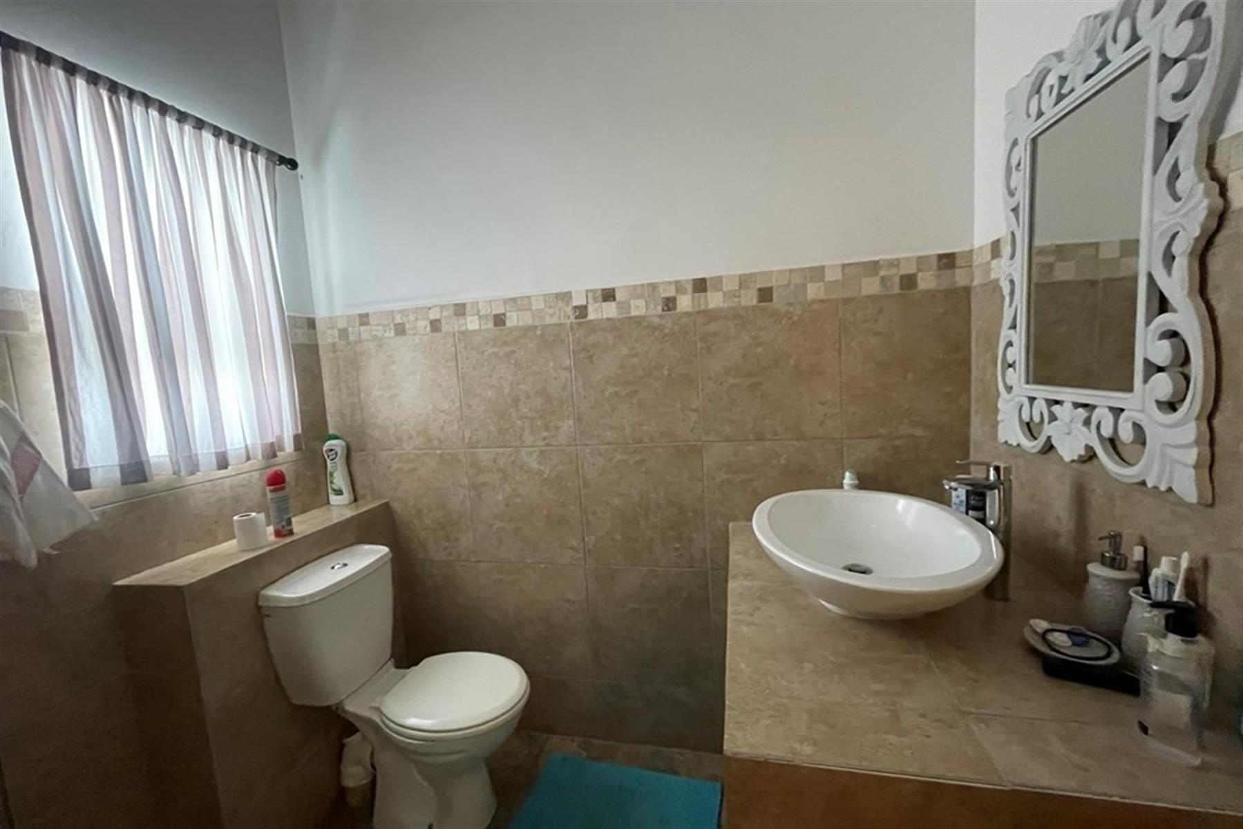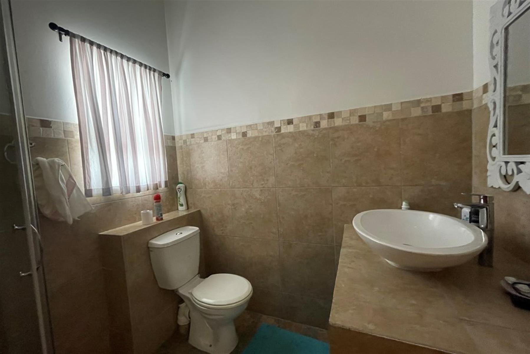 The main bedroom has built-in cupboards, a full en-suite bathroom, and direct access to the outdoor area. Two more bedrooms also have built-in cupboards and direct access to the outdoor area . The family bathroom includes a shower, basin, and toilet.