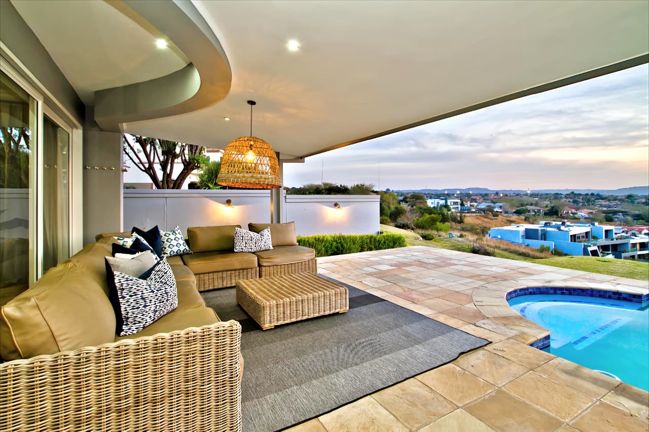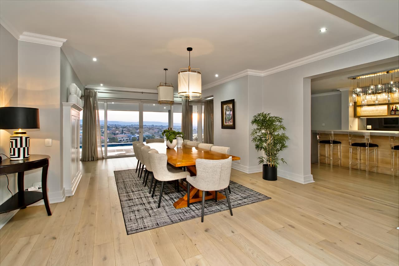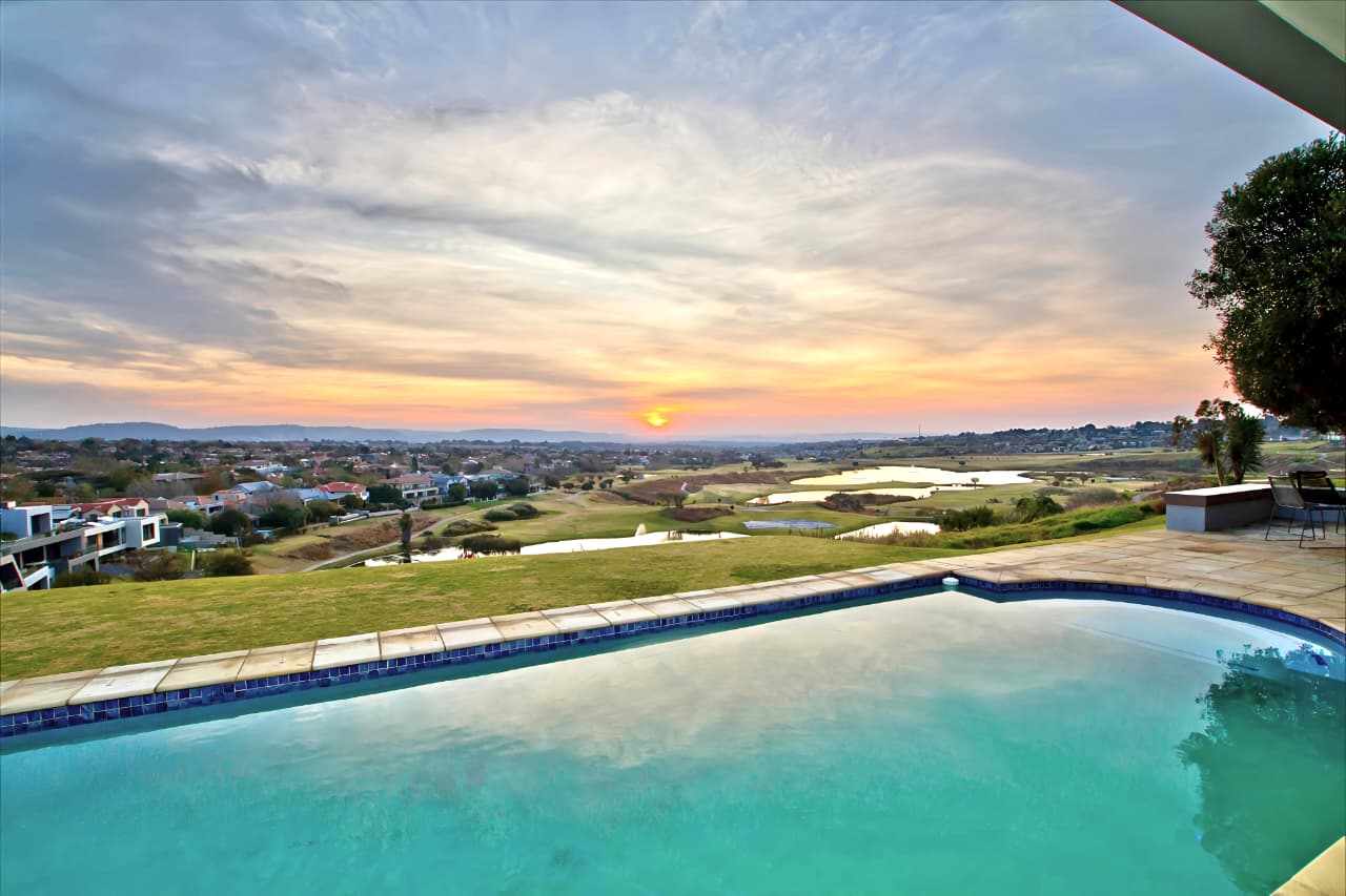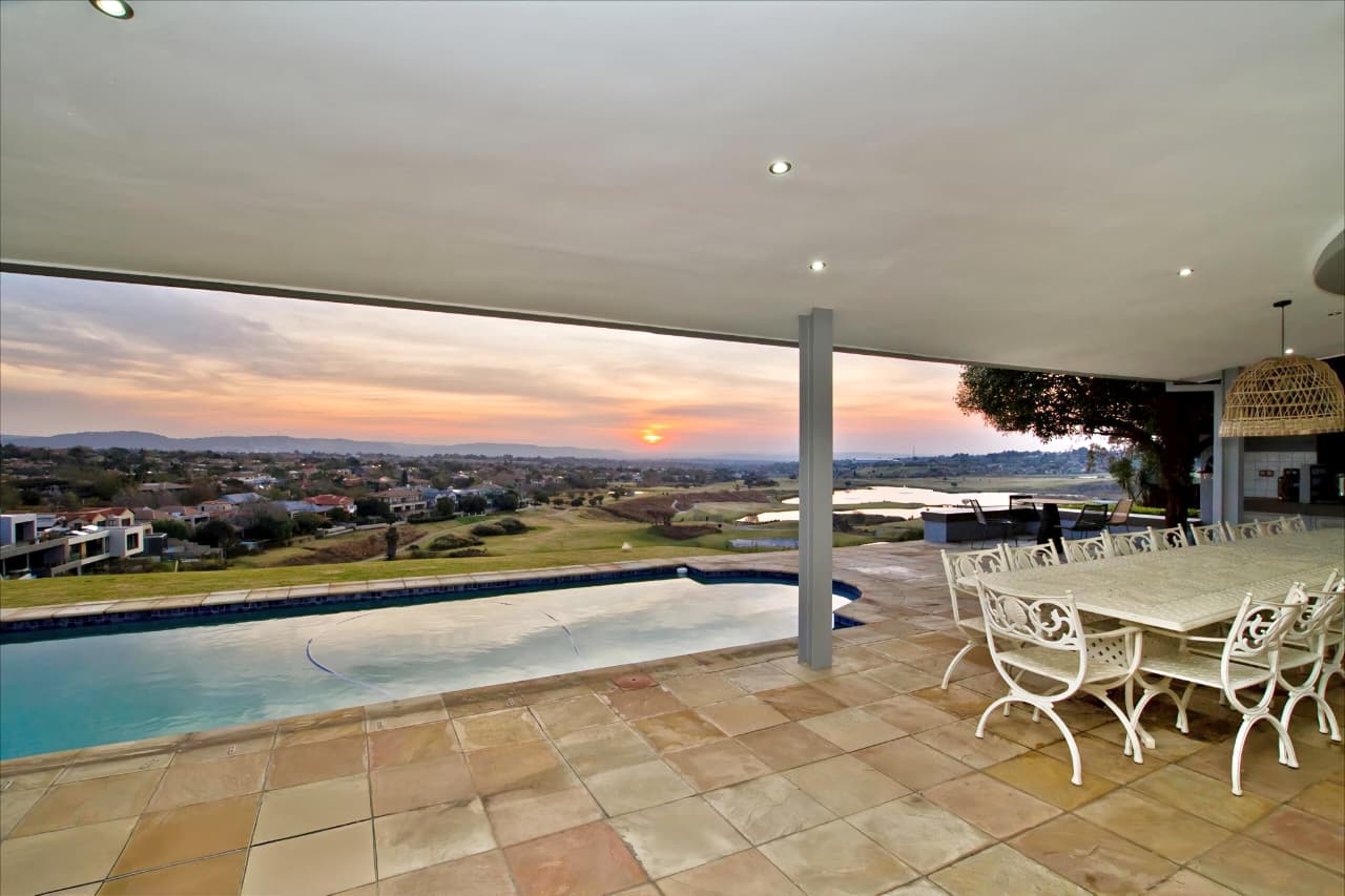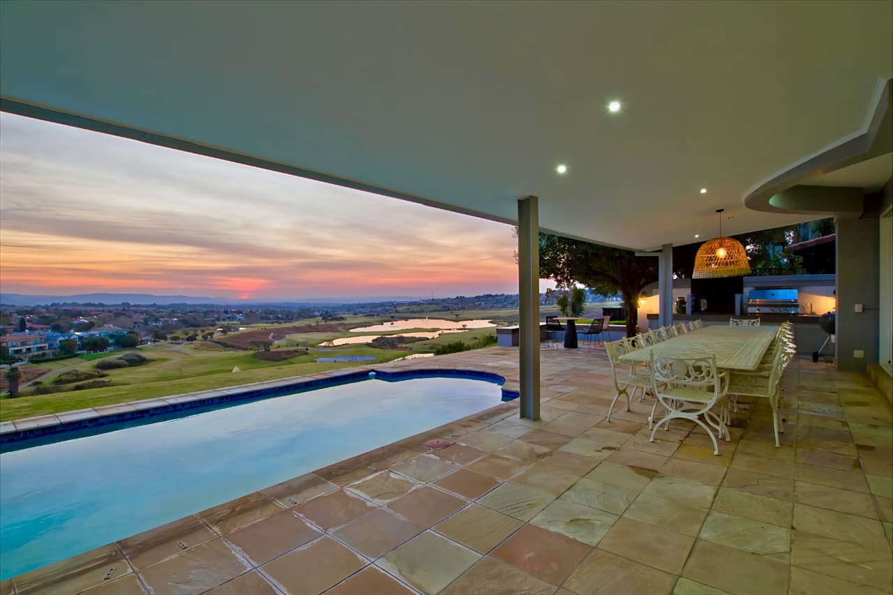 Each of the five bedrooms features a private en-suite bathroom, with the main suite capturing sweeping golf-course and Magalies mountain views. Expansive open-plan living and dining areas flow seamlessly to a covered entertainment patio, sparkling pool and landscaped garden — perfect for both family time and refined entertaining.