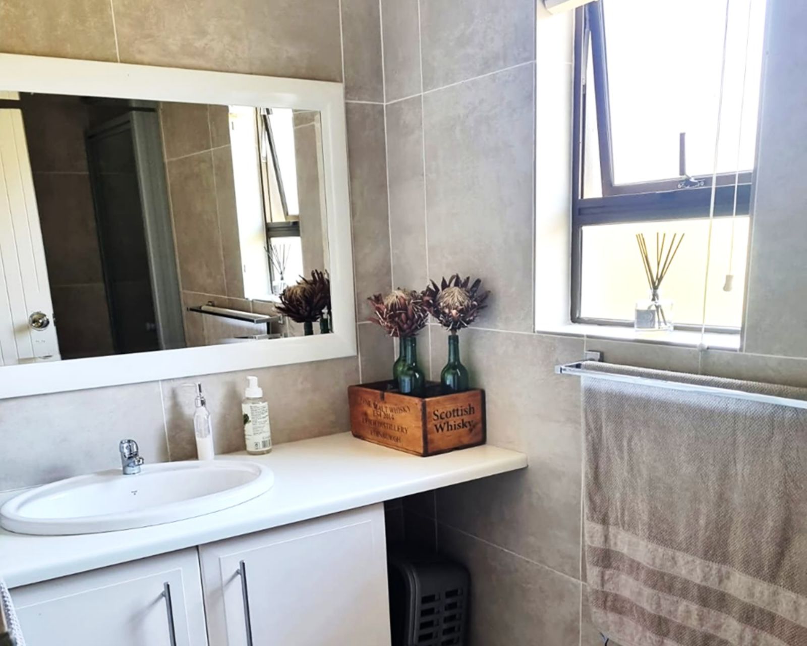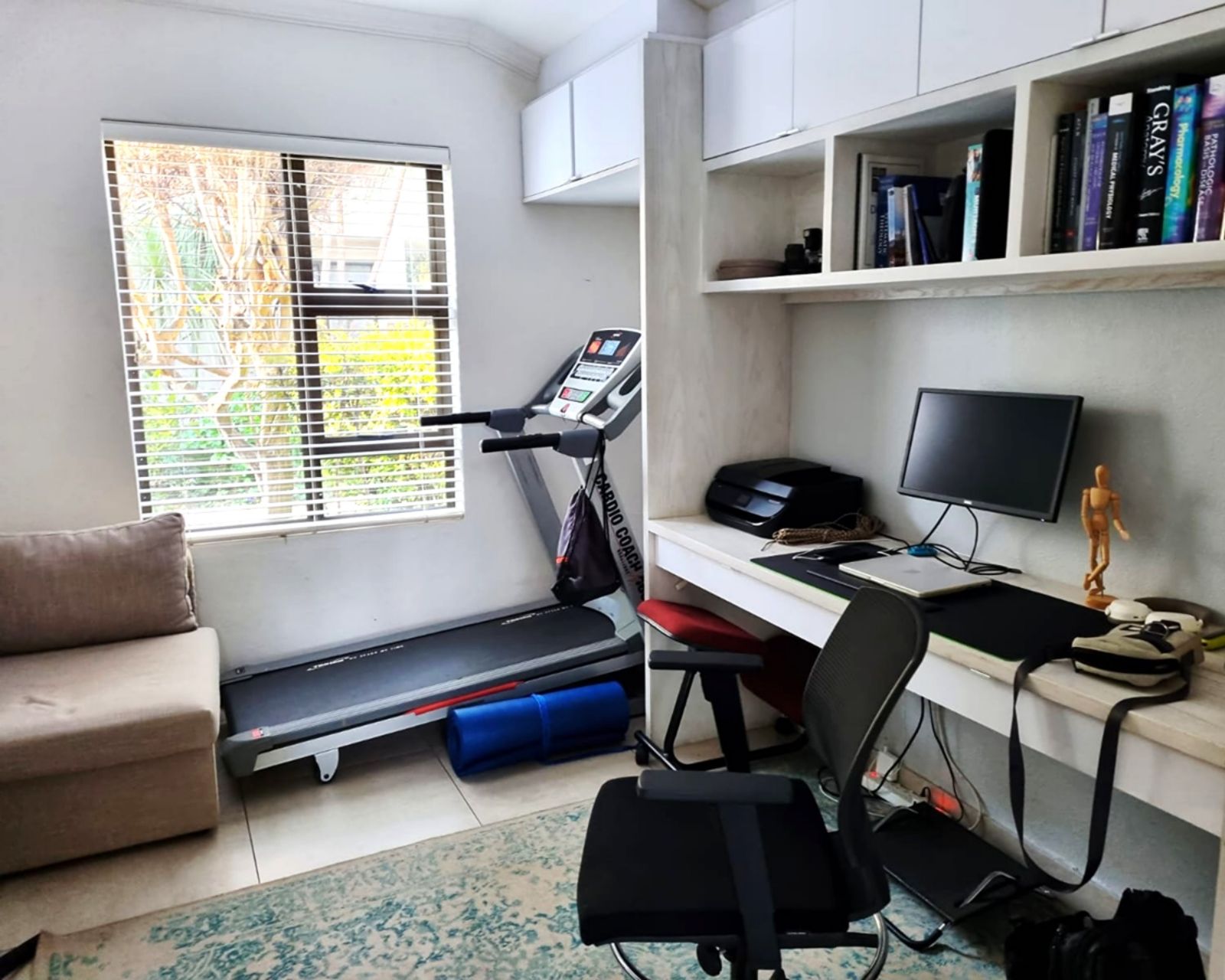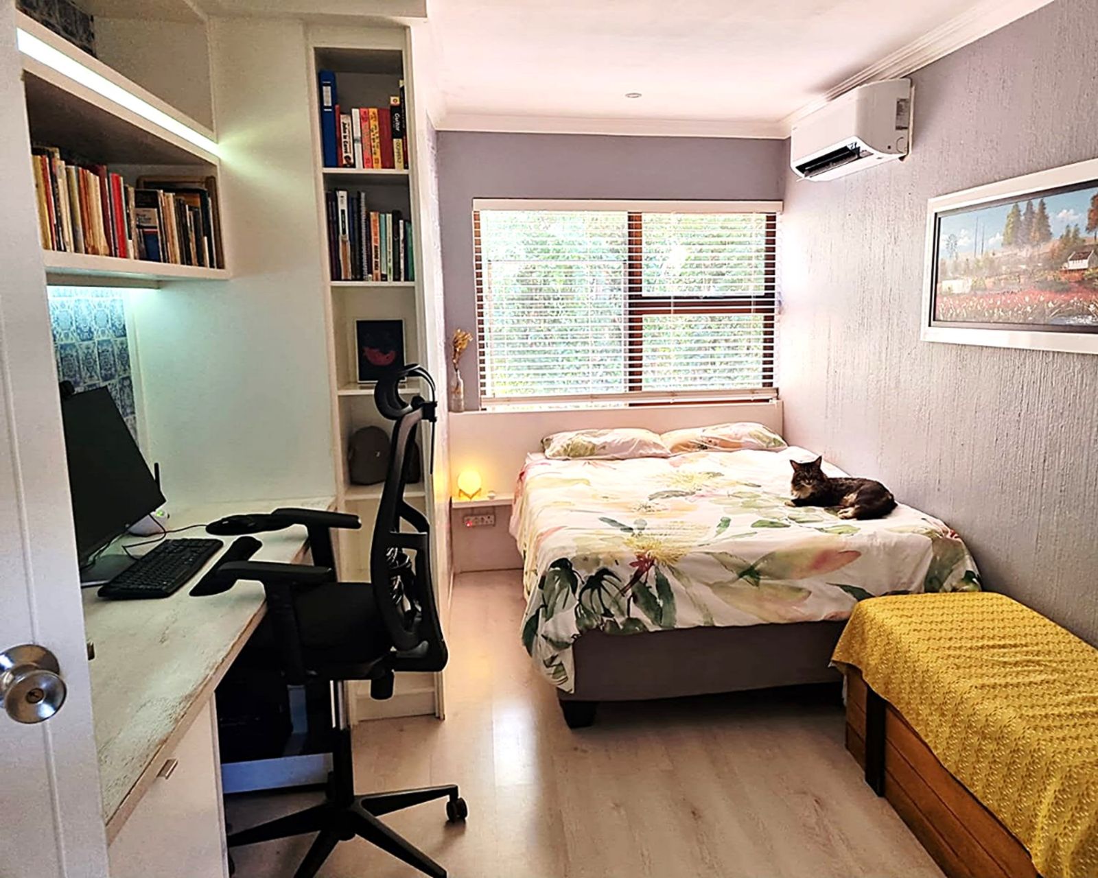 This is a modern 3-bedroom double story complex with a contemporary feel, open plan spaces and modern finishes that provides an abundance of storage space with plenty of cupboard space as you enter the home at the front door ideal to store yours and your guests’ shoes, hats, jackets or sports equipment. This incredible home features air-conditioned rooms with built-in cupboards, wooden flooring and an abundance of natural light. Each room has quality custom blinds, so no curtains are needed. There are two bedrooms upstairs, the main bedroom and 2nd bedroom is en-suite, while the second bedroom has a built-in bookshelf and built-in desk with cabinets. As you make your way downstairs you are welcomed by a third bedroom that has been converted into an office space and consists of a built-in table with bookshelf on the top as well as built-in cupboards so one can use this as bedroom that can accommodate a double bed, or if you have kids and would like to add bunk beds.